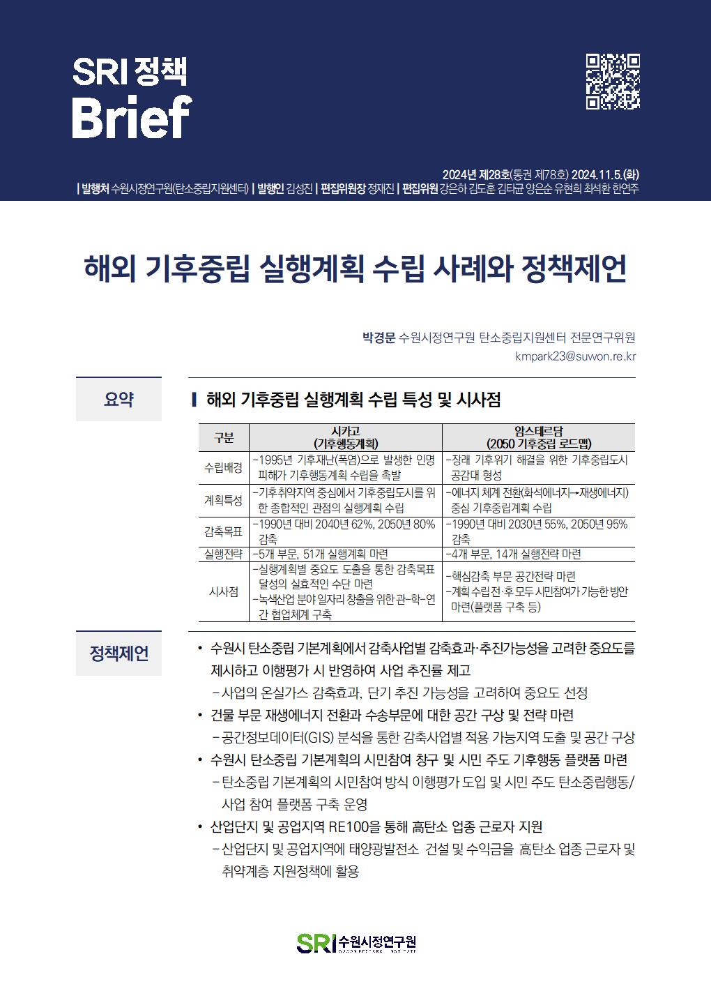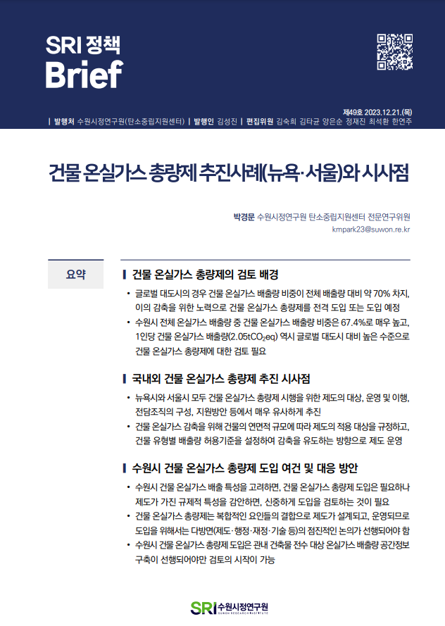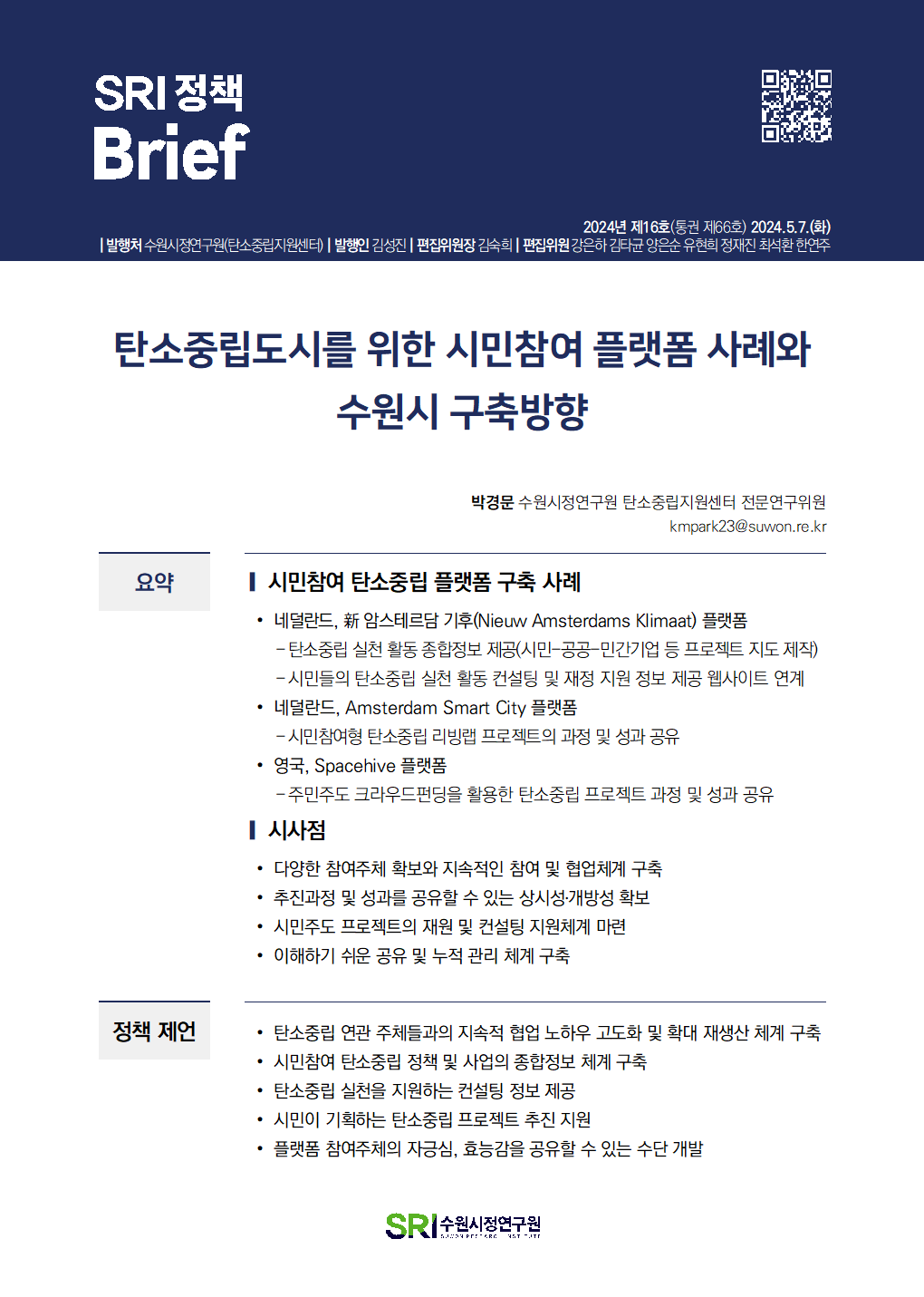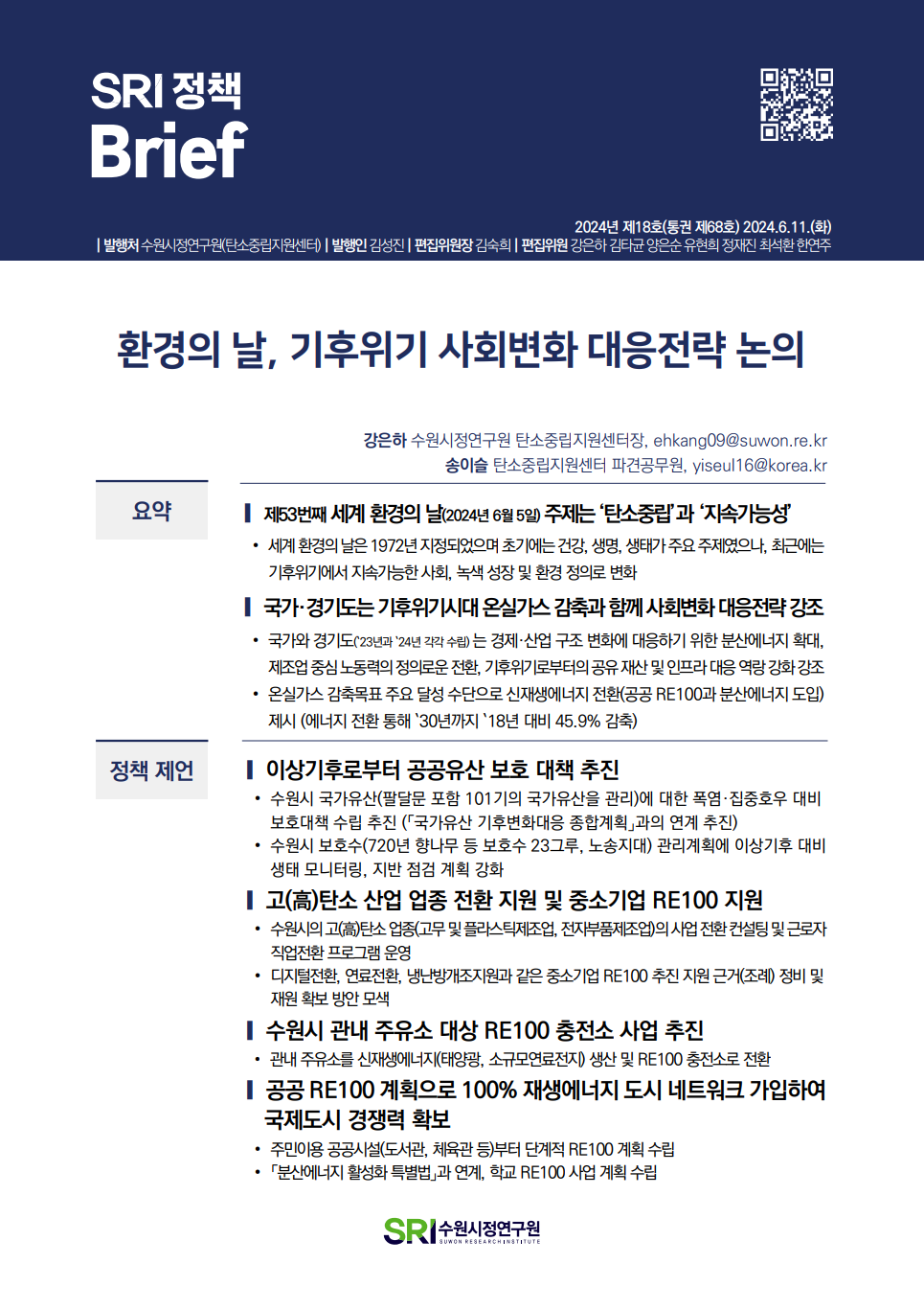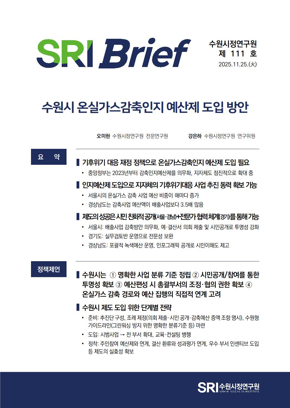 공지사항 2025 지구로운 모임 성과공유회 개최 2025-10-20 2025년 지구로운 모임 지원사업 선정결과 공고 2025-07-01 2025년 지구로운 모임 지원사업 공고 2025-06-11 수원시 탄소중립 녹색성장 기본계획(안) 공청회 개최 2025-03-05 주요일정 23 MAY 제1차 수원시 탄소중립 녹색성장 기본계획 관계부서 교육 수원청년지원센터 25 MAY 2025 지구로운 모임 성과공유회 수원컨벤션센터 이벤트홀 04 MAY 지구로운 모임 지원사업 오리엔테이션 더함파크 대강의실 수원시탄소중립지원센터 동향 제1차 수원시 탄소중립 녹색성장 기본계획 관계부서 이행점검 교육 2025-12-23 2025 지구로운 모임 성과공유회 2025-10-27 VISION2035 기후위기 대전환 포럼 2025-07-28 발간물 SRI Brief SRI Brief 수원시 온실가스감축인지 예산제 도입 방안 SRI Brief 해외 기후중립 실행계획 수립 사례와 정책제언 SRI Brief 환경의 날, 기후위기 사회변화 대응전략 논의 SRI Brief 탄소중립도시를 위한 시민참여 플랫폼 사례와 수원시 구축방향 SRI Brief 수원시 건물 온실가스 배출 현황과 시사점 SRI Brief 건물 온실가스 총량제 추진사례(뉴욕·서울)와 시사점 탄소중립이야기 수원시 탄소중립 녹색성장 기본계획 2026-01-29 수원시 기후변화와 탄소중립 2026-01-29 탄소중립지원센터 SNS 바로가기