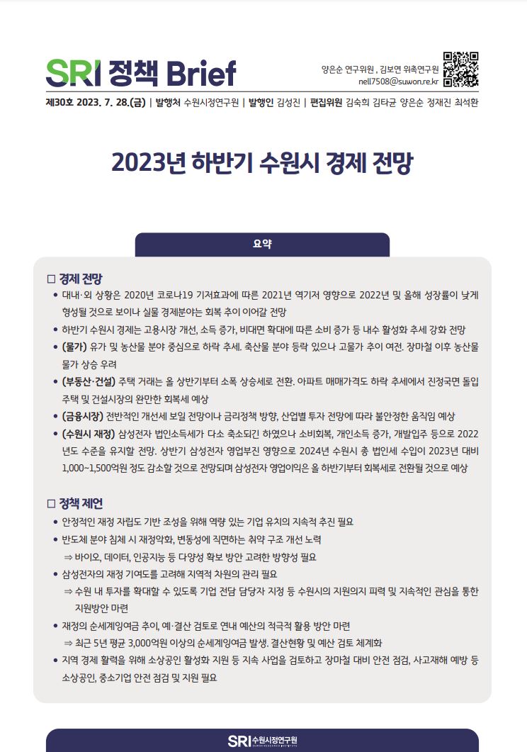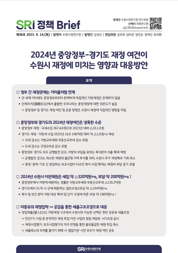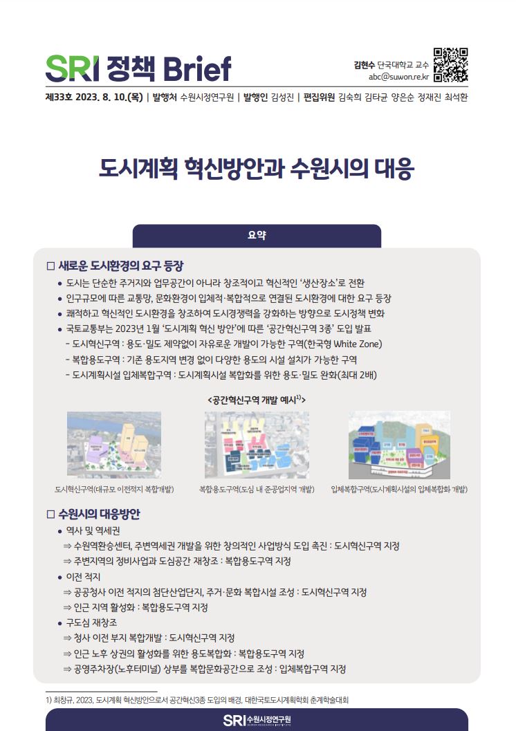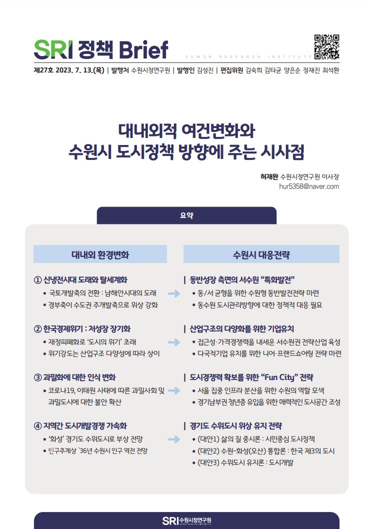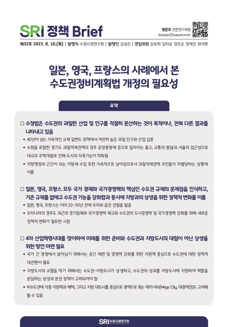 SRI Brief 학술지 「수원학연구」 수원이야기 탄소중립이야기 총 126건의 게시물이 있습니다. 게시물 검색 검색어 필수 2024년 중앙정부-경기도 재정 여건이 수원시 재정에 미치는 영향과 대응방안 부서도시경영연구실연구진정재진 연구위원발행일2023-09-14발행호수2023년 제36호 조회수433 바로보기 수원시정연구원_brief_36호-수정3.pdf 다운로드 수원시정연구원_brief_36호-수정3.pdf 수원시 규제지역 해제에 따른 부동산 시장 변화 부서한국건설산업연구원연구진김성환 부연구위원발행일2023-08-31발행호수2023년 제35호 조회수954 바로보기 수원시정연구원_brief_35호(최종-1).pdf 다운로드 수원시정연구원_brief_35호(최종-1).pdf 국내외 여건 및 사례를 통해 본 수원시 탄소중립 정책의 과제 부서도시공간연구실연구진강은하 연구위원발행일2023-08-24발행호수2023년 제34호 조회수561 바로보기 수원시정연구원_brief_34호-수정5.pdf 다운로드 수원시정연구원_brief_34호-수정5.pdf 일본, 영국, 프랑스의 사례에서 본 수도권정비계획법 개정의 필요성 부서도시경영연구실연구진정문호 전문연구위원발행일2023-08-10발행호수2023년 제32호 조회수505 바로보기 수원시정연구원_brief_32호.pdf 다운로드 수원시정연구원_brief_32호.pdf 도시계획 혁신방안과 수원시의 대응 부서단국대학교연구진김현수 교수발행일2023-08-10발행호수2023년 제33호 조회수485 바로보기 230810 수원시정연구원_brief_33호_최종.pdf 다운로드 230810 수원시정연구원_brief_33호_최종.pdf 청년층은 수원시 어디에 머물고 어디에서 소비하는가? 부서도시공간연구실연구진허경재 연구위원발행일2023-07-28발행호수2023년 제31호 조회수623 바로보기 수원시정연구원_brief_31호 최종.pdf 다운로드 수원시정연구원_brief_31호 최종.pdf 2023년 하반기 수원시 경제 전망 부서도시경영연구실연구진양은순 연구위원발행일2023-07-28발행호수2023년 제30호 조회수626 바로보기 수원시정연구원_brief_30호-수정5.pdf 다운로드 수원시정연구원_brief_30호-수정5.pdf "생태교통 수원 2013", 과거와 현재 부서도시공간연구실연구진김숙희 선임연구위원발행일2023-07-21발행호수2023년 제29호 조회수420 바로보기 수원시정연구원_brief_29호 최종.pdf 다운로드 수원시정연구원_brief_29호 최종.pdf 지방분권정책 환경변화와 대응 부서도시경영연구실연구진박상우 선임연구위원발행일2023-07-21발행호수2023년 제28호 조회수373 바로보기 수원시정연구원_brief_28호_230726_최종★.pdf 다운로드 수원시정연구원_brief_28호_230726_최종★.pdf 대내외적 여건변화와 수원시 도시정책 방향에 주는 시사점 부서수원시정연구원연구진허재완 이사장발행일2023-07-13발행호수2023년 제27호 조회수481 바로보기 수원시정연구원_brief_27호-최종.pdf 다운로드 수원시정연구원_brief_27호-최종.pdf 처음 1페이지 2페이지 3페이지 4페이지 5페이지 6페이지 7페이지 8페이지 9페이지 열린10페이지 다음 맨끝