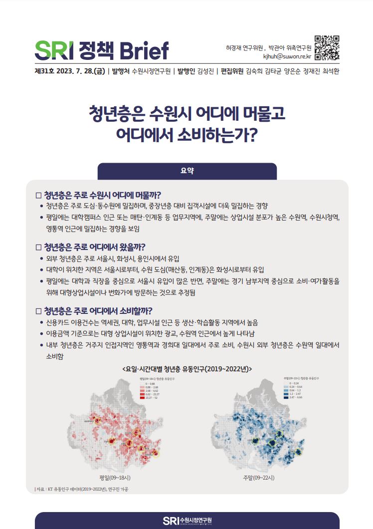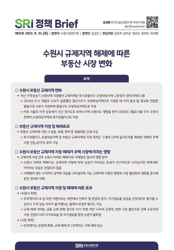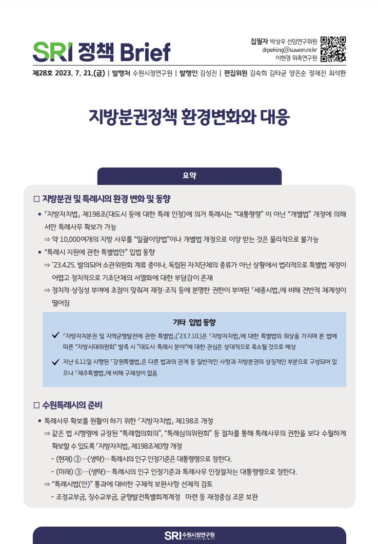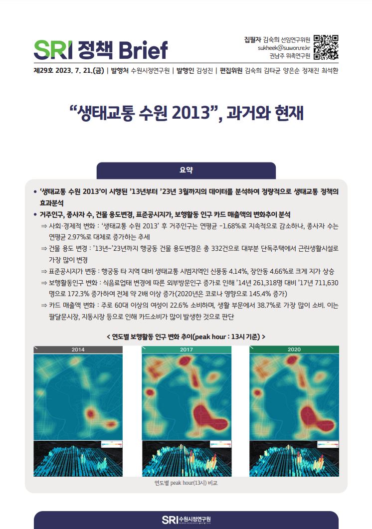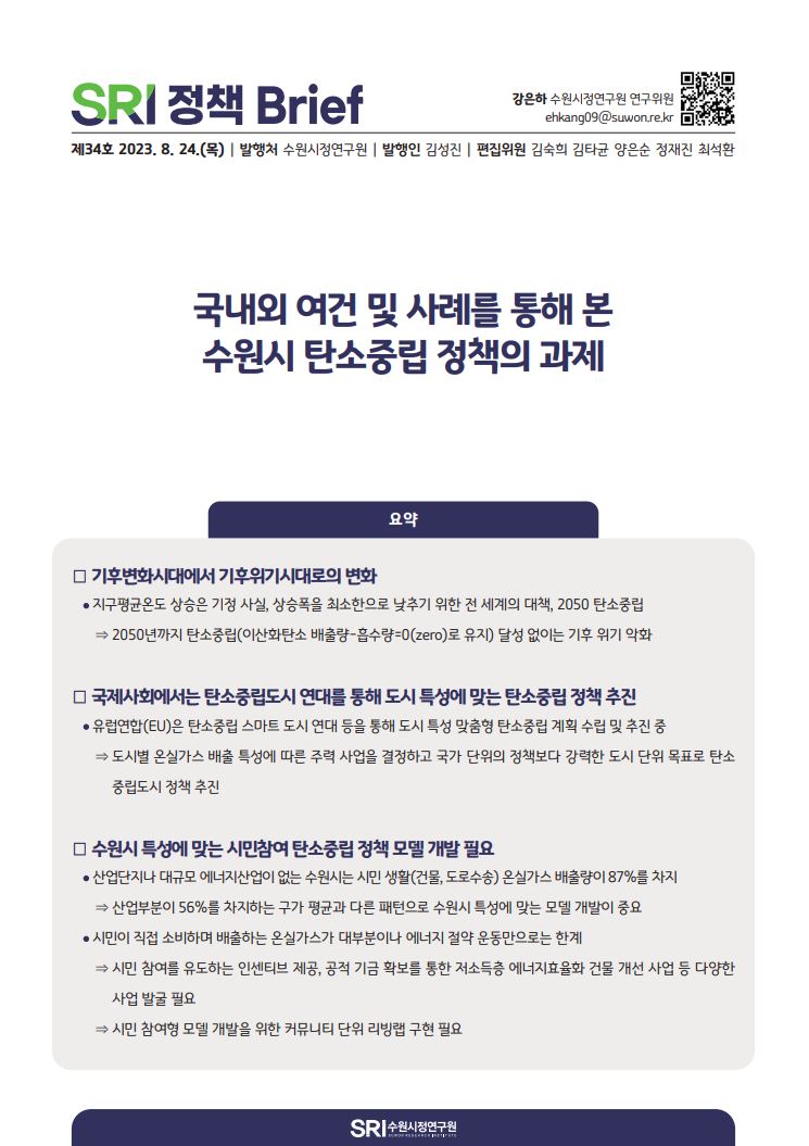 SRI Brief 학술지 「수원학연구」 수원이야기 탄소중립이야기 총 126건의 게시물이 있습니다. 게시물 검색 검색어 필수 2024년 중앙정부-경기도 재정 여건이 수원시 재정에 미치는 영향과 대응방안 부서도시경영연구실연구진정재진 연구위원발행일2023-09-14발행호수2023년 제36호 조회수433 바로보기 수원시정연구원_brief_36호-수정3.pdf 다운로드 수원시정연구원_brief_36호-수정3.pdf 수원시 규제지역 해제에 따른 부동산 시장 변화 부서한국건설산업연구원연구진김성환 부연구위원발행일2023-08-31발행호수2023년 제35호 조회수954 바로보기 수원시정연구원_brief_35호(최종-1).pdf 다운로드 수원시정연구원_brief_35호(최종-1).pdf 국내외 여건 및 사례를 통해 본 수원시 탄소중립 정책의 과제 부서도시공간연구실연구진강은하 연구위원발행일2023-08-24발행호수2023년 제34호 조회수561 바로보기 수원시정연구원_brief_34호-수정5.pdf 다운로드 수원시정연구원_brief_34호-수정5.pdf 일본, 영국, 프랑스의 사례에서 본 수도권정비계획법 개정의 필요성 부서도시경영연구실연구진정문호 전문연구위원발행일2023-08-10발행호수2023년 제32호 조회수505 바로보기 수원시정연구원_brief_32호.pdf 다운로드 수원시정연구원_brief_32호.pdf 도시계획 혁신방안과 수원시의 대응 부서단국대학교연구진김현수 교수발행일2023-08-10발행호수2023년 제33호 조회수485 바로보기 230810 수원시정연구원_brief_33호_최종.pdf 다운로드 230810 수원시정연구원_brief_33호_최종.pdf 청년층은 수원시 어디에 머물고 어디에서 소비하는가? 부서도시공간연구실연구진허경재 연구위원발행일2023-07-28발행호수2023년 제31호 조회수623 바로보기 수원시정연구원_brief_31호 최종.pdf 다운로드 수원시정연구원_brief_31호 최종.pdf 2023년 하반기 수원시 경제 전망 부서도시경영연구실연구진양은순 연구위원발행일2023-07-28발행호수2023년 제30호 조회수626 바로보기 수원시정연구원_brief_30호-수정5.pdf 다운로드 수원시정연구원_brief_30호-수정5.pdf "생태교통 수원 2013", 과거와 현재 부서도시공간연구실연구진김숙희 선임연구위원발행일2023-07-21발행호수2023년 제29호 조회수420 바로보기 수원시정연구원_brief_29호 최종.pdf 다운로드 수원시정연구원_brief_29호 최종.pdf 지방분권정책 환경변화와 대응 부서도시경영연구실연구진박상우 선임연구위원발행일2023-07-21발행호수2023년 제28호 조회수373 바로보기 수원시정연구원_brief_28호_230726_최종★.pdf 다운로드 수원시정연구원_brief_28호_230726_최종★.pdf 대내외적 여건변화와 수원시 도시정책 방향에 주는 시사점 부서수원시정연구원연구진허재완 이사장발행일2023-07-13발행호수2023년 제27호 조회수481 바로보기 수원시정연구원_brief_27호-최종.pdf 다운로드 수원시정연구원_brief_27호-최종.pdf 처음 1페이지 2페이지 3페이지 4페이지 5페이지 6페이지 7페이지 8페이지 9페이지 열린10페이지 다음 맨끝