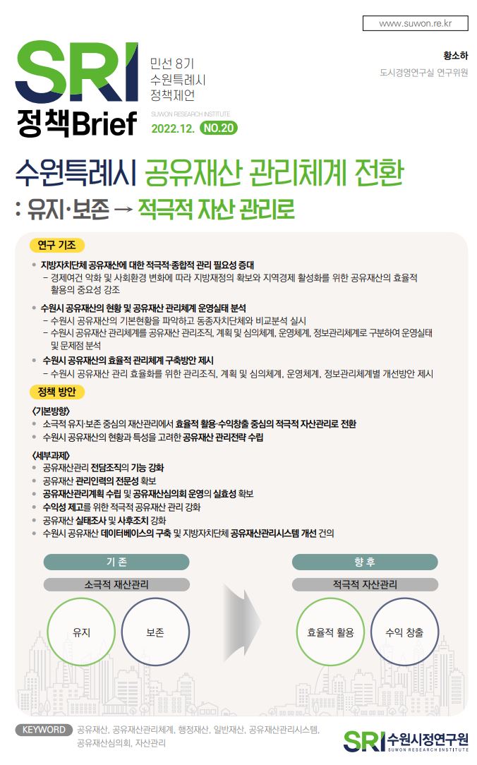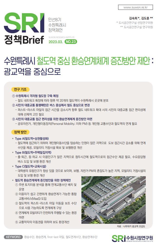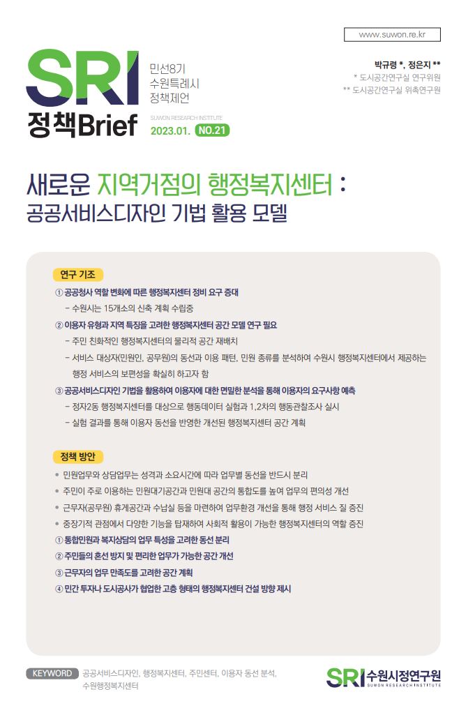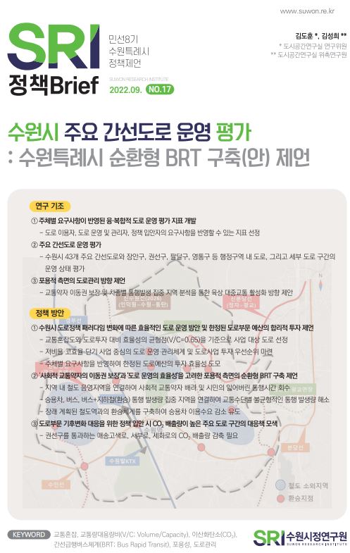 SRI Brief 학술지 「수원학연구」 수원이야기 탄소중립이야기 총 126건의 게시물이 있습니다. 게시물 검색 검색어 필수 수원의 탄소중립은 선택이 아닌 필수 부서도시공간연구실연구진최석환 연구위원발행일2023-04-07발행호수2023년 제26호 조회수659 바로보기 230407 정책Brief 제26호 최종.pdf 다운로드 230407 정책Brief 제26호 최종.pdf 다양성을 존중하는 수원, 이주민과 함께하는 행복 : 수원시 이주민 지원 실태 및 정책 방향 부서도시경영연구실연구진이영안 연구위원발행일2023-04-04발행호수2023년 제25호 조회수517 바로보기 230324 정책Brief 제25호(최종).pdf 다운로드 230324 정책Brief 제25호(최종).pdf CES 2023, 새로운 도전과 파급효과 : 기업유치를 위한 기술트렌드 변화 탐색 부서도시공간연구실연구진정수진 선임연구위원발행일2023-03-13발행호수2023년 제24호 조회수477 바로보기 정책Brief 제24호(최종).pdf 다운로드 정책Brief 제24호(최종).pdf 수원특례시 철도역 중심 환승연계체계 증진방안 제안 : 광교역을 중심으로 부서도시공간연구실연구진김숙희 선임연구위원발행일2023-03-13발행호수2023년 제23호 조회수415 바로보기 정책브리프 제23호(최종).pdf 다운로드 정책브리프 제23호(최종).pdf 서수원 역사·문화자산 탐방로 조성 계획 부서도시공간연구실연구진안국진 연구위원발행일2023-02-23발행호수2023년 제22호 조회수648 바로보기 230223 정책Brief 제22호(최종).pdf 다운로드 230223 정책Brief 제22호(최종).pdf 새로운 지역거점의 행정복지센터 : 공공서비스디자인 기법 활용 모델 부서도시공간연구실연구진박규령 연구위원발행일2023-01-31발행호수2023년 제21호 조회수639 바로보기 230131 정책Brief 제21호(최종).pdf 다운로드 230131 정책Brief 제21호(최종).pdf 수원특례시 공유재산 관리체계 전환 : 유지·보존 → 적극적 자산 관리로 부서도시경영연구실연구진황소하 연구위원발행일2022-12-26발행호수2022년 제20호 조회수520 바로보기 221226 정책Brief 제20호(최종).pdf 다운로드 221226 정책Brief 제20호(최종).pdf 민선 8기 수원특례시 재정혁신 전략 구상 : 불확실성에 대비한 적극적 재정관리 체계 구축 부서도시경영연구실연구진정재진 연구위원발행일2022-11-30발행호수2022년 제19호 조회수502 바로보기 정책Brief 제19호(최종).pdf 다운로드 정책Brief 제19호(최종).pdf 수원시 인구·가구 구조 변화에 대비한 도시정책 구상 부서도시공간연구실연구진허경재 연구위원발행일2022-10-31발행호수2022년 제18호 조회수911 바로보기 221031 정책Brief 제18호(최종).pdf 다운로드 221031 정책Brief 제18호(최종).pdf 수원시 주요 간선도로 운영 평가 : 수원특례시 순환형 BRT 구축(안) 제언 부서도시공간연구실연구진김도훈 연구위원발행일2022-09-29발행호수2022년 제17호 조회수638 바로보기 220929 정책Brief 제17호(최종).pdf 다운로드 220929 정책Brief 제17호(최종).pdf 처음 이전 열린11페이지 12페이지 13페이지 맨끝
