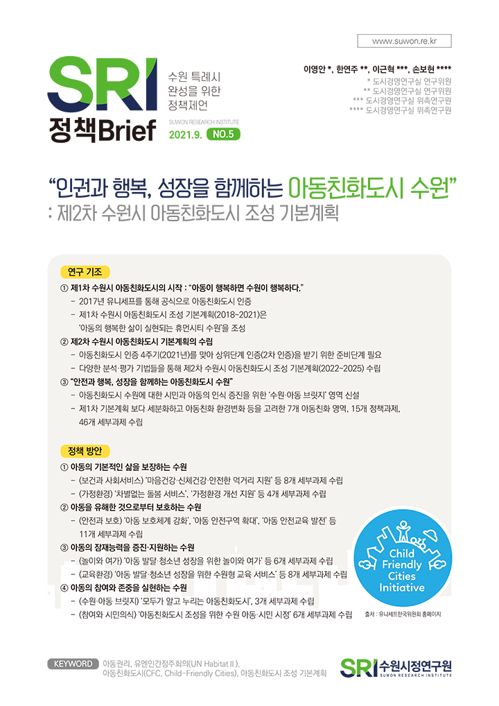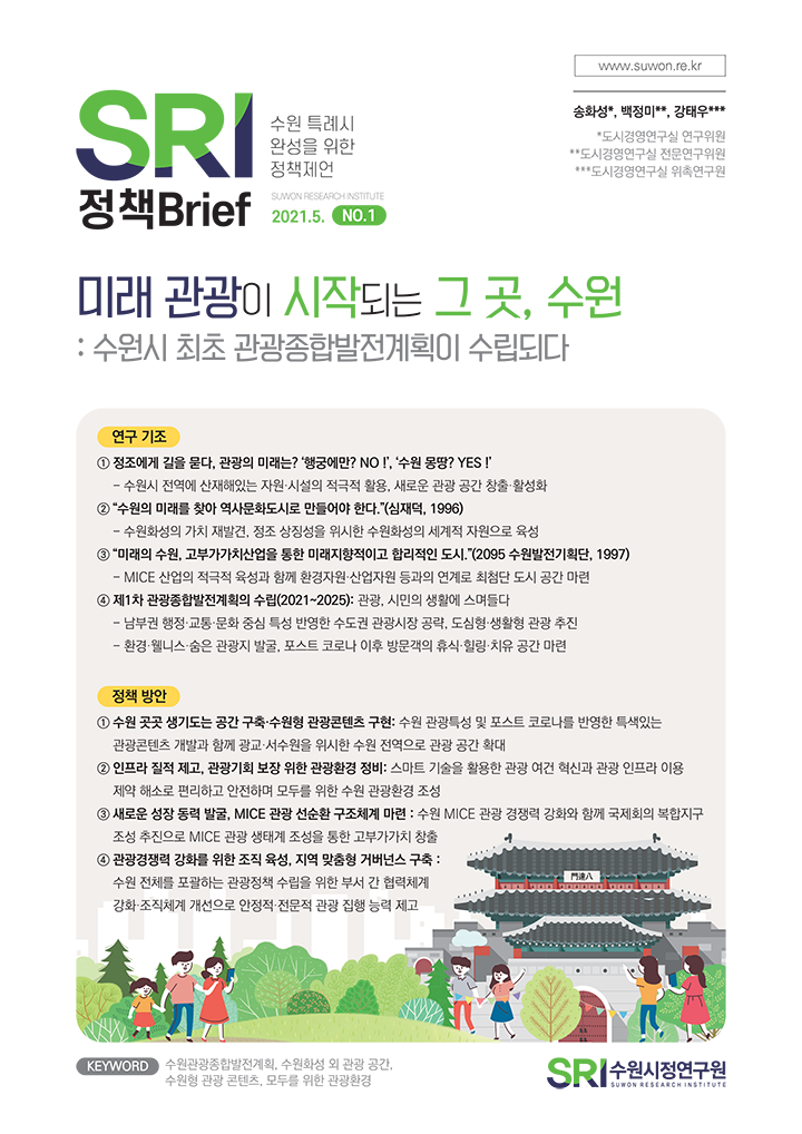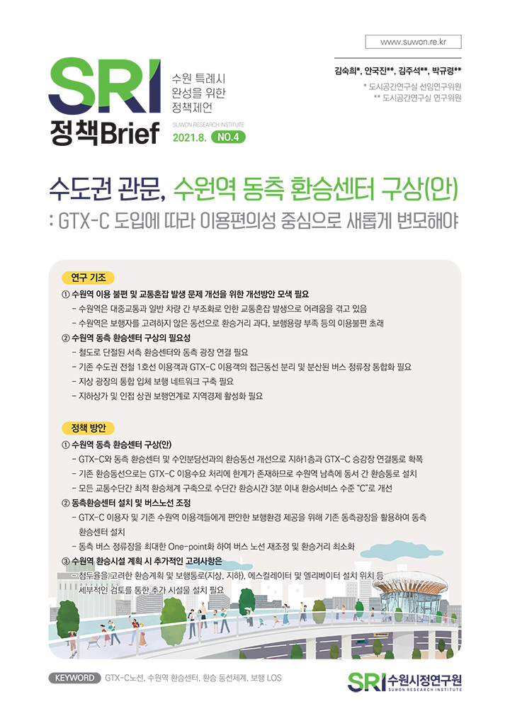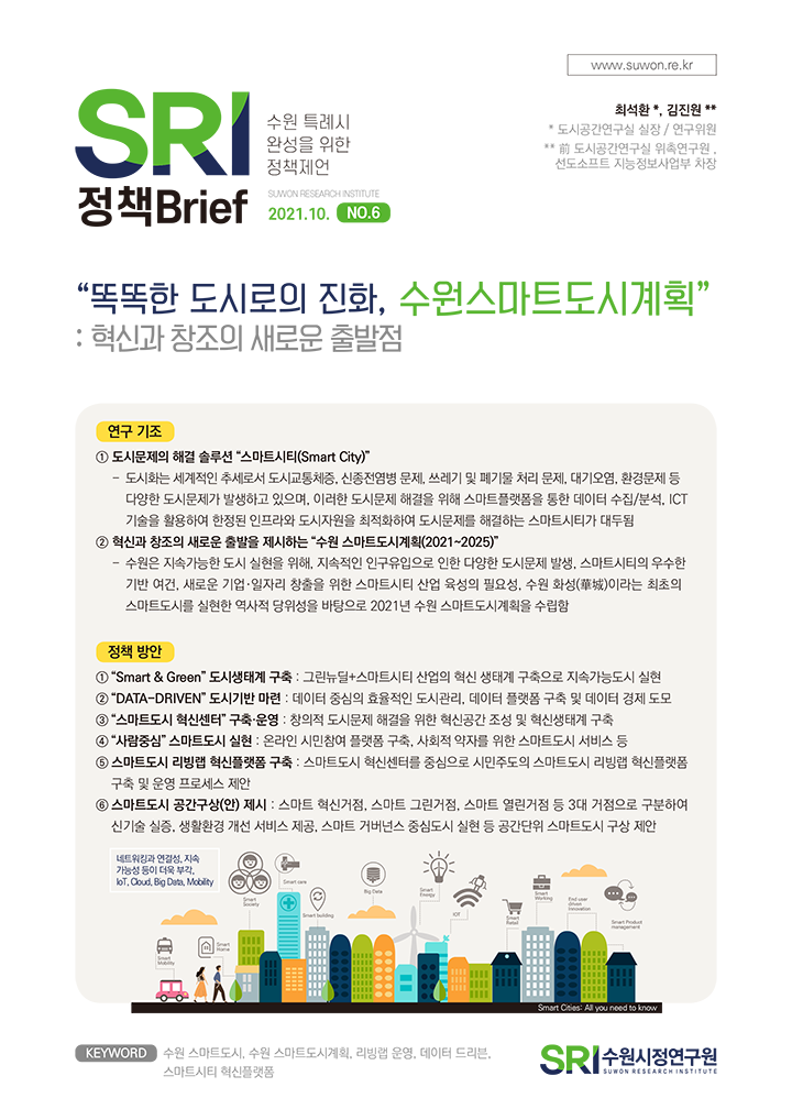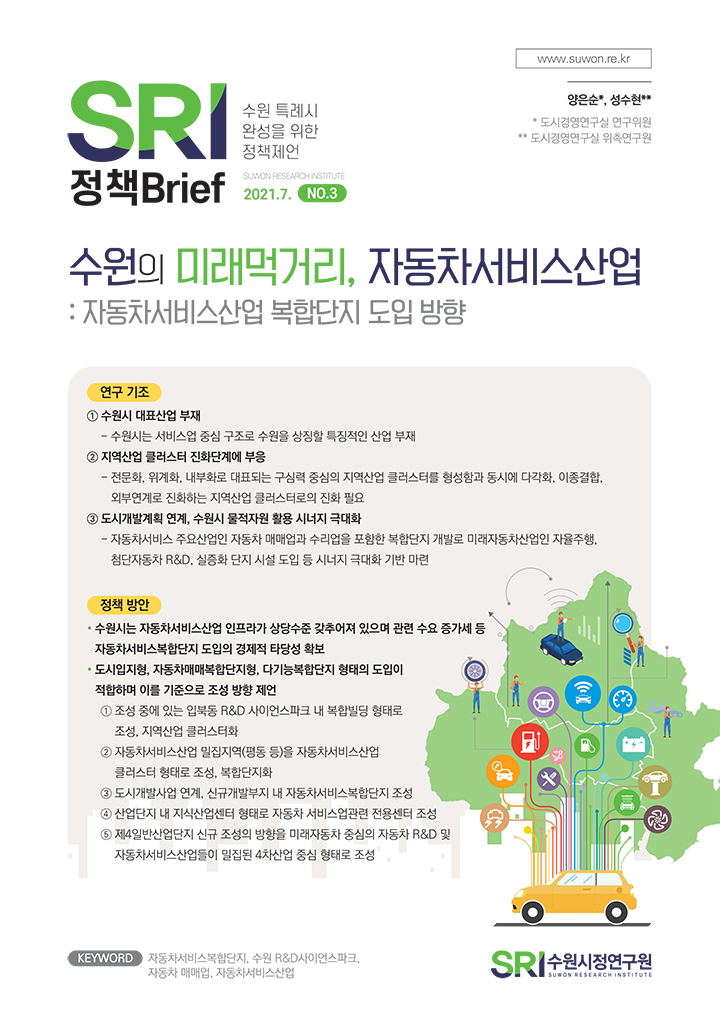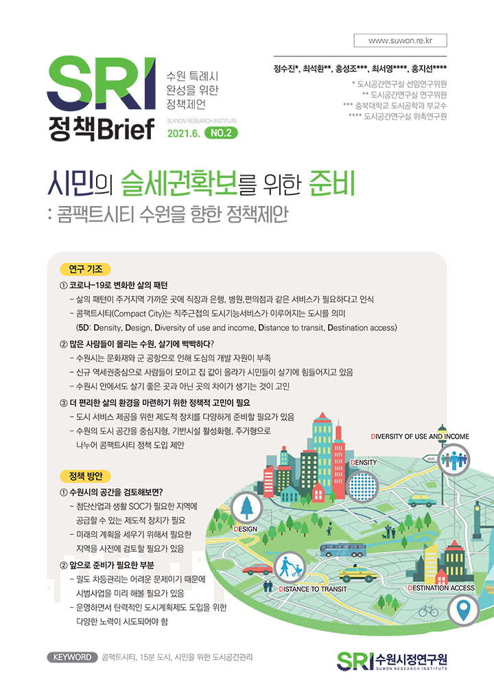 SRI Brief 학술지 「수원학연구」 수원이야기 탄소중립이야기 총 126건의 게시물이 있습니다. 게시물 검색 검색어 필수 똑똑한 도시로의 진화, 수원스마트도시계획 부서도시공간연구실연구진최석환 연구위원발행일2021-10-29발행호수2021년 제6호 조회수794 바로보기 1028 수원시정연구원_정책브리프 6호_웹용 (완전 최종).pdf 다운로드 1028 수원시정연구원_정책브리프 6호_웹용 (완전 최종).pdf 인권과 행복, 성장을 함께하는 아동친화도시 수원 부서도시경영연구실연구진이영안 연구위원발행일2021-09-28발행호수2021년 제5호 조회수814 바로보기 0928 수원시정연구원_정책브리프 5호_웹 (완전 최종).pdf 다운로드 0928 수원시정연구원_정책브리프 5호_웹 (완전 최종).pdf 수도권 관문, 수원역 동측 환승센터 구상(안) 부서도시공간연구실연구진김숙희 선임연구위원발행일2021-08-25발행호수2021년 제4호 조회수1010 바로보기 0824 정책브리프-4호_수도권 관문, 수원역 동측 환승센터 구상_p8(6) 진짜 최종.pdf 다운로드 0824 정책브리프-4호_수도권 관문, 수원역 동측 환승센터 구상_p8(6) 진짜 최종.pdf 수원의 미래먹거리, 자동차서비스산업 : 자동차서비스산업 복합단지 도입 방향 부서도시경영연구실연구진양은순 연구위원발행일2021-07-27발행호수2021년 제3호 조회수1114 바로보기 0726 1057 정책브리프_3호_수원의_미래먹거리,_자동차서비스산업_p8최종-천.pdf 다운로드 0726 1057 정책브리프_3호_수원의_미래먹거리,_자동차서비스산업_p8최종-천.pdf 시민의 슬세권확보를 위한 준비 : 콤팩트시티 수원을 향한 정책제안 부서도시공간연구실연구진정수진 선임연구위원발행일2021-06-25발행호수2021년 제2호 조회수1161 바로보기 0625 1335 정책브리프-2호_시민의 슬세권확보를 위한 준비_p8(완전최종안).pdf 다운로드 0625 1335 정책브리프-2호_시민의 슬세권확보를 위한 준비_p8(완전최종안).pdf 미래 관광이 시작되는 그곳, 수원 : 수원시 최초 관광종합발전계획이 수립되다 부서도시경영연구실연구진송화성 연구위원발행일2021-05-27발행호수2021년 제1호 조회수863 바로보기 0526 SRI정책브리프-1호_미래 관광이 시작되는 그 곳, 수원_p8(완전 최종).pdf 다운로드 0526 SRI정책브리프-1호_미래 관광이 시작되는 그 곳, 수원_p8(완전 최종).pdf 처음 이전 11페이지 12페이지 열린13페이지