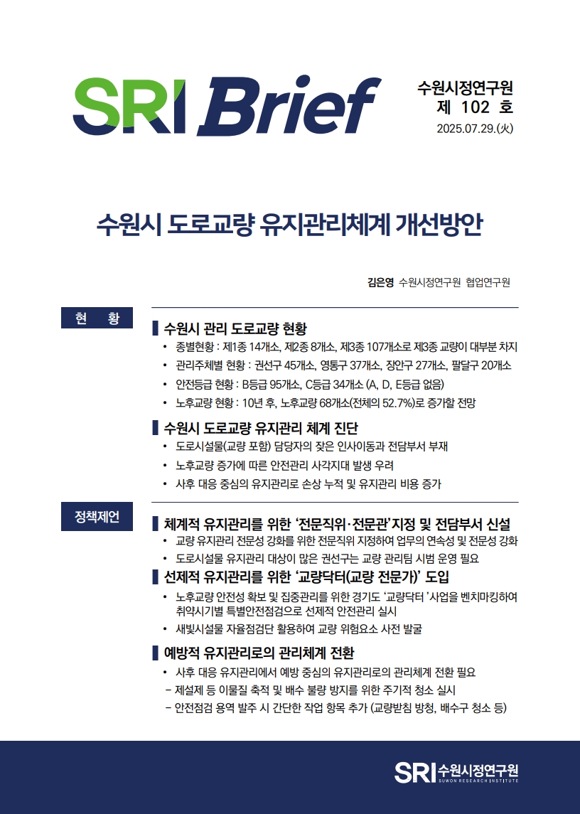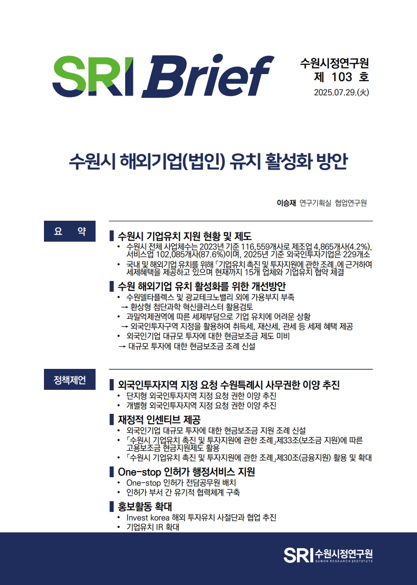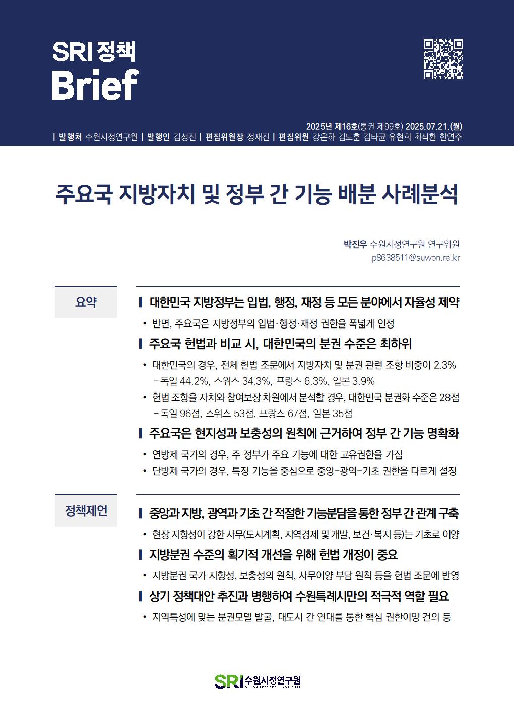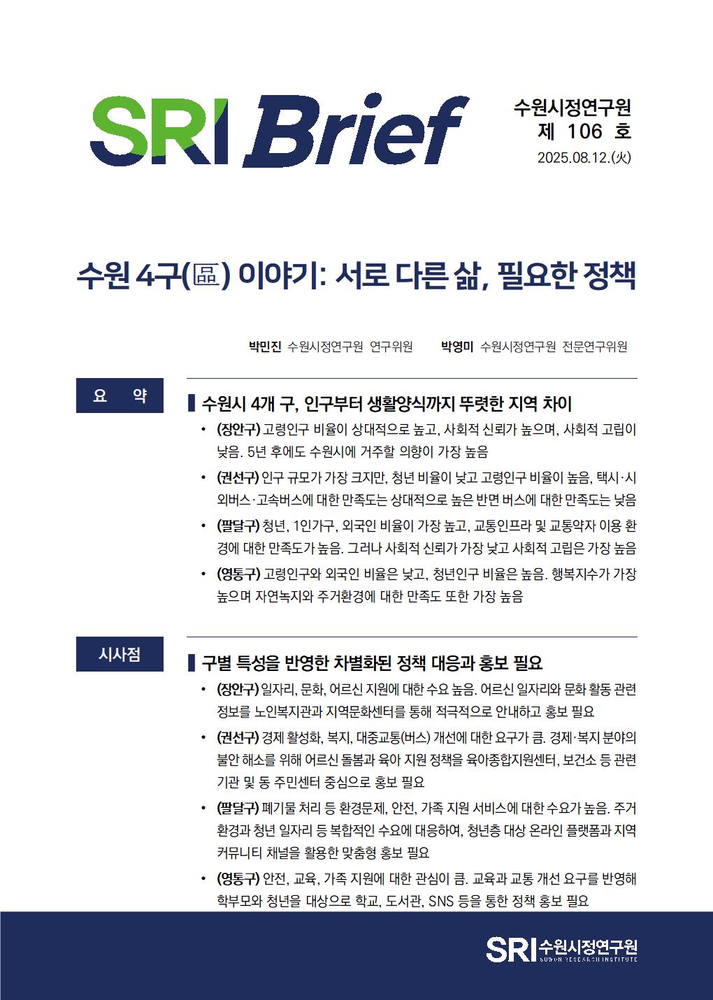 SRI Brief 학술지 「수원학연구」 수원이야기 탄소중립이야기 총 126건의 게시물이 있습니다. 게시물 검색 검색어 필수 수원 4구(區) 이야기: 서로 다른 삶, 필요한 정책 부서데이터분석센터연구진박민진, 박영미발행일2025-08-12발행호수제106호 조회수385 바로보기 수원 4구 이야기,서로 다른 삶, 필요한 정책_최종.pdf 다운로드 수원 4구 이야기,서로 다른 삶, 필요한 정책_최종.pdf AI 시대, 수원시민의 디지털 역량과 정책수요 부서데이터분석센터연구진박민진, 박영미, 정형안발행일2025-08-05발행호수제105호 조회수317 바로보기 SRI정책Brief_AI 일상화 시대, 수원시민의 디지털 역량과 정책수요.pdf 다운로드 SRI정책Brief_AI 일상화 시대, 수원시민의 디지털 역량과 정책수요.pdf 경제성장을 위한 규제개혁의 길: 중앙집권에서 지방분권으로 부서도시경영연구실연구진박진우발행일2025-08-05발행호수제104호 조회수187 바로보기 SRI brief_경제성장을 위한 규제개혁의 길.pdf 다운로드 SRI brief_경제성장을 위한 규제개혁의 길.pdf 수원시 해외기업(법인) 유치 활성화 방안 연구진이승재 협업연구원발행일2025-07-29발행호수제103호 조회수181 바로보기 정책브리프 103호_수원시해외기업법인유치활성화방안.pdf 다운로드 정책브리프 103호_수원시해외기업법인유치활성화방안.pdf 수원시 도로교량 유지관리체계 개선방안 연구진김은영 협업연구원발행일2025-07-29발행호수제102호 조회수179 바로보기 정책브리프 102호_수원시도로교량유지관리체계개선방안.pdf 다운로드 정책브리프 102호_수원시도로교량유지관리체계개선방안.pdf 2025년 하반기 경제 전망 부서도시경영연구실연구진양은순, 임채실발행일2025-07-23발행호수제101호 조회수187 바로보기 SRI brief_2025년 하반기 경제전망.pdf 다운로드 SRI brief_2025년 하반기 경제전망.pdf 수원 미래도시 전략 및 대응 방안 연구진김승겸 카이스트 문술미래전략대학원 교수발행일2025-07-22발행호수제100호 조회수219 바로보기 수원시정연구원 SRI Brief_수원 미래도시 전략 및 대응 방안.pdf 다운로드 수원시정연구원 SRI Brief_수원 미래도시 전략 및 대응 방안.pdf 주요국 지방자치 및 정부 간 기능 배분 사례분석 부서도시경영연구실연구진박진우발행일2025-07-21발행호수2025년 제16호(통권 제99호) 조회수128 바로보기 SRI정책Brief_주요국 지방자치 및 정부 간 기능 배분 사례분석.pdf 다운로드 SRI정책Brief_주요국 지방자치 및 정부 간 기능 배분 사례분석.pdf 수원시 교통사고다발지점 개선방안 부서데이터분석센터연구진김도훈, 정가형, 이지원발행일2025-07-18발행호수2025년 제15호(통권 제98호) 조회수93 바로보기 SRI정책Brief_수원시 교통사고다발지점 개선방안.pdf 다운로드 SRI정책Brief_수원시 교통사고다발지점 개선방안.pdf 전세사기,수원에서왜자주발생하는가? 부서도시공간연구실연구진김진언, 김진희발행일2025-07-16발행호수2025년 제14호(통권 제97호) 조회수157 바로보기 정책브리프 전세사기, 수원에서 왜 자주 발생하는가.pdf 다운로드 정책브리프 전세사기, 수원에서 왜 자주 발생하는가.pdf 처음 1페이지 2페이지 열린3페이지 4페이지 5페이지 6페이지 7페이지 8페이지 9페이지 10페이지 다음 맨끝