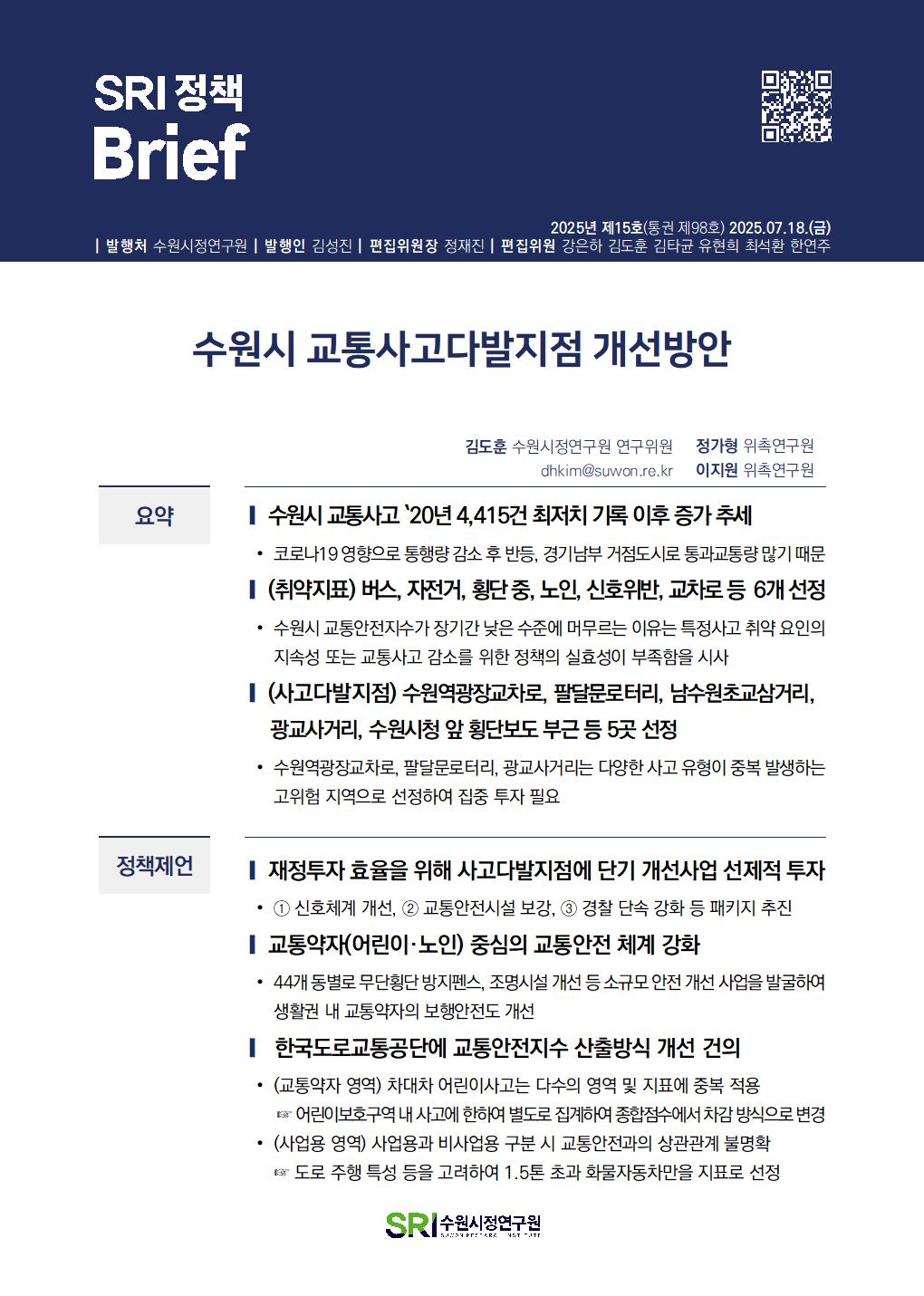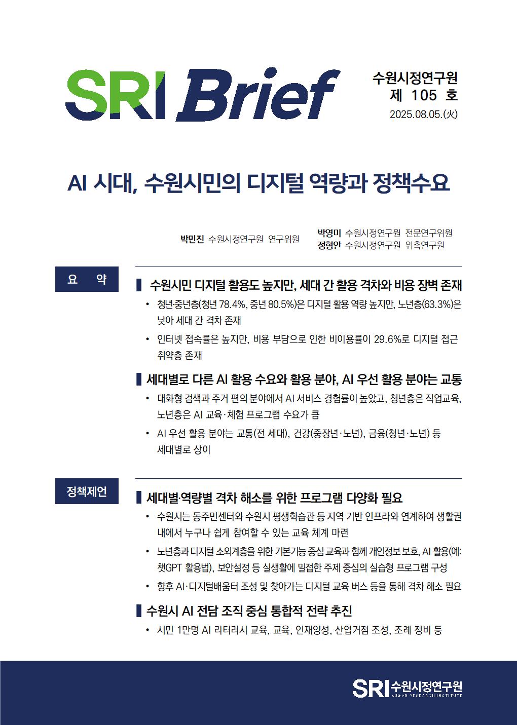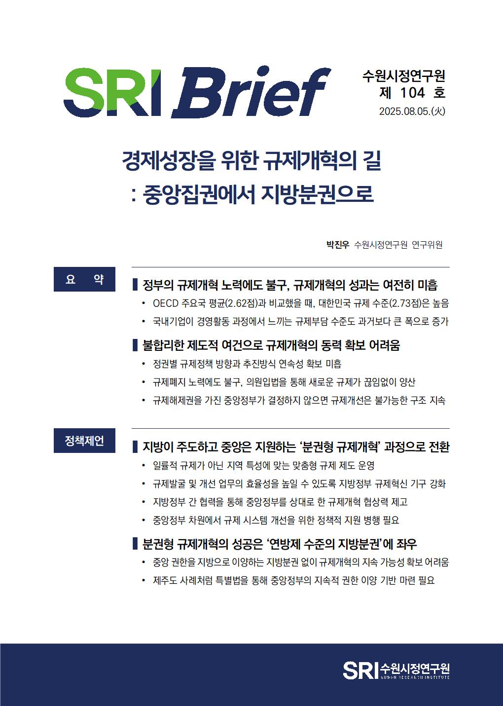 SRI Brief 학술지 「수원학연구」 수원이야기 탄소중립이야기 총 126건의 게시물이 있습니다. 게시물 검색 검색어 필수 수원 4구(區) 이야기: 서로 다른 삶, 필요한 정책 부서데이터분석센터연구진박민진, 박영미발행일2025-08-12발행호수제106호 조회수385 바로보기 수원 4구 이야기,서로 다른 삶, 필요한 정책_최종.pdf 다운로드 수원 4구 이야기,서로 다른 삶, 필요한 정책_최종.pdf AI 시대, 수원시민의 디지털 역량과 정책수요 부서데이터분석센터연구진박민진, 박영미, 정형안발행일2025-08-05발행호수제105호 조회수317 바로보기 SRI정책Brief_AI 일상화 시대, 수원시민의 디지털 역량과 정책수요.pdf 다운로드 SRI정책Brief_AI 일상화 시대, 수원시민의 디지털 역량과 정책수요.pdf 경제성장을 위한 규제개혁의 길: 중앙집권에서 지방분권으로 부서도시경영연구실연구진박진우발행일2025-08-05발행호수제104호 조회수187 바로보기 SRI brief_경제성장을 위한 규제개혁의 길.pdf 다운로드 SRI brief_경제성장을 위한 규제개혁의 길.pdf 수원시 해외기업(법인) 유치 활성화 방안 연구진이승재 협업연구원발행일2025-07-29발행호수제103호 조회수181 바로보기 정책브리프 103호_수원시해외기업법인유치활성화방안.pdf 다운로드 정책브리프 103호_수원시해외기업법인유치활성화방안.pdf 수원시 도로교량 유지관리체계 개선방안 연구진김은영 협업연구원발행일2025-07-29발행호수제102호 조회수179 바로보기 정책브리프 102호_수원시도로교량유지관리체계개선방안.pdf 다운로드 정책브리프 102호_수원시도로교량유지관리체계개선방안.pdf 2025년 하반기 경제 전망 부서도시경영연구실연구진양은순, 임채실발행일2025-07-23발행호수제101호 조회수187 바로보기 SRI brief_2025년 하반기 경제전망.pdf 다운로드 SRI brief_2025년 하반기 경제전망.pdf 수원 미래도시 전략 및 대응 방안 연구진김승겸 카이스트 문술미래전략대학원 교수발행일2025-07-22발행호수제100호 조회수219 바로보기 수원시정연구원 SRI Brief_수원 미래도시 전략 및 대응 방안.pdf 다운로드 수원시정연구원 SRI Brief_수원 미래도시 전략 및 대응 방안.pdf 주요국 지방자치 및 정부 간 기능 배분 사례분석 부서도시경영연구실연구진박진우발행일2025-07-21발행호수2025년 제16호(통권 제99호) 조회수128 바로보기 SRI정책Brief_주요국 지방자치 및 정부 간 기능 배분 사례분석.pdf 다운로드 SRI정책Brief_주요국 지방자치 및 정부 간 기능 배분 사례분석.pdf 수원시 교통사고다발지점 개선방안 부서데이터분석센터연구진김도훈, 정가형, 이지원발행일2025-07-18발행호수2025년 제15호(통권 제98호) 조회수93 바로보기 SRI정책Brief_수원시 교통사고다발지점 개선방안.pdf 다운로드 SRI정책Brief_수원시 교통사고다발지점 개선방안.pdf 전세사기,수원에서왜자주발생하는가? 부서도시공간연구실연구진김진언, 김진희발행일2025-07-16발행호수2025년 제14호(통권 제97호) 조회수157 바로보기 정책브리프 전세사기, 수원에서 왜 자주 발생하는가.pdf 다운로드 정책브리프 전세사기, 수원에서 왜 자주 발생하는가.pdf 처음 1페이지 2페이지 열린3페이지 4페이지 5페이지 6페이지 7페이지 8페이지 9페이지 10페이지 다음 맨끝