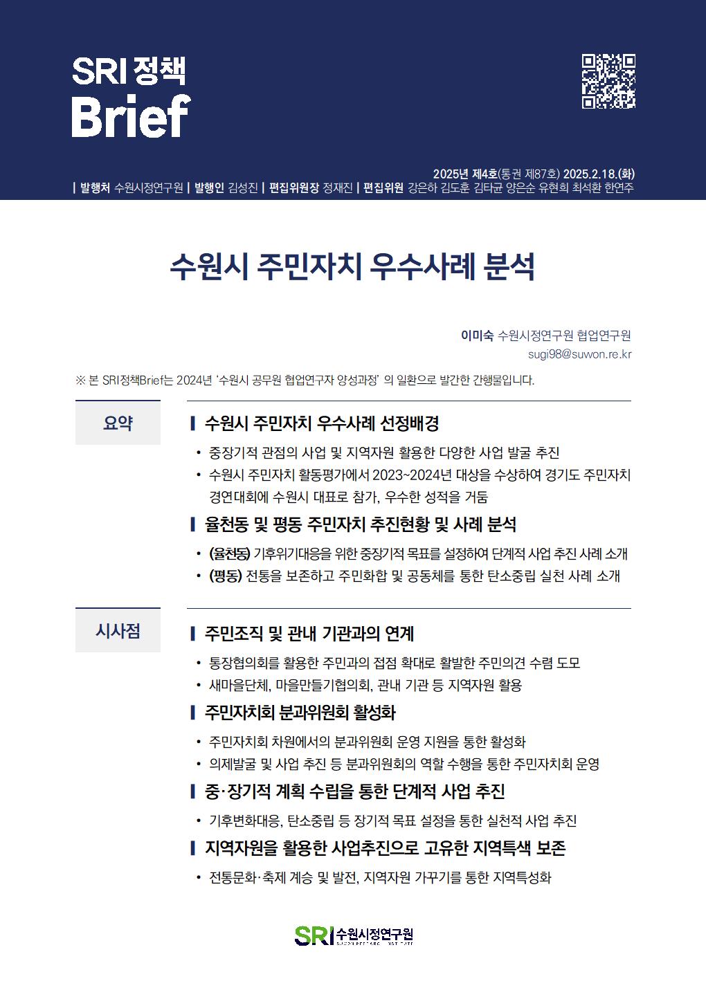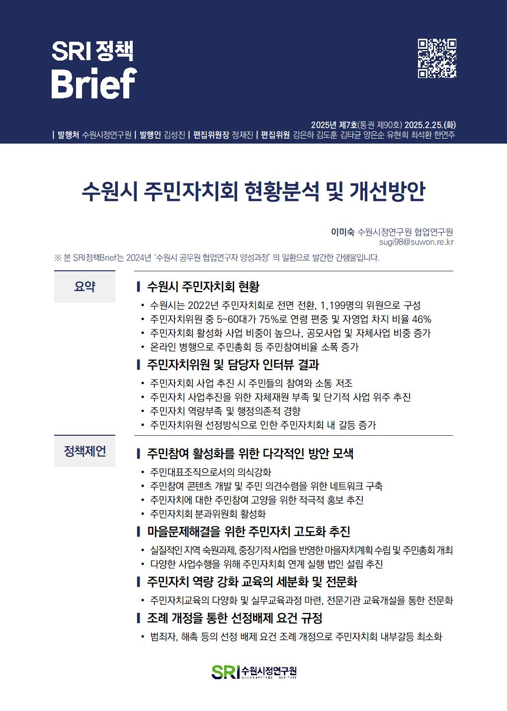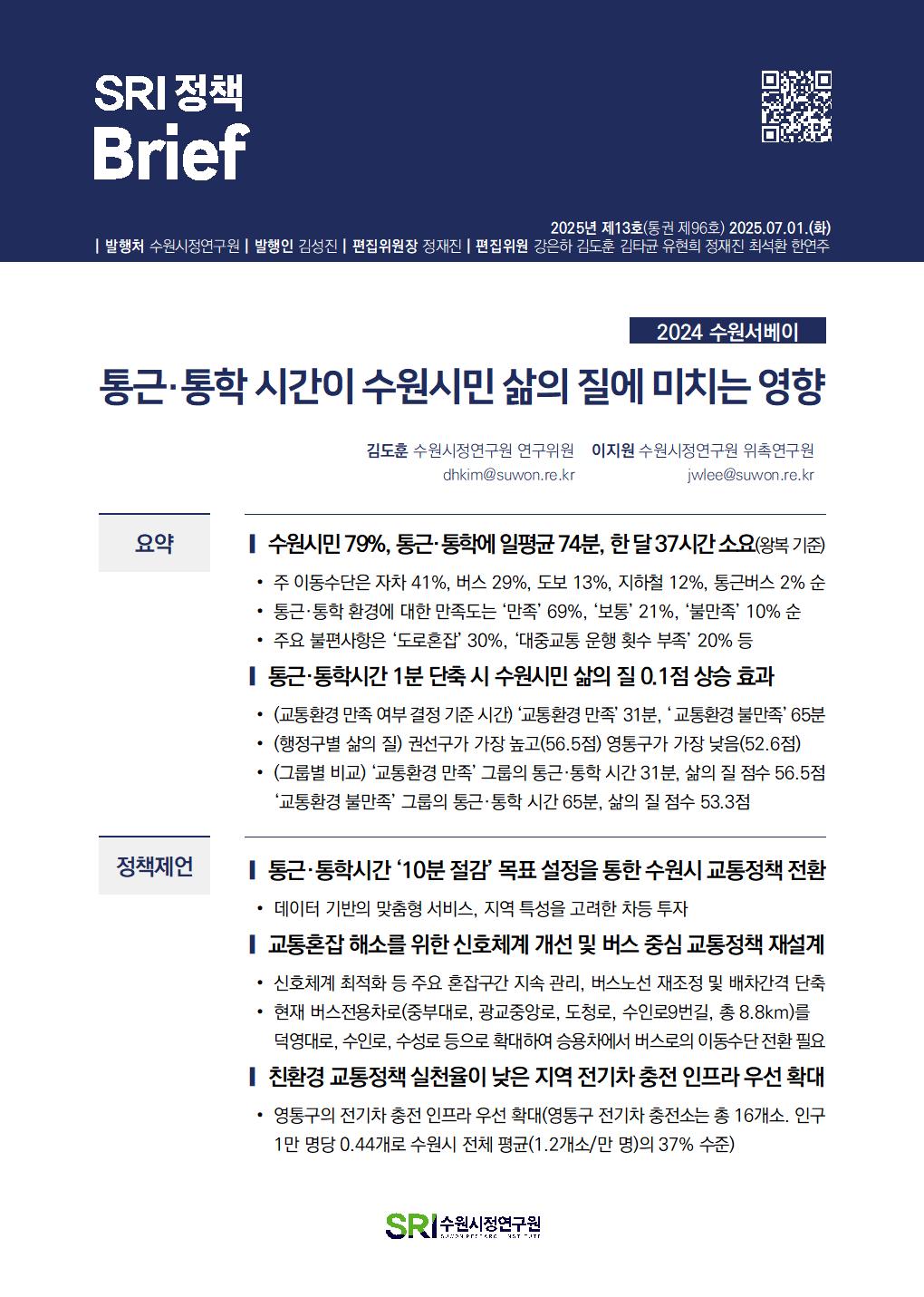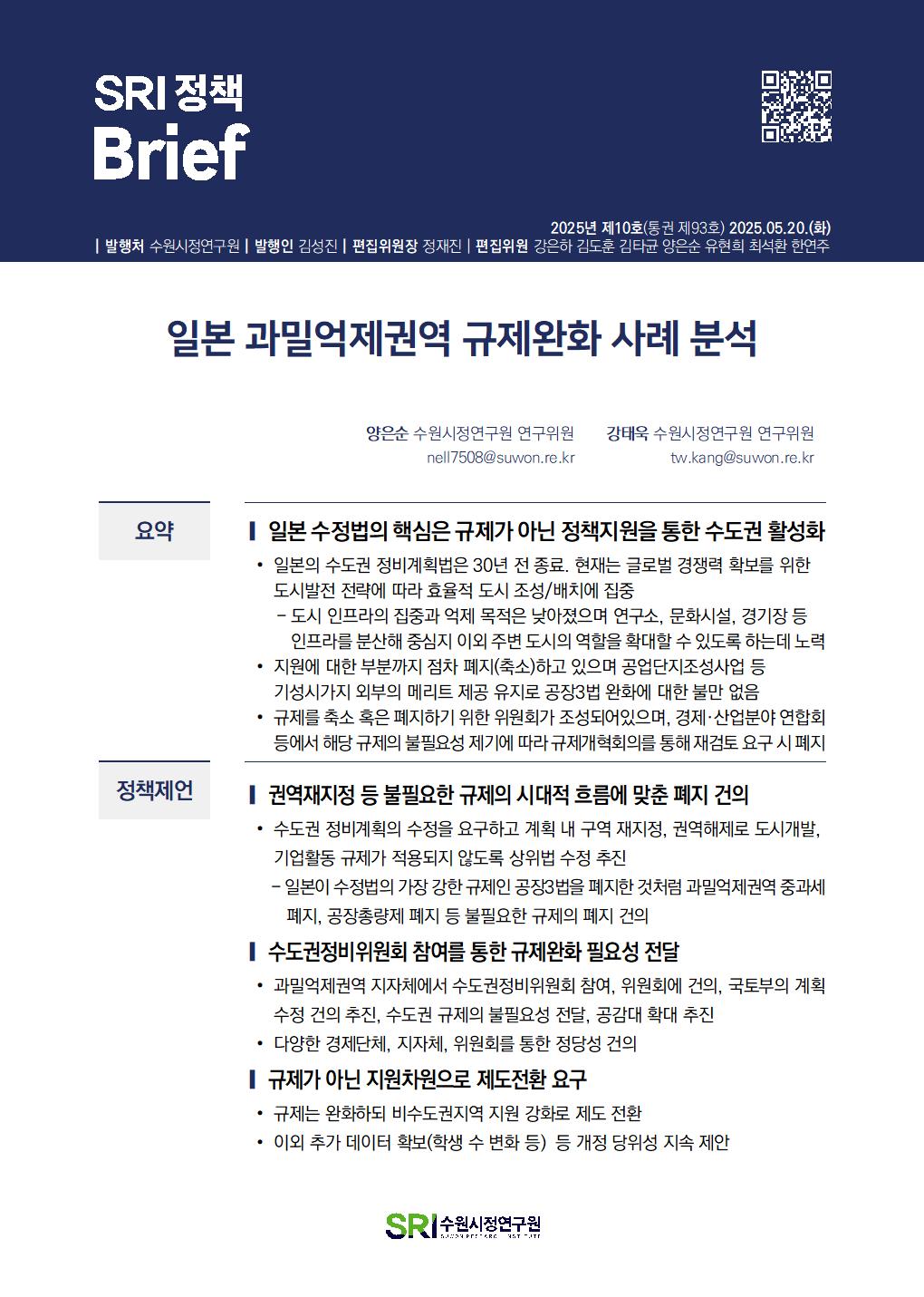 SRI Brief 학술지 「수원학연구」 수원이야기 탄소중립이야기 총 126건의 게시물이 있습니다. 게시물 검색 검색어 필수 통근·통학 시간이 수원시민 삶의 질에 미치는 영향 부서데이터분석센터연구진김도훈, 이지원발행일2025-07-01발행호수2025년 제13호(통권 제96호) 조회수190 바로보기 SRI정책Brief 통근통학 시간이 수원시민 삶의 질에 미치는 영향20250701_공개.pdf 다운로드 SRI정책Brief 통근통학 시간이 수원시민 삶의 질에 미치는 영향20250701_공개.pdf 특례시 지원 특별법안 분석 및 입법대응 방안 부서도시경영연구실연구진박진우, 정재진발행일2025-06-02발행호수2025년 제12호(통권 제95호) 조회수214 바로보기 최종SRI정책Brief_특례시 지원 특별법안 분석 및 입법대응 방안.pdf 다운로드 최종SRI정책Brief_특례시 지원 특별법안 분석 및 입법대응 방안.pdf 민선 지방자치 30년, 성찰과 제안 부서도시경영연구실연구진박진우발행일2025-05-27발행호수2025년 제11호(통권 제94호) 조회수221 바로보기 최종SRI정책Brief_민선 지방자치 30년, 성찰과 제안_수정.pdf 다운로드 최종SRI정책Brief_민선 지방자치 30년, 성찰과 제안_수정.pdf 일본 과밀억제권역 규제완화 사례 분석 부서도시경영연구실연구진양은순, 강태욱발행일2025-05-20발행호수2025년 제10호(통권 제93호) 조회수169 바로보기 최종 SRI 정책 Brief-일본 과밀억제권역 규제 완화 사례 분석.pdf 다운로드 최종 SRI 정책 Brief-일본 과밀억제권역 규제 완화 사례 분석.pdf 수원시 화물차고지 주차구획 및 운영방식 개선방안 부서연구기획실연구진오한림발행일2025-02-25발행호수2025년 제9호(통권 제92호) 조회수287 바로보기 통권제92호 SRI정책Brief_수원시 화물차고지 주차구획 및 운영방식 개선방안오한림.pdf 다운로드 통권제92호 SRI정책Brief_수원시 화물차고지 주차구획 및 운영방식 개선방안오한림.pdf 수원시립아트스페이스광교 수요분석을 통한 특성화 방안 연구 부서연구기획실연구진임수정발행일2025-02-25발행호수2025년 제8호(통권 제91호) 조회수232 바로보기 통권제91호 SRI정책Brief_수원시립아트스페이스광교 수요분석을 통한 특성화 방안연구임수정_수정.pdf 다운로드 통권제91호 SRI정책Brief_수원시립아트스페이스광교 수요분석을 통한 특성화 방안연구임수정_수정.pdf 수원시 주민자치회 현황분석 및 개선방안 부서연구기획실연구진이미숙발행일2025-02-25발행호수2025년 제7호(통권 제90호) 조회수252 바로보기 통권제90호 SRI정책Brief_수원시 주민자치회 현황분석 및 개선방안이미숙.pdf 다운로드 통권제90호 SRI정책Brief_수원시 주민자치회 현황분석 및 개선방안이미숙.pdf 수원시 화물차 불법주정차 해소를 위한 유휴공간 활용방안 부서연구기획실연구진오한림발행일2025-02-18발행호수2025년 제6호(통권 제89호) 조회수391 바로보기 통권제89호 SRI정책Brief_수원시 화물차 불법주정차 해소를 위한 유휴공간 활용방안오한림.pdf 다운로드 통권제89호 SRI정책Brief_수원시 화물차 불법주정차 해소를 위한 유휴공간 활용방안오한림.pdf 행궁지역 관광자원을 활용한 수원시립미술관 관람객 증대 방안 부서연구기획실연구진임수정발행일2025-02-18발행호수2025년 제5호(통권 제88호) 조회수209 바로보기 통권제88호 SRI정책Brief_행궁지역 관광자원을 활용한 수원시립미술관 관람객 증대방안임수정_수정.pdf 다운로드 통권제88호 SRI정책Brief_행궁지역 관광자원을 활용한 수원시립미술관 관람객 증대방안임수정_수정.pdf 수원시 주민자치 우수사례 분석 부서연구기획실연구진이미숙발행일2025-02-18발행호수2025년 제4호(통권 제87호) 조회수199 바로보기 통권제87호 SRI정책Brief_수원시 주민자치 우수사례 분석_이미숙.pdf 다운로드 통권제87호 SRI정책Brief_수원시 주민자치 우수사례 분석_이미숙.pdf 처음 1페이지 2페이지 3페이지 열린4페이지 5페이지 6페이지 7페이지 8페이지 9페이지 10페이지 다음 맨끝