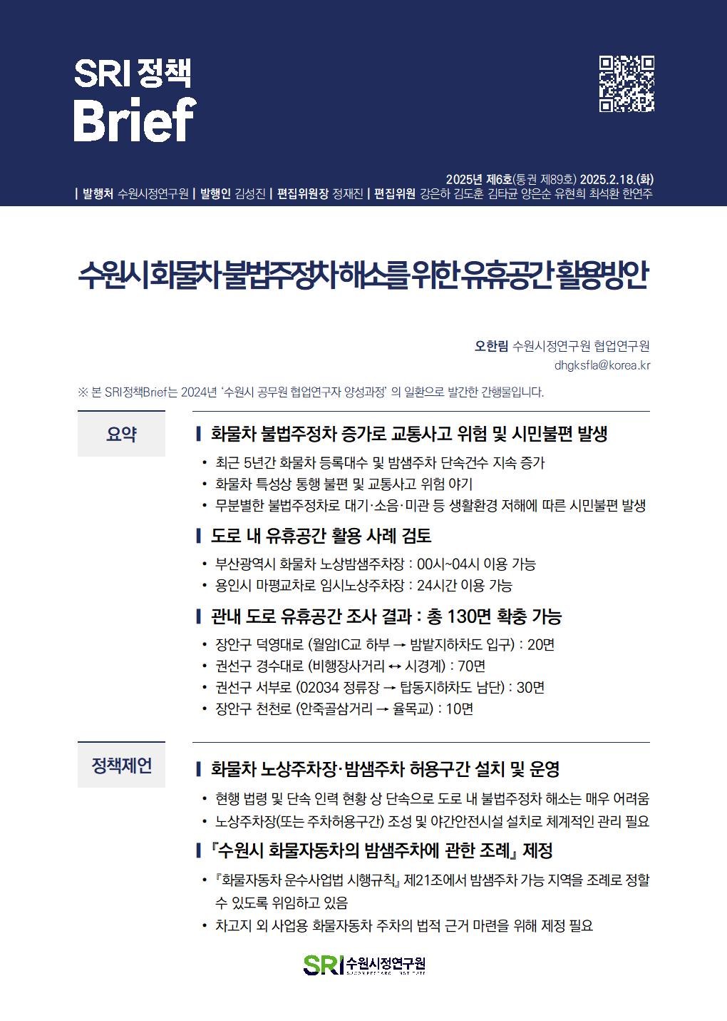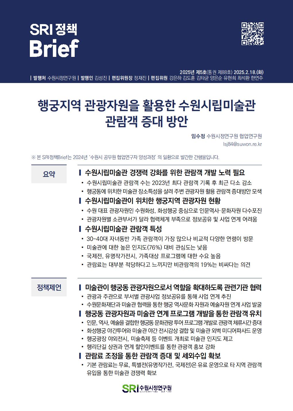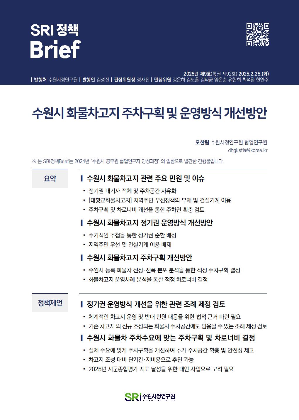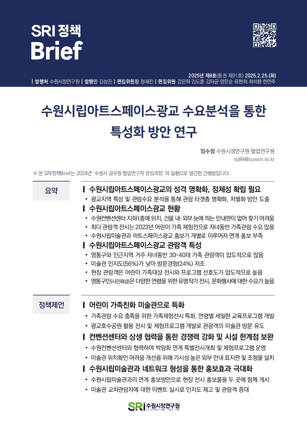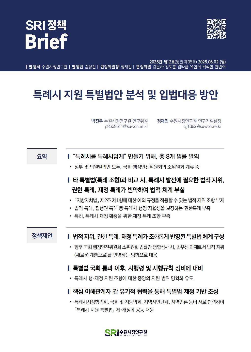SRI Brief 학술지 「수원학연구」 수원이야기 탄소중립이야기 총 126건의 게시물이 있습니다. 게시물 검색 검색어 필수 통근·통학 시간이 수원시민 삶의 질에 미치는 영향 부서데이터분석센터연구진김도훈, 이지원발행일2025-07-01발행호수2025년 제13호(통권 제96호) 조회수190 바로보기 SRI정책Brief 통근통학 시간이 수원시민 삶의 질에 미치는 영향20250701_공개.pdf 다운로드 SRI정책Brief 통근통학 시간이 수원시민 삶의 질에 미치는 영향20250701_공개.pdf 특례시 지원 특별법안 분석 및 입법대응 방안 부서도시경영연구실연구진박진우, 정재진발행일2025-06-02발행호수2025년 제12호(통권 제95호) 조회수214 바로보기 최종SRI정책Brief_특례시 지원 특별법안 분석 및 입법대응 방안.pdf 다운로드 최종SRI정책Brief_특례시 지원 특별법안 분석 및 입법대응 방안.pdf 민선 지방자치 30년, 성찰과 제안 부서도시경영연구실연구진박진우발행일2025-05-27발행호수2025년 제11호(통권 제94호) 조회수221 바로보기 최종SRI정책Brief_민선 지방자치 30년, 성찰과 제안_수정.pdf 다운로드 최종SRI정책Brief_민선 지방자치 30년, 성찰과 제안_수정.pdf 일본 과밀억제권역 규제완화 사례 분석 부서도시경영연구실연구진양은순, 강태욱발행일2025-05-20발행호수2025년 제10호(통권 제93호) 조회수169 바로보기 최종 SRI 정책 Brief-일본 과밀억제권역 규제 완화 사례 분석.pdf 다운로드 최종 SRI 정책 Brief-일본 과밀억제권역 규제 완화 사례 분석.pdf 수원시 화물차고지 주차구획 및 운영방식 개선방안 부서연구기획실연구진오한림발행일2025-02-25발행호수2025년 제9호(통권 제92호) 조회수287 바로보기 통권제92호 SRI정책Brief_수원시 화물차고지 주차구획 및 운영방식 개선방안오한림.pdf 다운로드 통권제92호 SRI정책Brief_수원시 화물차고지 주차구획 및 운영방식 개선방안오한림.pdf 수원시립아트스페이스광교 수요분석을 통한 특성화 방안 연구 부서연구기획실연구진임수정발행일2025-02-25발행호수2025년 제8호(통권 제91호) 조회수232 바로보기 통권제91호 SRI정책Brief_수원시립아트스페이스광교 수요분석을 통한 특성화 방안연구임수정_수정.pdf 다운로드 통권제91호 SRI정책Brief_수원시립아트스페이스광교 수요분석을 통한 특성화 방안연구임수정_수정.pdf 수원시 주민자치회 현황분석 및 개선방안 부서연구기획실연구진이미숙발행일2025-02-25발행호수2025년 제7호(통권 제90호) 조회수252 바로보기 통권제90호 SRI정책Brief_수원시 주민자치회 현황분석 및 개선방안이미숙.pdf 다운로드 통권제90호 SRI정책Brief_수원시 주민자치회 현황분석 및 개선방안이미숙.pdf 수원시 화물차 불법주정차 해소를 위한 유휴공간 활용방안 부서연구기획실연구진오한림발행일2025-02-18발행호수2025년 제6호(통권 제89호) 조회수391 바로보기 통권제89호 SRI정책Brief_수원시 화물차 불법주정차 해소를 위한 유휴공간 활용방안오한림.pdf 다운로드 통권제89호 SRI정책Brief_수원시 화물차 불법주정차 해소를 위한 유휴공간 활용방안오한림.pdf 행궁지역 관광자원을 활용한 수원시립미술관 관람객 증대 방안 부서연구기획실연구진임수정발행일2025-02-18발행호수2025년 제5호(통권 제88호) 조회수209 바로보기 통권제88호 SRI정책Brief_행궁지역 관광자원을 활용한 수원시립미술관 관람객 증대방안임수정_수정.pdf 다운로드 통권제88호 SRI정책Brief_행궁지역 관광자원을 활용한 수원시립미술관 관람객 증대방안임수정_수정.pdf 수원시 주민자치 우수사례 분석 부서연구기획실연구진이미숙발행일2025-02-18발행호수2025년 제4호(통권 제87호) 조회수199 바로보기 통권제87호 SRI정책Brief_수원시 주민자치 우수사례 분석_이미숙.pdf 다운로드 통권제87호 SRI정책Brief_수원시 주민자치 우수사례 분석_이미숙.pdf 처음 1페이지 2페이지 3페이지 열린4페이지 5페이지 6페이지 7페이지 8페이지 9페이지 10페이지 다음 맨끝