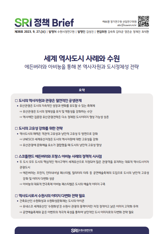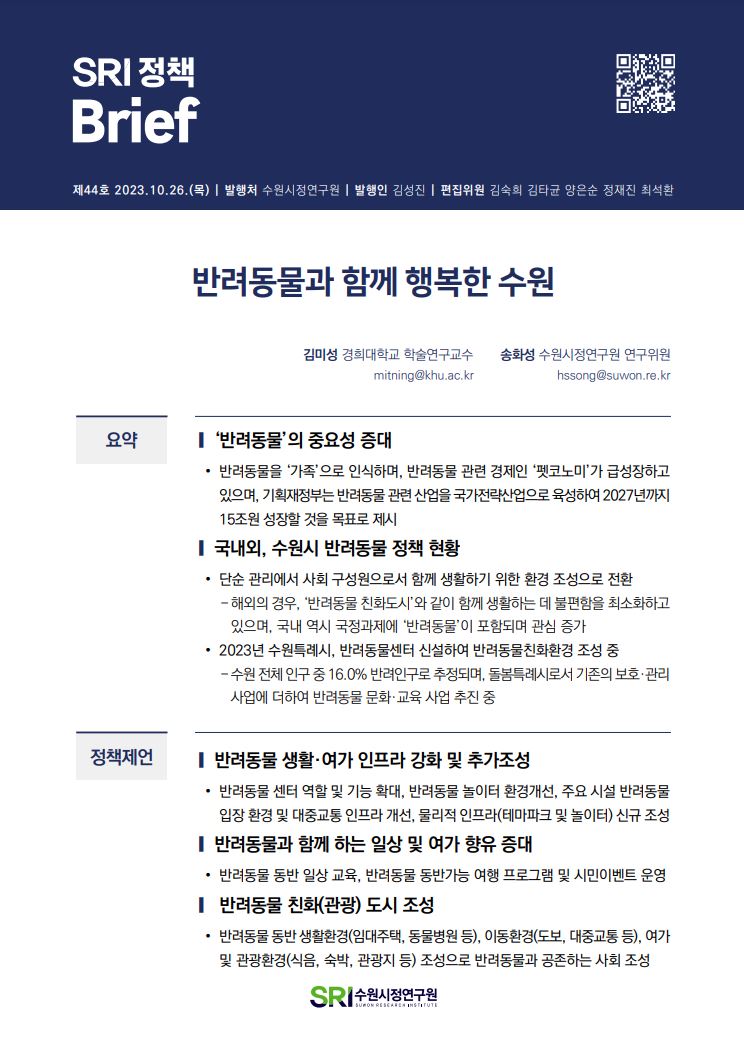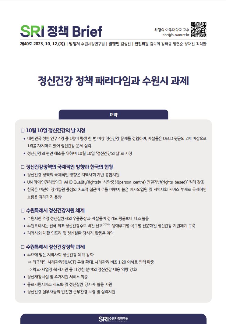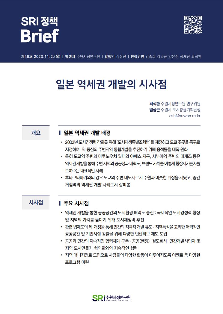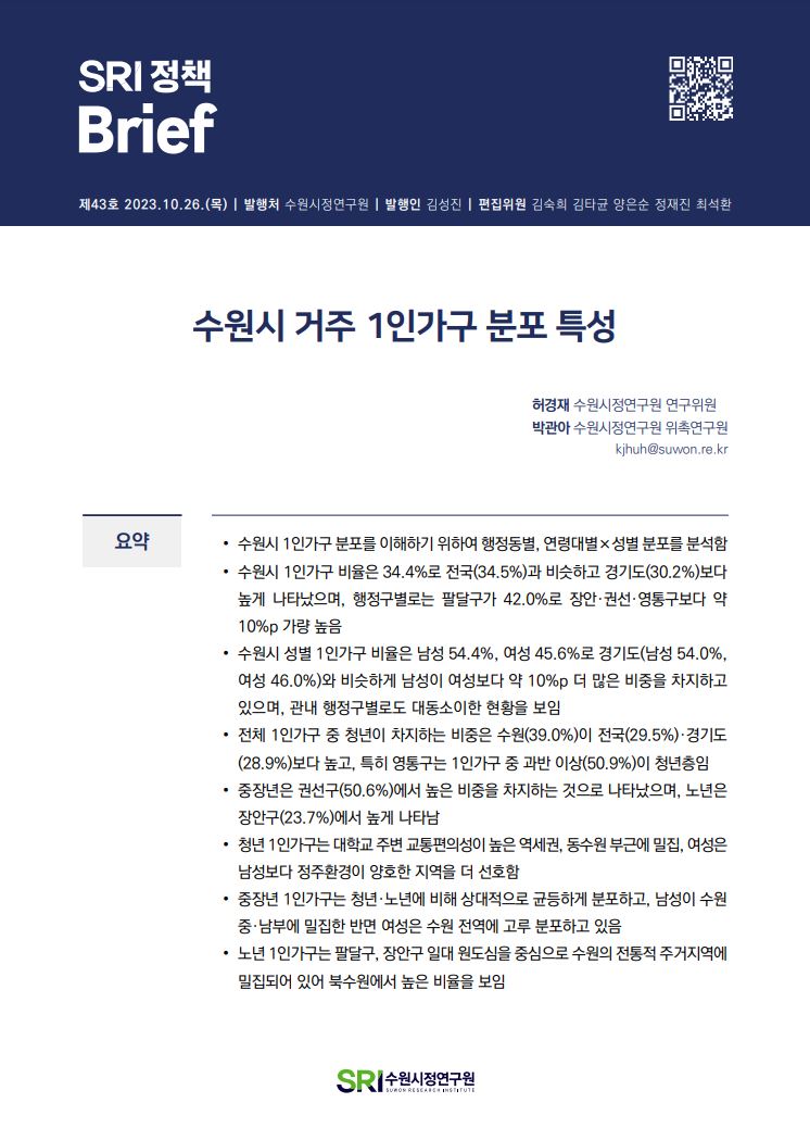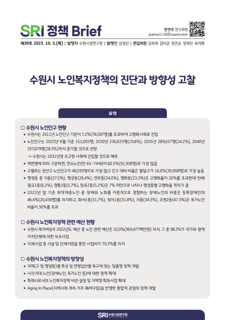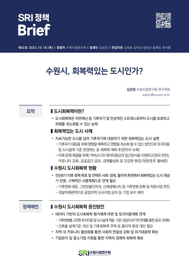 SRI Brief 학술지 「수원학연구」 수원이야기 탄소중립이야기 총 126건의 게시물이 있습니다. 게시물 검색 검색어 필수 일본 역세권 개발의 시사점 부서도시공간연구실연구진최석환 연구위원발행일2023-11-02발행호수2023년 제46호 조회수540 바로보기 231101 정책Brief 제46호(최석환).pdf 다운로드 231101 정책Brief 제46호(최석환).pdf 수원시 온실가스 배출 현황 부서도시공간연구실/탄소중립지원센터연구진강은하 연구위원/센터장발행일2023-11-02발행호수2023년 제45호 조회수522 바로보기 231101 정책Brief 제45호(강은하).pdf 다운로드 231101 정책Brief 제45호(강은하).pdf 반려동물과 함께 행복한 수원 부서도시경영연구실연구진송화성 연구위원발행일2023-10-26발행호수2023년 제44호 조회수460 바로보기 231025_(제44호) 정책브리프-반려동물(송화성)_fi_수정5.pdf 다운로드 231025_(제44호) 정책브리프-반려동물(송화성)_fi_수정5.pdf 수원시 거주 1인가구 분포 특성 부서도시공간연구실연구진허경재 연구위원발행일2023-10-26발행호수2023년 제43호 조회수659 바로보기 (제43호) 정책브리프_허경재박관아(1026)v2_최종5.pdf 다운로드 (제43호) 정책브리프_허경재박관아(1026)v2_최종5.pdf 수원시, 회복력있는 도시인가? 부서도시공간연구실연구진김은영 연구위원발행일2023-10-19발행호수2023년 제42호 조회수598 바로보기 (제42호) 정책브리프_김은영(1019)_수정v7.pdf 다운로드 (제42호) 정책브리프_김은영(1019)_수정v7.pdf 제8회 아시아·태평양 도시포럼의 의미와 수원시 과제 부서정책협력관실연구진김타균 정책협력관, 남상민 UNESCAP 환경·개발국장발행일2023-10-19발행호수2023년 제41호 조회수441 바로보기 (제41호) 정책브리프_김타균(1019)v3.pdf 다운로드 (제41호) 정책브리프_김타균(1019)v3.pdf 정신건강 정책 패러다임과 수원시 과제 부서아주대학교연구진하경희 교수발행일2023-10-12발행호수2023년 제40호 조회수431 바로보기 수원시정연구원_brief_40호-수정6.pdf 다운로드 수원시정연구원_brief_40호-수정6.pdf 수원시 노인복지정책의 진단과 방향성 고찰 부서도시경영연구실연구진한연주 연구위원발행일2023-10-05발행호수2023년 제39호 조회수722 바로보기 붙임 2. 시안_수원시정연구원_brief_39호-수정8.pdf 다운로드 붙임 2. 시안_수원시정연구원_brief_39호-수정8.pdf 세계 역사도시 사례와 수원 부서경기연구원연구진이수진 선임연구위원발행일2023-09-27발행호수2023년 제38호 조회수493 바로보기 수원시정연구원_brief_38호-수정1.pdf 다운로드 수원시정연구원_brief_38호-수정1.pdf 국내외 사례를 통한 수원시 치매정책의 방향성 부서도시경영연구실연구진한연주 연구위원발행일2023-09-21발행호수2023년 제37호 조회수457 바로보기 붙임 2. 시안_수원시정연구원_brief_37호_수정6차.pdf 다운로드 붙임 2. 시안_수원시정연구원_brief_37호_수정6차.pdf 처음 1페이지 2페이지 3페이지 4페이지 5페이지 6페이지 7페이지 8페이지 열린9페이지 10페이지 다음 맨끝