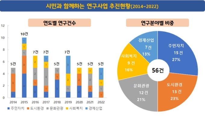 2014년부터 시작하여 올해로 9회째를 맞는 「시민과 함께하는 연구사업」은 시민과의 적극적인 소통을 통해 수원시정에 대한 정책 제안의 기회를 제공하고자 추진되었으며, 연구성과의 사회적 공감대를 확산하는 데 기여해 왔다. 연평균 약 6건의 연구결과가 제안되었으며, 올해까지 총 56건으로 다양한 분야의 연구결과가 시민참여를 통해 이루어졌다.