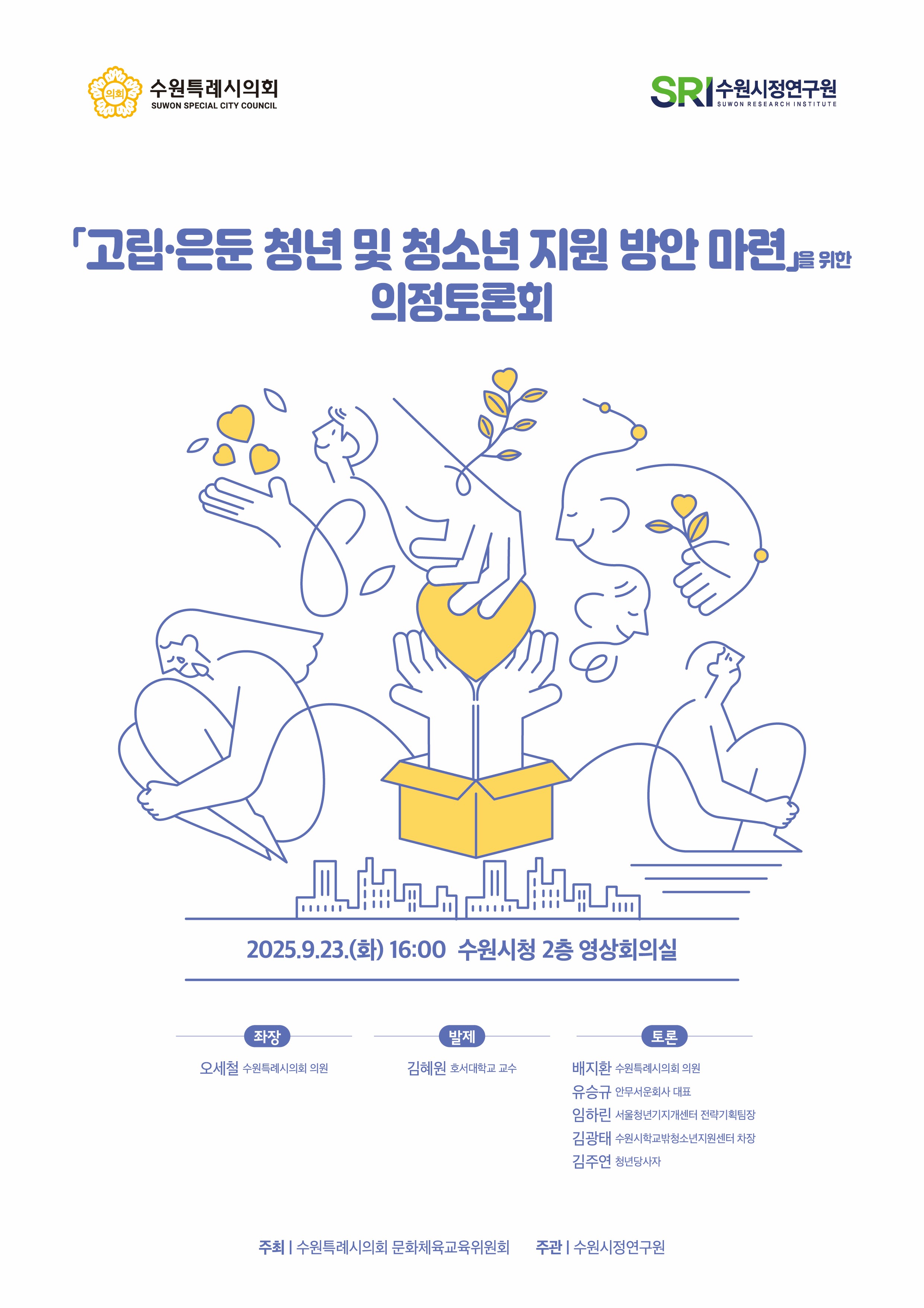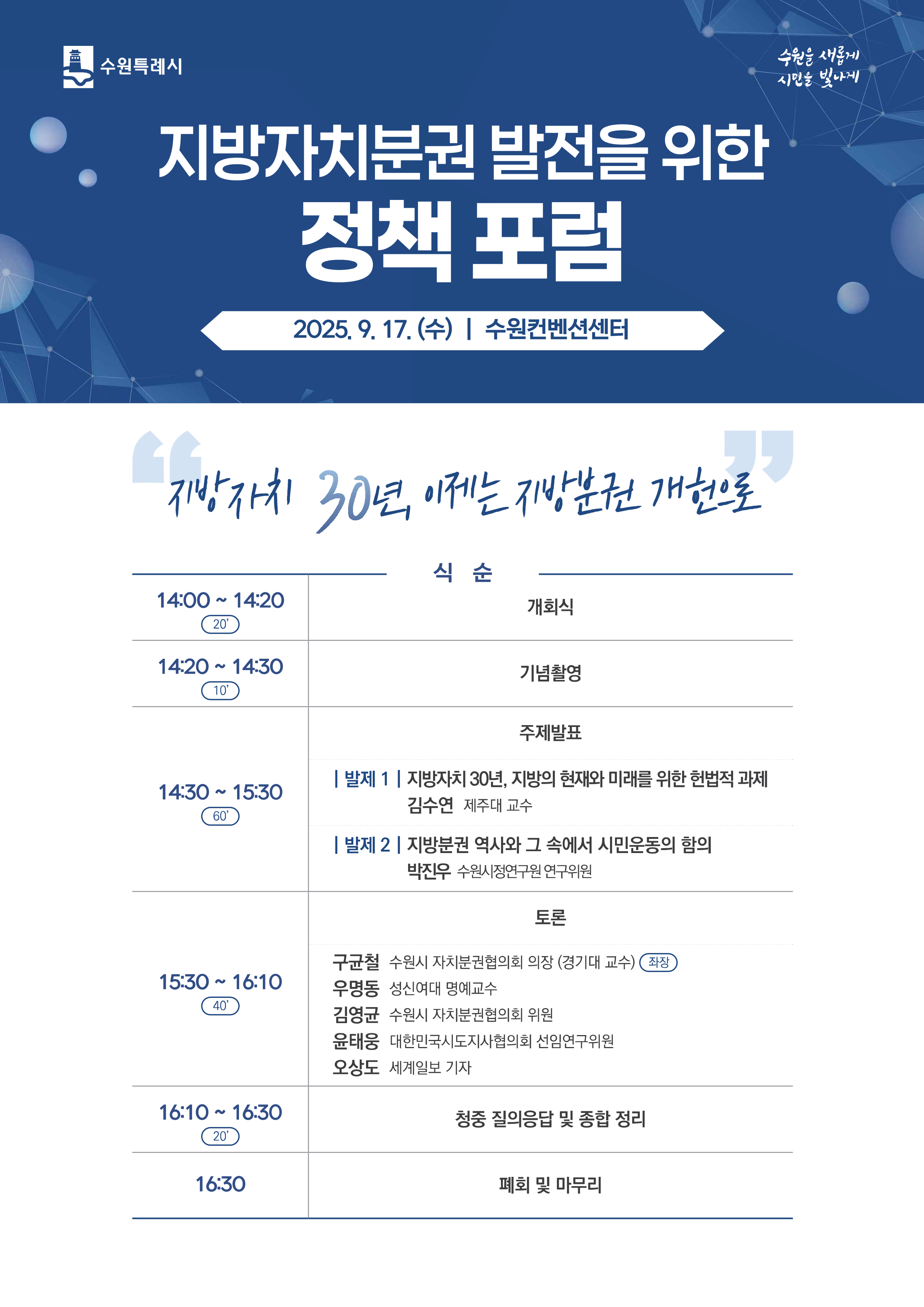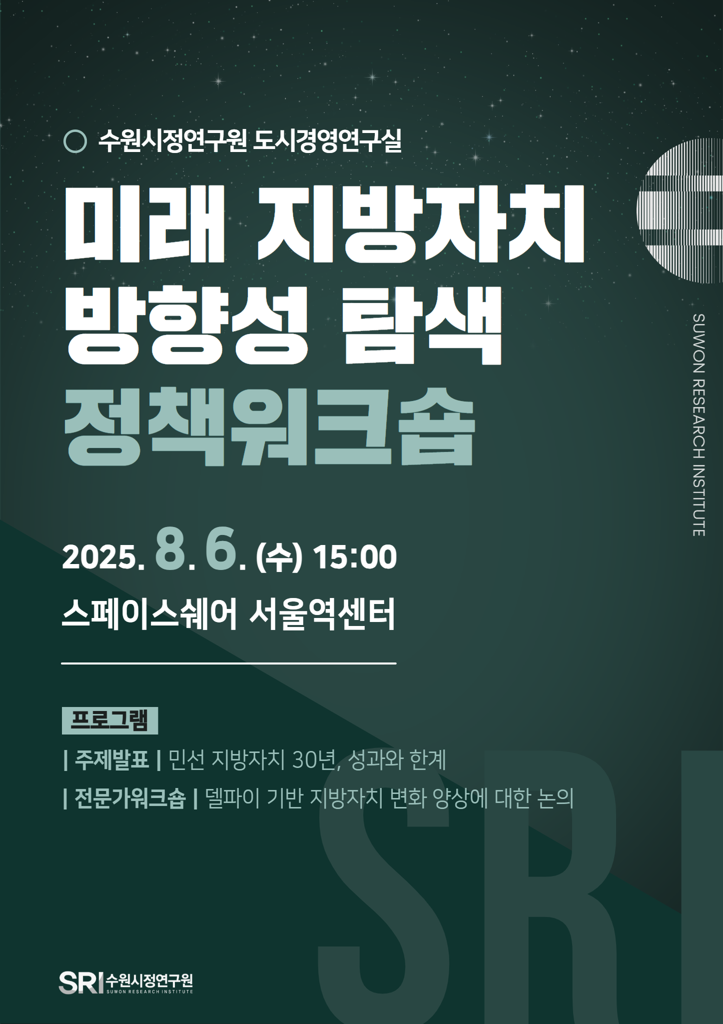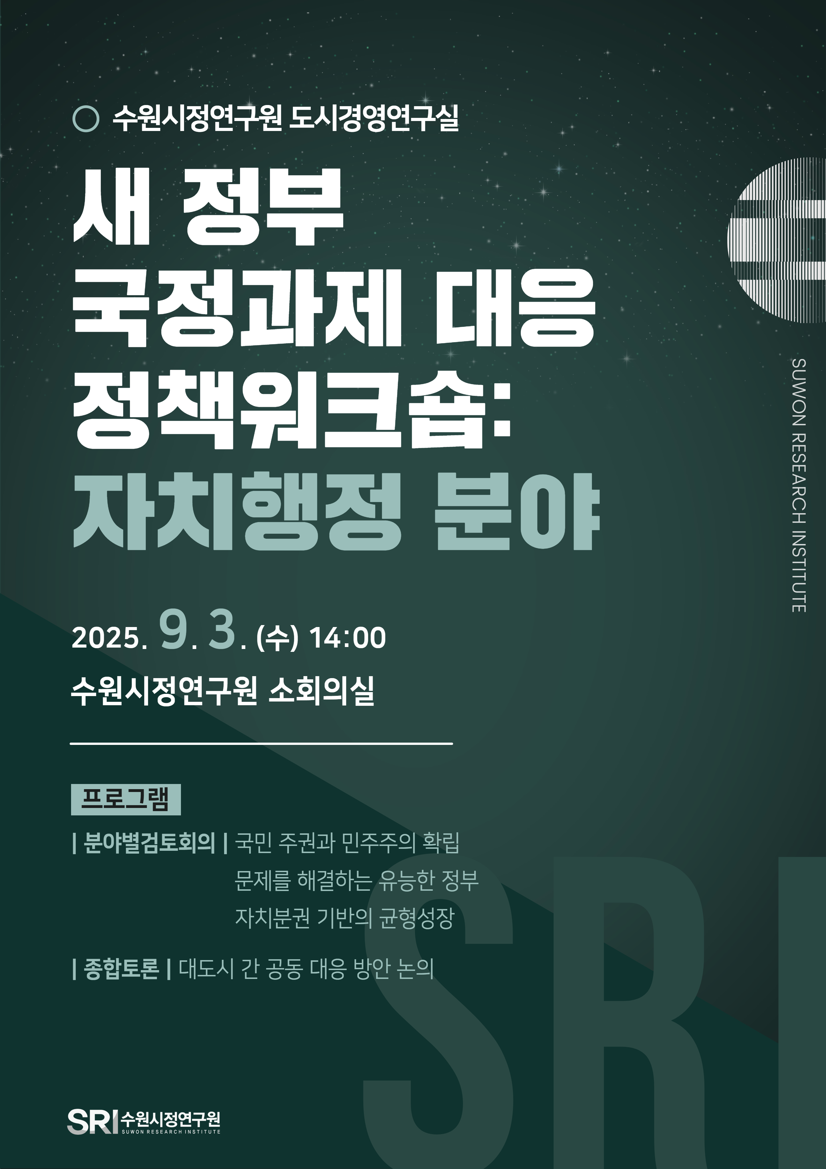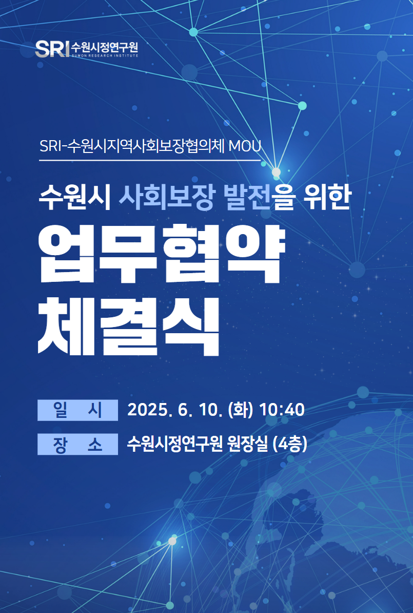 공지사항 채용 주요일정 총 105건의 게시물이 있습니다. 게시물 검색 검색어 필수 2025년 제3회 의정현안 정책토론회 행사일2025-09-23장소수원시청 영상회의실 조회수70 2025 데이터 경진대회 및 공모전 시상식 개최 행사일2025-09-19장소더함파크 1층 대강의실 115호 조회수93 바로보기 다운로드 2025년 제4회 의정현안 정책토론회 행사일2025-09-25장소수원시청 본관4층 문화체육교육위원회실 조회수72 지방자치분권 발전을 위한 정책 포럼 개최 행사일2025-09-17장소수원컨벤션센터 301-302호 조회수85 바로보기 다운로드 새 정부 국정과제 대응 정책워크숍 개최 행사일2025-09-03장소수원시정연구원 소회의실 조회수104 바로보기 다운로드 미래 지방자치 방향 설정을 위한 정책워크숍 행사일2025-08-06장소스페이스쉐어 서울역센터 조회수121 바로보기 다운로드 제 12회 수원학 심포지엄 '해방 80년, 원폭피해를 말하다 - 기억으로 잇는 평화와 정의의 연대' 개최 행사일2025-08-06장소수원시청 중회의실 조회수185 바로보기 제12회 수원학 심포지엄 웹 자료집.pdf 다운로드 제12회 수원학 심포지엄 웹 자료집.pdf 2025년 제2회 의정현안 정책토론회 행사일2025-07-23장소수원특례시청 중회의실 조회수179 바로보기 스마트폰 없는 교실을 위한 정책토론회_자료집_내지단면.pdf 다운로드 스마트폰 없는 교실을 위한 정책토론회_자료집_내지단면.pdf 2050 SRI 수원미래비전 강연 'Urban Lifestyle Platform @Busan' 행사일2025-07-16장소수원시정연구원 제1강의실 조회수111 군 공항 주변지역 고도제한 완화를 위한 희망토크 개최 행사일2025-07-14장소영흥수목원 책마루 조회수110 바로보기 다운로드 수원시정연구원 도시경영연구실 정책워크숍 행사일2025-07-11장소수원시정연구원 제2강의실(4층) 조회수145 바로보기 다운로드 지구로운 모임 지원사업 오리엔테이션 행사일2025-07-04장소더함파크 대강의실 조회수102 수원시 탄소중립지원센터 2025년 제1차 운영위원회 행사일2025-07-01장소제2강의실 조회수77 수원시지역사회보장협의체 업무협약 행사일2025-06-10장소수원시정연구원 원장실 조회수101 바로보기 다운로드 2025년 제1회 의정현안 정책토론회 행사일2025-06-05장소홍재복지타운 4층 교육장 조회수200 바로보기 제1회 의정토론회 자료집.pdf 다운로드 제1회 의정토론회 자료집.pdf 2025수원ITS아태총회 (공동특별세션)미래도시를 향한 포용적 연결: 기술·혁신, 환경 그리고 사람 행사일2025-05-28장소수원컨벤션센터 1층(105+106호) 조회수320 바로보기 SS01_2025 Suwon ITS APF.pdf 다운로드 SS01_2025 Suwon ITS APF.pdf 처음 1페이지 열린2페이지 3페이지 4페이지 5페이지 6페이지 7페이지 맨끝