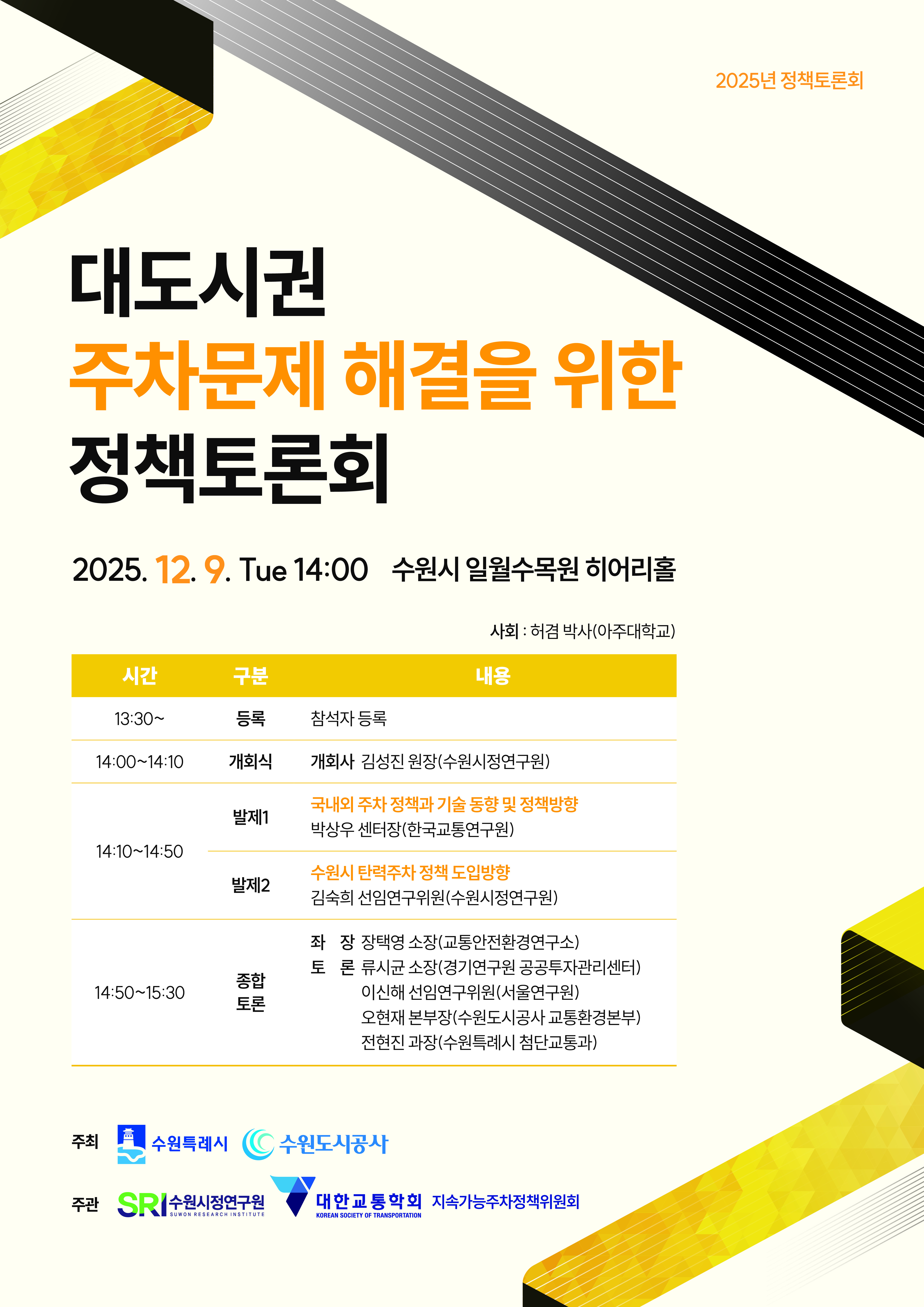 - 패널토론: 교통안전환경연구소 장택영 소장, 경기연구원 류시균 소장, 서울연구원 이신해 선임연구위원, 수원도시공사 오현재 본부장, 수원특례시 전현진 과장