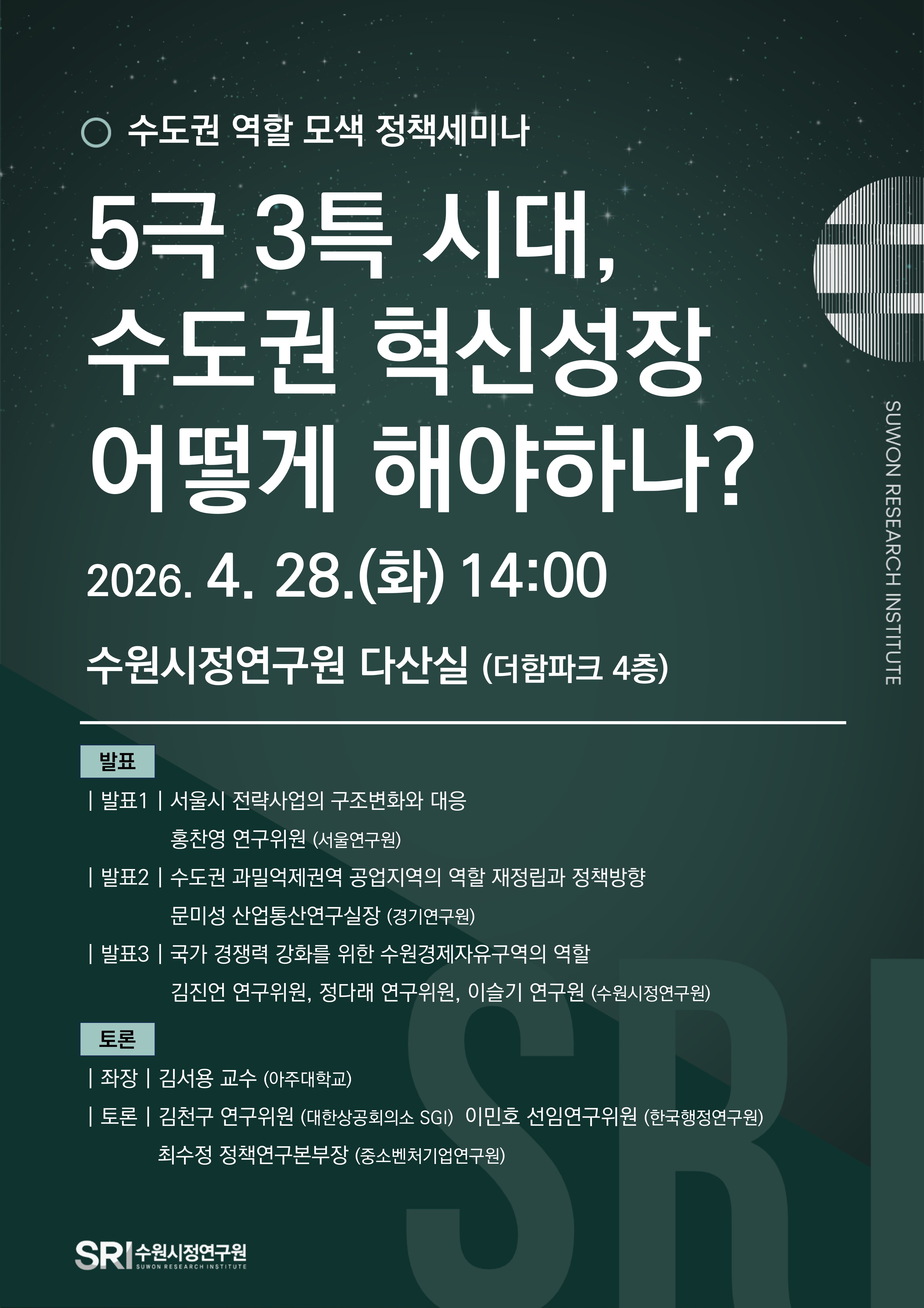 - 목적: 5극 3특 대응 수도권 역할 재정립과 수원특례시 혁신 성장 방안 모색