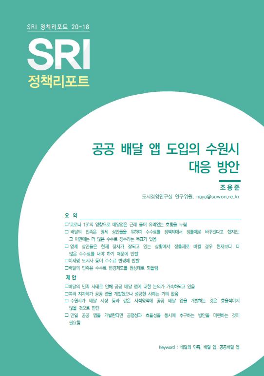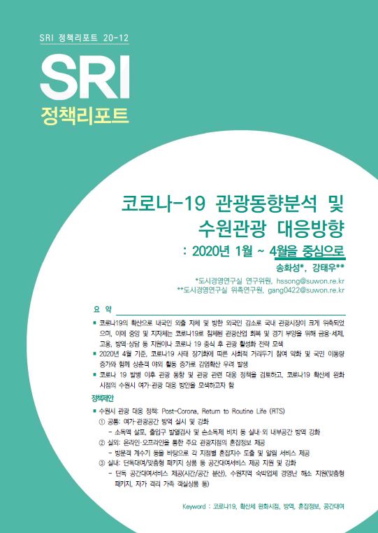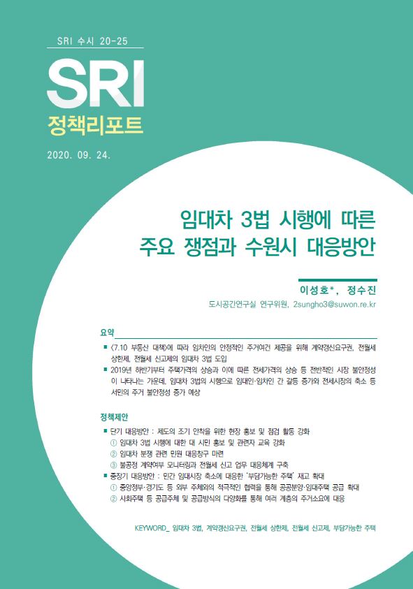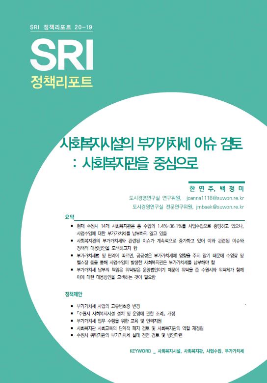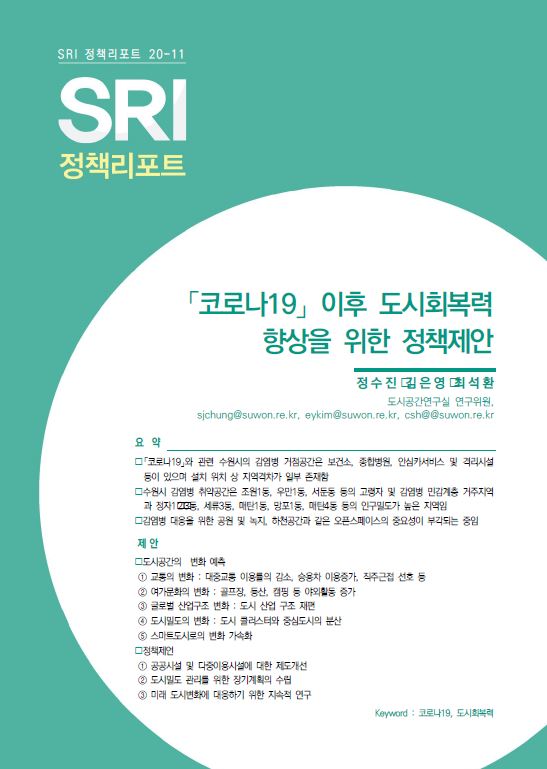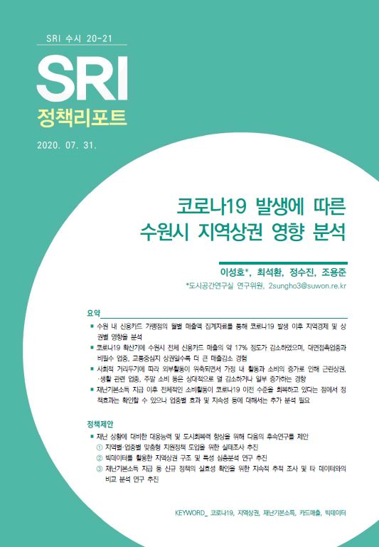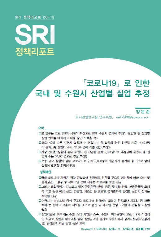 연구보고서 이슈&포커스 총 115건의 게시물이 있습니다. 이슈&포커스 카테고리 전체 전략연구 정책연구 현안연구 협업연구 기타 게시물 검색 검색어 필수 행·재정 경제·산업 복지·여성 안전·교통 도시·건축 환경·공원녹지 문화·청년 시민·교육 [현안연구] SRI 정책리포트 2020-31 정비구역 해제지역 관리 및 활성화 방안 도시공간연구실정수진 연구위원, 김도영 연구위원 조회수 : 754 주요 연구분야 : 도시·건축 바로보기 31. 정비구역 해제지역 관리 및 활성화 방안 - 정수진(공개).pdf 다운로드 31. 정비구역 해제지역 관리 및 활성화 방안 - 정수진(공개).pdf [현안연구] SRI 정책리포트 2020-30 2019 수원시 고용동향 분석 도시경영연구실조용준 연구위원 조회수 : 649 주요 연구분야 : 경제·산업 바로보기 30. 2019 수원시 고용동향 분석 - 조용준(공개).pdf 다운로드 30. 2019 수원시 고용동향 분석 - 조용준(공개).pdf [현안연구] SRI 정책리포트 2020-29 수원시 협치 기본계획 수립방향 연구 도시공간연구실김주석 연구위원 조회수 : 710 주요 연구분야 : 행·재정 바로보기 29. 수원시 협치 기본 계획 수립방향 연구 - 김주석(공개).pdf 다운로드 29. 수원시 협치 기본 계획 수립방향 연구 - 김주석(공개).pdf [현안연구] SRI 정책 리포트 2020-26 포스트 코로나 대비 복지관 기능 강화 방안 도시경영연구실한연주 연구위원 조회수 : 756 주요 연구분야 : 복지·여성 바로보기 26. 포스트 코로나 대비 복지관 기능 강화 방안 - 한연주 (공개).pdf 다운로드 26. 포스트 코로나 대비 복지관 기능 강화 방안 - 한연주 (공개).pdf [현안연구] SRI 정책리포트 2020-25 임대차 3법 시행에 따른 주요 쟁점과 수원시 대응방안 도시공간연구실이성호, 정수진 연구위원 조회수 : 733 주요 연구분야 : 행·재정 바로보기 25. 이성호 임대차 3법 시행에 따른 주요 쟁점과 수원시 대응방안(공개).pdf 다운로드 25. 이성호 임대차 3법 시행에 따른 주요 쟁점과 수원시 대응방안(공개).pdf [현안연구] SRI 정책리포트 2020-21 코로나19 발생에 따른 수원시 지역상권 영향 분석 도시공간연구실이성호, 최석환, 정수진, 조용준 연구위원 조회수 : 755 주요 연구분야 : 경제·산업 바로보기 21_ 코로나 19 발생에 따른 수원시 지역상권 영향 분석 - 이성호.pdf 다운로드 21_ 코로나 19 발생에 따른 수원시 지역상권 영향 분석 - 이성호.pdf [현안연구] SRI 정책리포트 2020-20 수원시 도시공간의 격차와 대응과제 도시공간연구실이성호 연구위원 조회수 : 682 주요 연구분야 : 도시·건축 바로보기 20_ 200729 수원시 도시공간의 격차와 대응과제 - 이성호.pdf 다운로드 20_ 200729 수원시 도시공간의 격차와 대응과제 - 이성호.pdf [현안연구] SRI 정책리포트 2020-19 사회복지시설의 부가가치세 이슈 검토 : 사회복지관을 중심으로 도시경영연구실한연주 연구위원, 백정미 전문연구위원 조회수 : 780 주요 연구분야 : 복지·여성 바로보기 19. 한연주, 백정미 사회복지시설의 부가가치세 이슈 검토 사회복지관을 중심으로.pdf 다운로드 19. 한연주, 백정미 사회복지시설의 부가가치세 이슈 검토 사회복지관을 중심으로.pdf [현안연구] SRI 정책리포트 2020-18 공공배달 앱 도입의 수원시 대응방안 도시경영연구실조용준 연구위원 조회수 : 754 주요 연구분야 : 경제·산업 바로보기 18_조용준_공공 배달 앱 도입의 수원시 대응 방안 (공개).pdf 다운로드 18_조용준_공공 배달 앱 도입의 수원시 대응 방안 (공개).pdf [현안연구] SRI 정책리포트 2020-17 코로나19 대응을 위한 수원시 세출구조조정 방안 도시경영연구실황소하 연구위원 조회수 : 637 주요 연구분야 : 행·재정 바로보기 17_황소하_코로나19 대응을 위한 수원시 세출구조조정 방안(최종) (공개).pdf 다운로드 17_황소하_코로나19 대응을 위한 수원시 세출구조조정 방안(최종) (공개).pdf [현안연구] SRI 정책리포트 2020-13 코로나19로 인한 국내 및 수원시 산업별 실업 추정 도시경영연구실양은순 연구위원 조회수 : 637 주요 연구분야 : 경제·산업 바로보기 13_양은순_코로나19로 인한 국내 및 수원시 산업별 실업 추정(공개).pdf 다운로드 13_양은순_코로나19로 인한 국내 및 수원시 산업별 실업 추정(공개).pdf [현안연구] SRI 정책리포트 2020-12 코로나19 관광동향분석 및 수원관광 대응방향 도시경영연구실송화성 연구위원 조회수 : 673 주요 연구분야 : 도시·건축 바로보기 12_송화성_코로나-19 관광동향분석 및 수원관광 대응방향 (공개).pdf 다운로드 12_송화성_코로나-19 관광동향분석 및 수원관광 대응방향 (공개).pdf [현안연구] SRI 정책리포트 2020-11 코로나19 이후 도시회복력 향상을 위한 정책제안 도시공간연구실정수진 연구위원 조회수 : 633 주요 연구분야 : 도시·건축 바로보기 11_코로나19이후 도시회복력 향상을 위한 정책제안_수정(공개).pdf 다운로드 11_코로나19이후 도시회복력 향상을 위한 정책제안_수정(공개).pdf [현안연구] SRI 정책리포트 2020-09 코로나19로 인한 수원시 및 국내 경제 손실 추정 도시경영연구실양은순 연구위원 조회수 : 630 주요 연구분야 : 경제·산업 바로보기 09_양은순_코로나19로 인한 수원시 및 국내 경제 손실 추정(공개).pdf 다운로드 09_양은순_코로나19로 인한 수원시 및 국내 경제 손실 