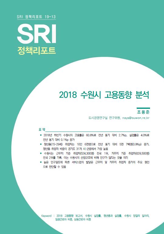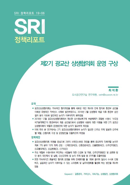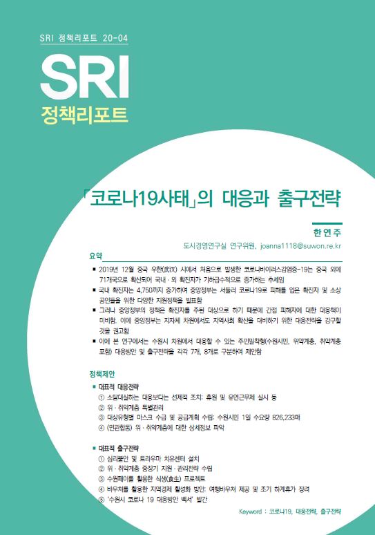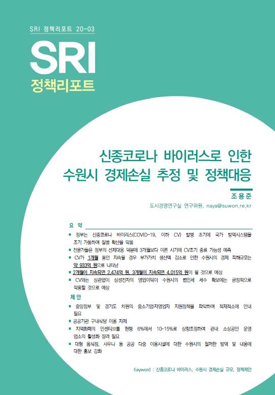 연구보고서 이슈&포커스 총 115건의 게시물이 있습니다. 이슈&포커스 카테고리 전체 전략연구 정책연구 현안연구 협업연구 기타 게시물 검색 검색어 필수 행·재정 경제·산업 복지·여성 안전·교통 도시·건축 환경·공원녹지 문화·청년 시민·교육 [현안연구] SRI 정책리포트 2020-04 코로나19 사태의 대응과 출구전략 도시경영연구실한연주 연구위원 조회수 : 580 주요 연구분야 : 행·재정 바로보기 04_한연주_코로나19사태의 대응과 출구전략.pdf 다운로드 04_한연주_코로나19사태의 대응과 출구전략.pdf [현안연구] SRI 정책리포트 2020-03 신종코로나 바이러스로 인한 수원시 경제 손실 추정 및 정책대응 도시경영연구실조용준 연구위원 조회수 : 621 주요 연구분야 : 경제·산업 바로보기 03_조용준_신종코로나 바이러스로 인한 수원시 경제손실 추정 및 정책대응 (공개).pdf 다운로드 03_조용준_신종코로나 바이러스로 인한 수원시 경제손실 추정 및 정책대응 (공개).pdf [현안연구] SRI 정책리포트 2019-14 오산~용인 고속도로 민간제안 사업에 따른 수원시 대응방안 도시공간연구실김숙희 연구위원, 김은영 연구위원 조회수 : 644 주요 연구분야 : 안전·교통 바로보기 14.김숙희_현안수시_오산~용인 고속도로 민간제안 사업에 따른 수원시 대응방안.pdf 다운로드 14.김숙희_현안수시_오산~용인 고속도로 민간제안 사업에 따른 수원시 대응방안.pdf [현안연구] SRI 정책리포트 2019-13 2018 수원시 고용동향 분석 도시경영연구실조용준 연구위원 조회수 : 607 주요 연구분야 : 경제·산업 바로보기 13.조용준_2018 수원시 고용동향분석 (공개).pdf 다운로드 13.조용준_2018 수원시 고용동향분석 (공개).pdf [현안연구] SRI 정책리포트 2019-06 제2기 광교산 상생협의회 운영 구상 도시공간연구실최석환 연구위원 조회수 : 618 주요 연구분야 : 환경·공원녹지 바로보기 06.최석환_SRI_정책리포트_제2기 광교산 상생협의회 운영 구상.pdf 다운로드 06.최석환_SRI_정책리포트_제2기 광교산 상생협의회 운영 구상.pdf [현안연구] SRI 정책리포트 2019-03 수원시 주차공유사업을 토한 경제적 효과 분석 도시공간연구실김숙희 연구위원 조회수 : 614 주요 연구분야 : 경제·산업 바로보기 03.김숙희_현안수시_수원시 주차공유사업을 통한 경제적 효과 분석 (공개).pdf 다운로드 03.김숙희_현안수시_수원시 주차공유사업을 통한 경제적 효과 분석 (공개).pdf [현안연구] SRI 정책리포트 2018-19 수원 지역연구의 동향과 과제 수원학연구센터이성호 연구위원 조회수 : 1352 주요 연구분야 : 도시·건축 바로보기 SRI 정책리포트 2018-19 수원 지역연구의 동형과 과제(이성호).pdf 다운로드 SRI 정책리포트 2018-19 수원 지역연구의 동형과 과제(이성호).pdf [현안연구] SRI 정책리포트 2018-18 수원시 산업 환경 및 전국 산업진흥재단 현황 분석 재정경제연구실조용준 연구귀원 조회수 : 1076 주요 연구분야 : 경제·산업 바로보기 SRI 정책리포트 2018-18 산업진흥재단 현황 분석(조용준) 수정1.pdf 다운로드 SRI 정책리포트 2018-18 산업진흥재단 현황 분석(조용준) 수정1.pdf [현안연구] SRI 정책리포트 2018-17 수원시 자치경제 모형 개별 연구 재정경제연구실조용준 연구위원 조회수 : 1117 주요 연구분야 : 경제·산업 바로보기 SRI 정책리포트 2018-17 자치경제 모형 개발(조용준) 수정1.pdf 다운로드 SRI 정책리포트 2018-17 자치경제 모형 개발(조용준) 수정1.pdf [현안연구] SRI 정책리포트 2018-16 수원시 여성정책예산 분석 및 특징 도시행정연구실이영안 실장 조회수 : 995 주요 연구분야 : 복지·여성 바로보기 SRI 정책리포트 2018-16 수원시 여성정책예산(이영안) 수정1.pdf 다운로드 SRI 정책리포트 2018-16 수원시 여성정책예산(이영안) 수정1.pdf [현안연구] SRI 정책리포트 2018-15 서울농대 부지 활용방안 분석 -경기도·서울대·도코모모공모전 안을 중심으로 수원공공디자인센터안국진 센터장 조회수 : 1319 주요 연구분야 : 도시·건축 [현안연구] SRI 정책리포트 2018-14 수원시 1인 가구 증가에 따른 대응 방안 도시행정연구실이영안, 송화성 연구위원 조회수 : 1183 주요 연구분야 : 행·재정 바로보기 SRI 정책리포트 2018-14 1인가구(이영안 송화성).pdf 다운로드 SRI 정책리포트 2018-14 1인가구(이영안 송화성).pdf [현안연구] SRI 정책리포트 2018-13 수원시 PM2.5 화학조성 분석을 통한 정책적 시사점 도출 안전환경연구실강은하 연구위원 조회수 : 1157 주요 연구분야 : 환경·공원녹지 [현안연구] SRI 정책리포트 2018-12 도시지표 현황 및 특성 도시공간연구실김주석 연구위원 조회수 : 1184 주요 연구분야 : 도시·건축 바로보기 SRI 정책리포트 2018-12 도시지표(김주석).pdf 다운로드 SRI 정책리포트 2018-12 도시지표(김주석).pdf [현안연구] SRI 정책리포트 2018-11 몽골 「수원시민의 숲」 조성사업 운영 및 관리 현황 안전환경연구실김은영 연구위원 조회수 : 1124 주요 연구분야 : 환경·공원녹지 바로보기 SRI 정책리포트 2018-11 몽골 수원시민의 숲(김은영).pdf 다운로드 SRI 정책리포트 2018-11 몽골 수원시민의 숲(김은영).pdf 처음 1페이지 2페이지 3페이지 4페이지 5페이지 6페이지 열린7페이지 8페이지 맨끝