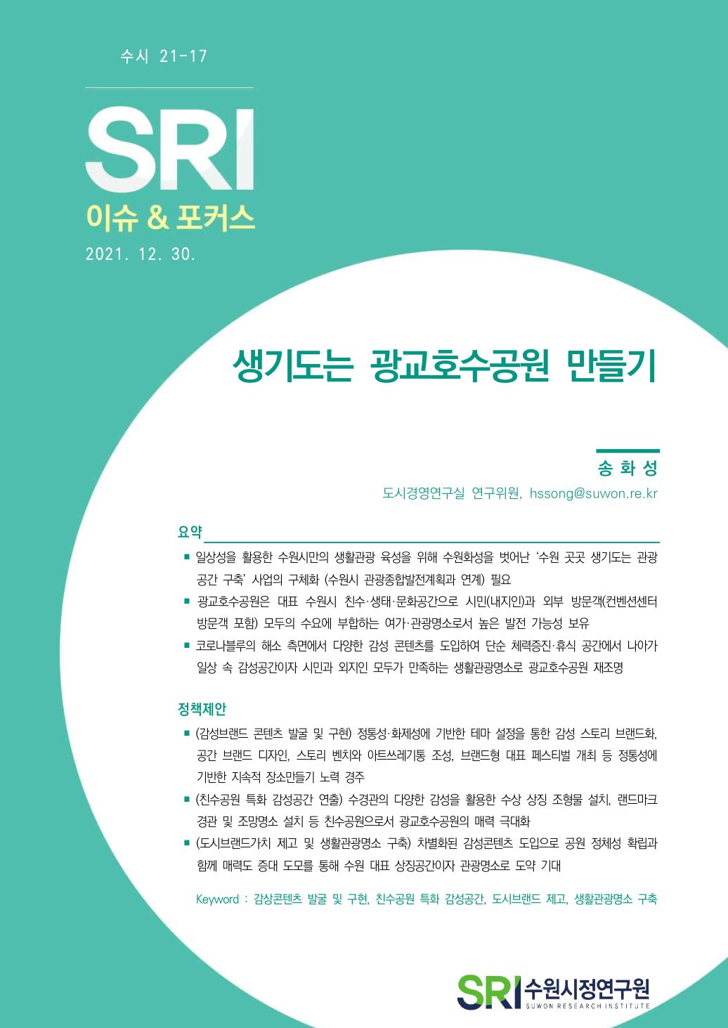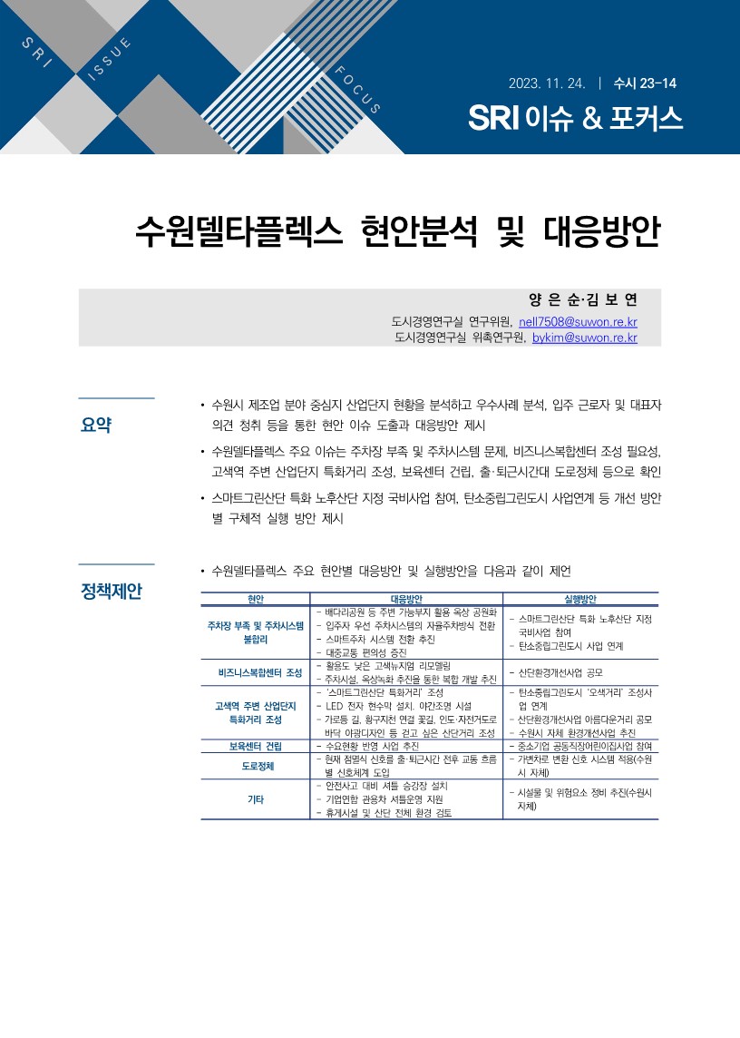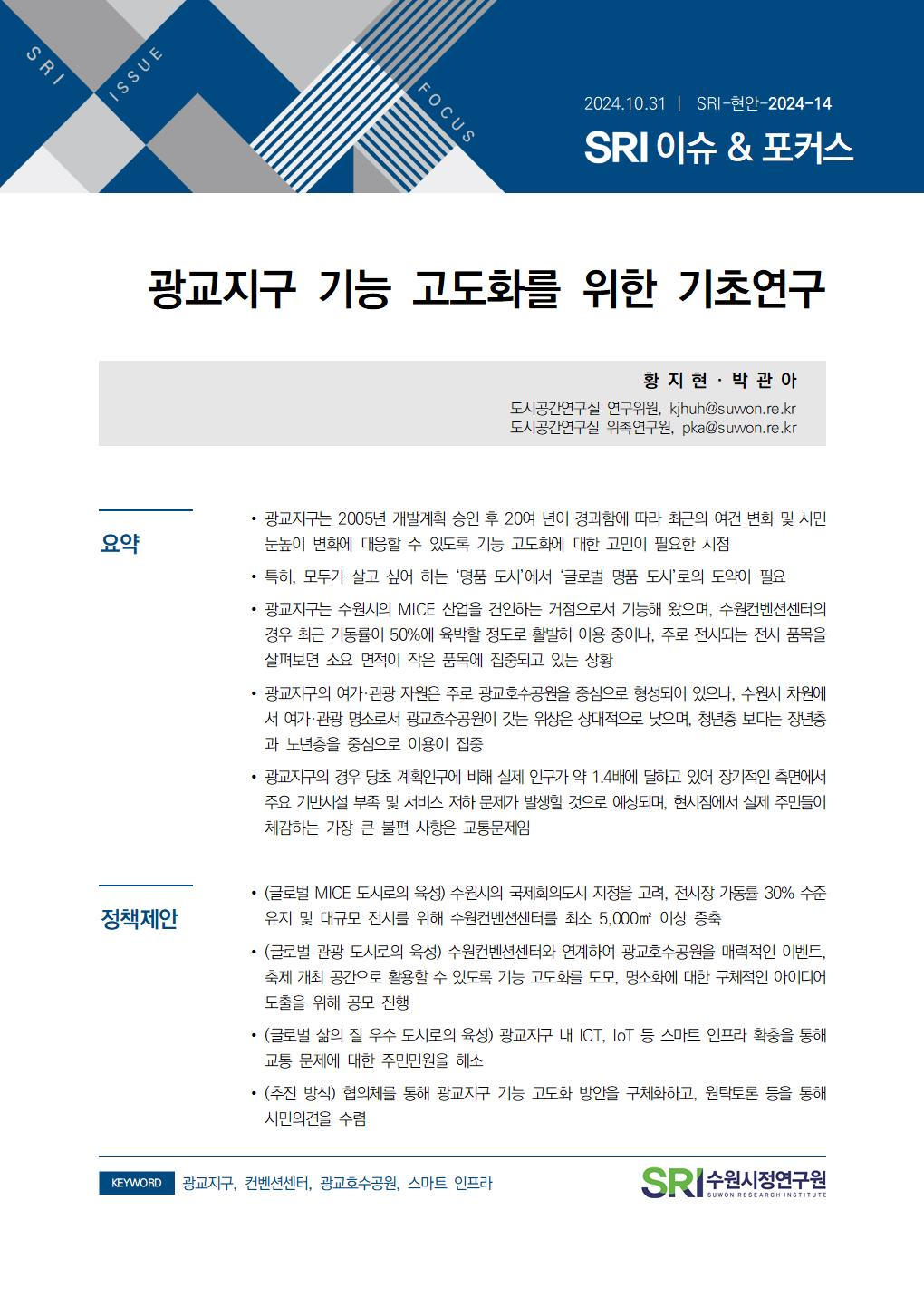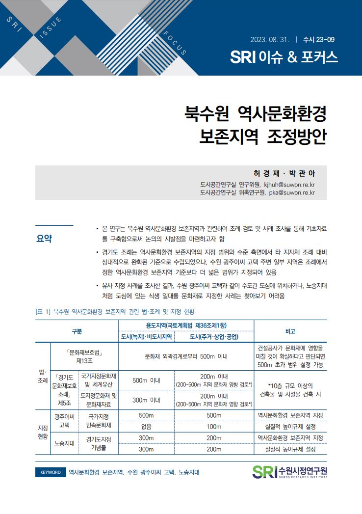 연구보고서 이슈&포커스 총 25건의 게시물이 있습니다. 이슈&포커스 카테고리 전체 전략연구 정책연구 현안연구 협업연구 기타 게시물 검색 검색어 필수 행·재정 경제·산업 복지·여성 안전·교통 도시·건축 환경·공원녹지 문화·청년 시민·교육 [현안연구] 대중음악 공연시설 현황 및 관련 시장 동향 도시공간연구실허경재2025-12-19 조회수 : 98 주요 연구분야 : 도시·건축 바로보기 현안_2025_대중음악 공연시설 현황 및 관련 시장 동향_최종.pdf 다운로드 현안_2025_대중음악 공연시설 현황 및 관련 시장 동향_최종.pdf [현안연구] 제12차 세계도시포럼(WUF12)의 의제와 수원시 대응 방안 도시공간연구실김진언 전문연구위원2024-12-31 조회수 : 447 주요 연구분야 : 도시·건축 바로보기 홈페이지용 WUF12의제와 수원시 대응방안_SRI김진언.pdf 다운로드 홈페이지용 WUF12의제와 수원시 대응방안_SRI김진언.pdf [현안연구] 광교지구 기능 고도화를 위한 기초연구 도시공간연구실황지현 연구위원2024-10-31 조회수 : 369 주요 연구분야 : 도시·건축 바로보기 최종홈페이지용광교지구 기능 고도화를 위한 기초연구_SRI황지현.pdf 다운로드 최종홈페이지용광교지구 기능 고도화를 위한 기초연구_SRI황지현.pdf [현안연구] 수원델타플렉스 현안분석 및 대응방안 도시경영연구실양은순2023-11-24 조회수 : 313 주요 연구분야 : 도시·건축 바로보기 (수시보고서) 수원델타플렉스 현안분석 및 대응방안(최종)_231213(인쇄용).pdf 다운로드 (수시보고서) 수원델타플렉스 현안분석 및 대응방안(최종)_231213(인쇄용).pdf [현안연구] 유엔해비타트 분야별 수상 동향분석 및 정책제안 도시공간연구실김숙희 선임연구위원2024-07-10 조회수 : 389 주요 연구분야 : 도시·건축 바로보기 유엔해비타트 수상동향분석 및 정책제안공개용.pdf 다운로드 유엔해비타트 수상동향분석 및 정책제안공개용.pdf [현안연구] 수원특례시 유수지 복합개발 가능성 검토 도시공간연구실황지현 연구위원2024-05-31 조회수 : 566 주요 연구분야 : 도시·건축 바로보기 공개용-현안 수원특례시 유수지 복합개발 가능성 검토_240531.pdf 다운로드 공개용-현안 수원특례시 유수지 복합개발 가능성 검토_240531.pdf [현안연구] 노후계획도시정비법 시행과 정책적 시사점 도시공간연구실허경재 연구위원2024-04-19 조회수 : 537 주요 연구분야 : 도시·건축 바로보기 인쇄보고서 노후계획도시정비법 시행과 정책적 시사점_허경재.pdf 다운로드 인쇄보고서 노후계획도시정비법 시행과 정책적 시사점_허경재.pdf [현안연구] 세계화장실협회 운영현황 및 발전방안 도시공간연구실김은영 연구위원, 황영현 동아대학교 교수2023-12-15 조회수 : 553 주요 연구분야 : 도시·건축 바로보기 (수시23-15)세계화장실협회 운영현황 및 발전 방안(최종)_2.pdf 다운로드 (수시23-15)세계화장실협회 운영현황 및 발전 방안(최종)_2.pdf [현안연구] 수원시 자전거도로 도입구간 선정 도시공간연구실김숙희 선임연구위원2023-11-30 조회수 : 493 주요 연구분야 : 도시·건축 바로보기 (수시)수원시 자전거도로 도입구간 선정_F.pdf 다운로드 (수시)수원시 자전거도로 도입구간 선정_F.pdf [현안연구] 북수원 역사문화환경 보존지역 조정방안 도시공간연구실허경재 연구위원2023-08-31 조회수 : 600 주요 연구분야 : 도시·건축 바로보기 수시_북수원 역사문화환경보존지역 조정방안.pdf 다운로드 수시_북수원 역사문화환경보존지역 조정방안.pdf [현안연구] SRI 이슈&포커스(현안) 2021-06 수원시 2030 지속가능발전목표 지표점검 및 개선방향 도시공간연구실최석환 연구위원2021-12-31 조회수 : 822 주요 연구분야 : 도시·건축 바로보기 1229 현안21-06 수원시 2030 지속가능발전목표 기본전략 점검(최석환) 화질수정.pdf 다운로드 1229 현안21-06 수원시 2030 지속가능발전목표 기본전략 점검(최석환) 화질수정.pdf [현안연구] SRI 이슈&포커스(수시) 2021-17 생기도는 광교호수공원 만들기 도시경영연구실송화성 연구위원2021-12-30 조회수 : 745 주요 연구분야 : 도시·건축 바로보기 1229_생기도는 광교호수공원(송화성) 최종 수정.pdf 다운로드 1229_생기도는 광교호수공원(송화성) 최종 수정.pdf [현안연구] SRI 이슈&포커스(수시) 2021-15 수원 투어패스 도입방안 도시경영연구실송화성 연구위원2021-12-17 조회수 : 696 주요 연구분야 : 도시·건축 바로보기 1222_이슈&포커스 수시15 수원 투어패스(송화성).pdf 다운로드 1222_이슈&포커스 수시15 수원 투어패스(송화성).pdf [현안연구] SRI 이슈&포커스(수시) 2021-14 스마트 관광활성화를 위한 XR 투어버스 도입 검토 도시경영연구실송화성 연구위원2021-12-08 조회수 : 674 주요 연구분야 : 도시·건축 바로보기 1208 이슈&포커스 수시14 XR 투어버스 도입방안(송화성).pdf 다운로드 1208 이슈&포커스 수시14 XR 투어버스 도입방안(송화성).pdf [현안연구] SRI 이슈&포커스(현안) 2021-01 수원시 고가 하부공간 개선 방안 도시공간연구실박규령 연구위원2021-10-28 조회수 : 694 주요 연구분야 : 도시·건축 바로보기 [이슈앤포커스 현안 21-01]수원시 고가도로 하부공간 개선방안(박규령)-수정2.pdf 다운로드 [이슈앤포커스 현안 21-01]수원시 고가도로 하부공간 개선방안(박규령)-수정2.pdf 전체목