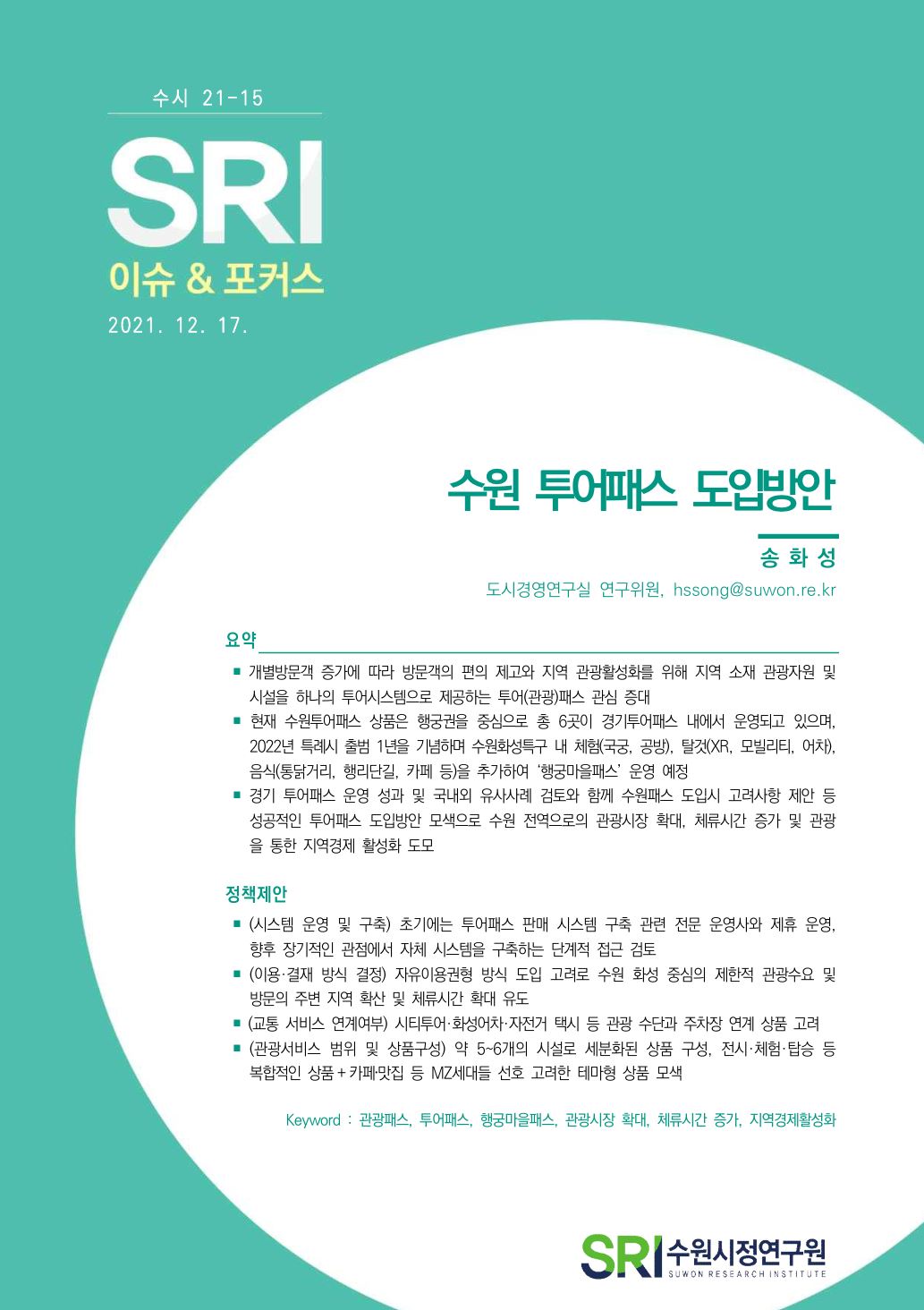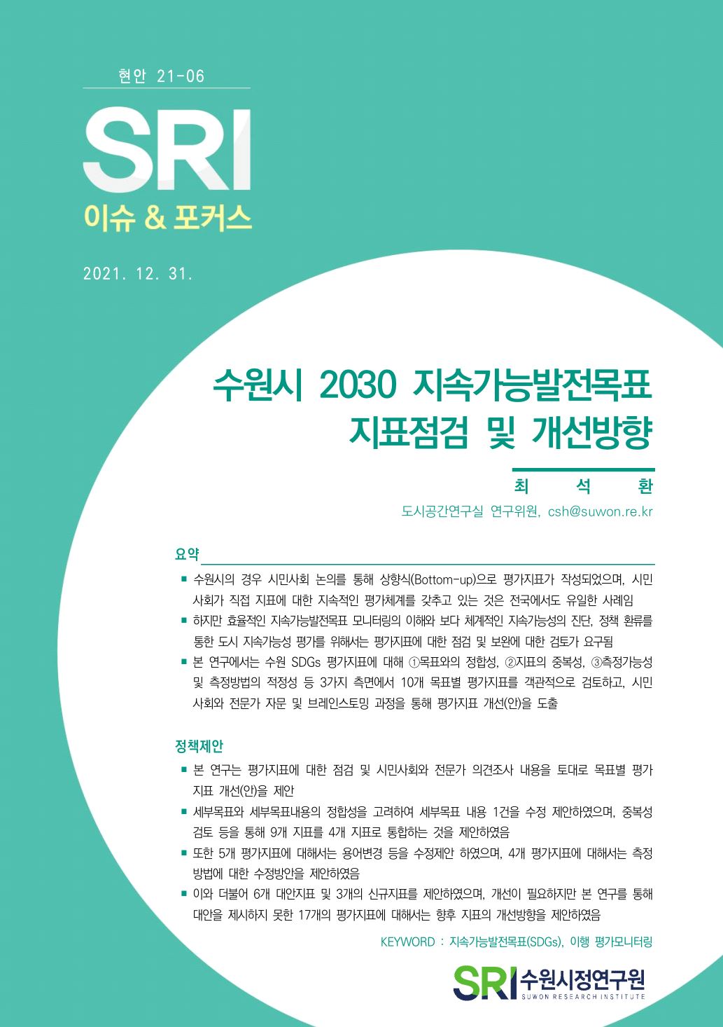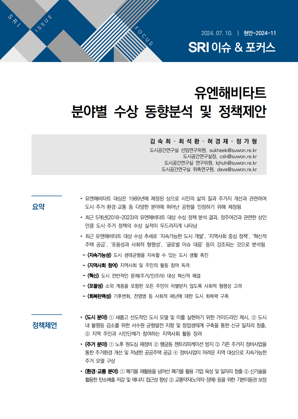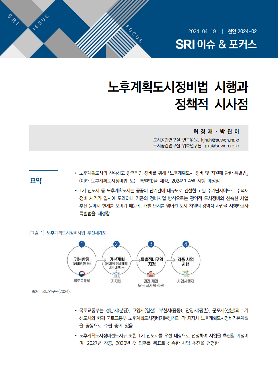 연구보고서 이슈&포커스 총 25건의 게시물이 있습니다. 이슈&포커스 카테고리 전체 전략연구 정책연구 현안연구 협업연구 기타 게시물 검색 검색어 필수 행·재정 경제·산업 복지·여성 안전·교통 도시·건축 환경·공원녹지 문화·청년 시민·교육 [현안연구] 대중음악 공연시설 현황 및 관련 시장 동향 도시공간연구실허경재2025-12-19 조회수 : 98 주요 연구분야 : 도시·건축 바로보기 현안_2025_대중음악 공연시설 현황 및 관련 시장 동향_최종.pdf 다운로드 현안_2025_대중음악 공연시설 현황 및 관련 시장 동향_최종.pdf [현안연구] 제12차 세계도시포럼(WUF12)의 의제와 수원시 대응 방안 도시공간연구실김진언 전문연구위원2024-12-31 조회수 : 447 주요 연구분야 : 도시·건축 바로보기 홈페이지용 WUF12의제와 수원시 대응방안_SRI김진언.pdf 다운로드 홈페이지용 WUF12의제와 수원시 대응방안_SRI김진언.pdf [현안연구] 광교지구 기능 고도화를 위한 기초연구 도시공간연구실황지현 연구위원2024-10-31 조회수 : 369 주요 연구분야 : 도시·건축 바로보기 최종홈페이지용광교지구 기능 고도화를 위한 기초연구_SRI황지현.pdf 다운로드 최종홈페이지용광교지구 기능 고도화를 위한 기초연구_SRI황지현.pdf [현안연구] 수원델타플렉스 현안분석 및 대응방안 도시경영연구실양은순2023-11-24 조회수 : 313 주요 연구분야 : 도시·건축 바로보기 (수시보고서) 수원델타플렉스 현안분석 및 대응방안(최종)_231213(인쇄용).pdf 다운로드 (수시보고서) 수원델타플렉스 현안분석 및 대응방안(최종)_231213(인쇄용).pdf [현안연구] 유엔해비타트 분야별 수상 동향분석 및 정책제안 도시공간연구실김숙희 선임연구위원2024-07-10 조회수 : 389 주요 연구분야 : 도시·건축 바로보기 유엔해비타트 수상동향분석 및 정책제안공개용.pdf 다운로드 유엔해비타트 수상동향분석 및 정책제안공개용.pdf [현안연구] 수원특례시 유수지 복합개발 가능성 검토 도시공간연구실황지현 연구위원2024-05-31 조회수 : 566 주요 연구분야 : 도시·건축 바로보기 공개용-현안 수원특례시 유수지 복합개발 가능성 검토_240531.pdf 다운로드 공개용-현안 수원특례시 유수지 복합개발 가능성 검토_240531.pdf [현안연구] 노후계획도시정비법 시행과 정책적 시사점 도시공간연구실허경재 연구위원2024-04-19 조회수 : 537 주요 연구분야 : 도시·건축 바로보기 인쇄보고서 노후계획도시정비법 시행과 정책적 시사점_허경재.pdf 다운로드 인쇄보고서 노후계획도시정비법 시행과 정책적 시사점_허경재.pdf [현안연구] 세계화장실협회 운영현황 및 발전방안 도시공간연구실김은영 연구위원, 황영현 동아대학교 교수2023-12-15 조회수 : 553 주요 연구분야 : 도시·건축 바로보기 (수시23-15)세계화장실협회 운영현황 및 발전 방안(최종)_2.pdf 다운로드 (수시23-15)세계화장실협회 운영현황 및 발전 방안(최종)_2.pdf [현안연구] 수원시 자전거도로 도입구간 선정 도시공간연구실김숙희 선임연구위원2023-11-30 조회수 : 493 주요 연구분야 : 도시·건축 바로보기 (수시)수원시 자전거도로 도입구간 선정_F.pdf 다운로드 (수시)수원시 자전거도로 도입구간 선정_F.pdf [현안연구] 북수원 역사문화환경 보존지역 조정방안 도시공간연구실허경재 연구위원2023-08-31 조회수 : 600 주요 연구분야 : 도시·건축 바로보기 수시_북수원 역사문화환경보존지역 조정방안.pdf 다운로드 수시_북수원 역사문화환경보존지역 조정방안.pdf [현안연구] SRI 이슈&포커스(현안) 2021-06 수원시 2030 지속가능발전목표 지표점검 및 개선방향 도시공간연구실최석환 연구위원2021-12-31 조회수 : 822 주요 연구분야 : 도시·건축 바로보기 1229 현안21-06 수원시 2030 지속가능발전목표 기본전략 점검(최석환) 화질수정.pdf 다운로드 1229 현안21-06 수원시 2030 지속가능발전목표 기본전략 점검(최석환) 화질수정.pdf [현안연구] SRI 이슈&포커스(수시) 2021-17 생기도는 광교호수공원 만들기 도시경영연구실송화성 연구위원2021-12-30 조회수 : 745 주요 연구분야 : 도시·건축 바로보기 1229_생기도는 광교호수공원(송화성) 최종 수정.pdf 다운로드 1229_생기도는 광교호수공원(송화성) 최종 수정.pdf [현안연구] SRI 이슈&포커스(수시) 2021-15 수원 투어패스 도입방안 도시경영연구실송화성 연구위원2021-12-17 조회수 : 696 주요 연구분야 : 도시·건축 바로보기 1222_이슈&포커스 수시15 수원 투어패스(송화성).pdf 다운로드 1222_이슈&포커스 수시15 수원 투어패스(송화성).pdf [현안연구] SRI 이슈&포커스(수시) 2021-14 스마트 관광활성화를 위한 XR 투어버스 도입 검토 도시경영연구실송화성 연구위원2021-12-08 조회수 : 674 주요 연구분야 : 도시·건축 바로보기 1208 이슈&포커스 수시14 XR 투어버스 도입방안(송화성).pdf 다운로드 1208 이슈&포커스 수시14 XR 투어버스 도입방안(송화성).pdf [현안연구] SRI 이슈&포커스(현안) 2021-01 수원시 고가 하부공간 개선 방안 도시공간연구실박규령 연구위원2021-10-28 조회수 : 694 주요 연구분야 : 도시·건축 바로보기 [이슈앤포커스 현안 21-01]수원시 고가도로 하부공간 개선방안(박규령)-수정2.pdf 다운로드 [이슈앤포커스 현안 21-01]수원시 고가도로 하부공간 개선방안(박규령)-수정2.pdf 전체목