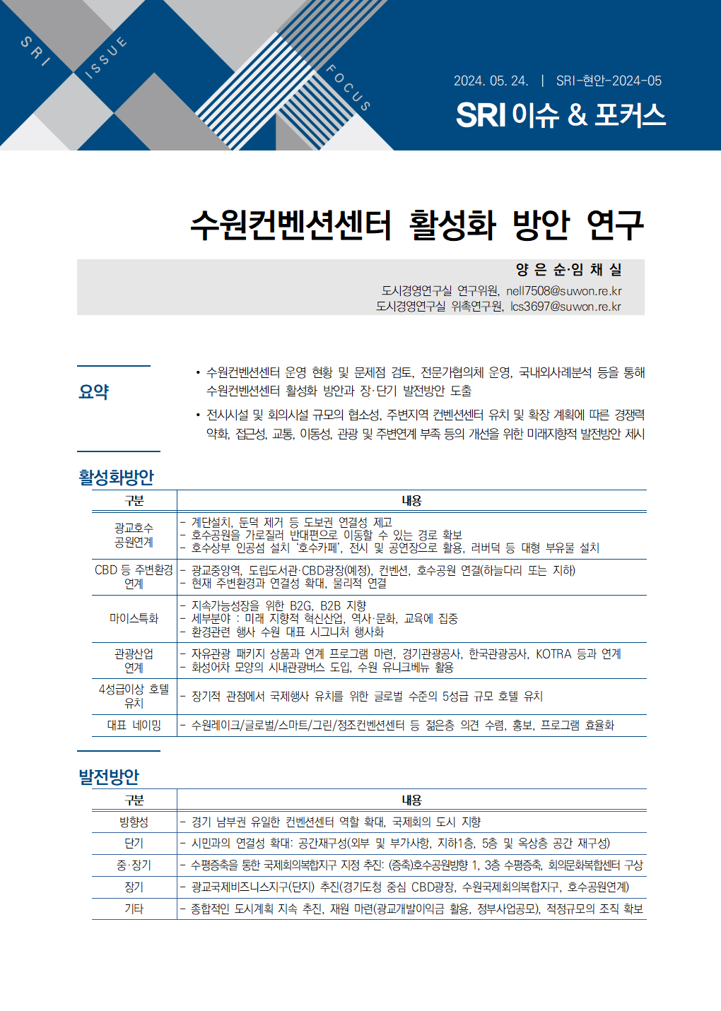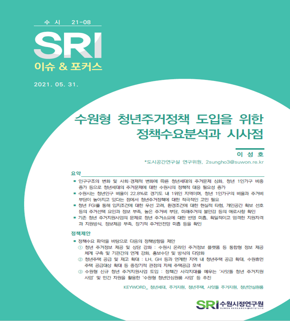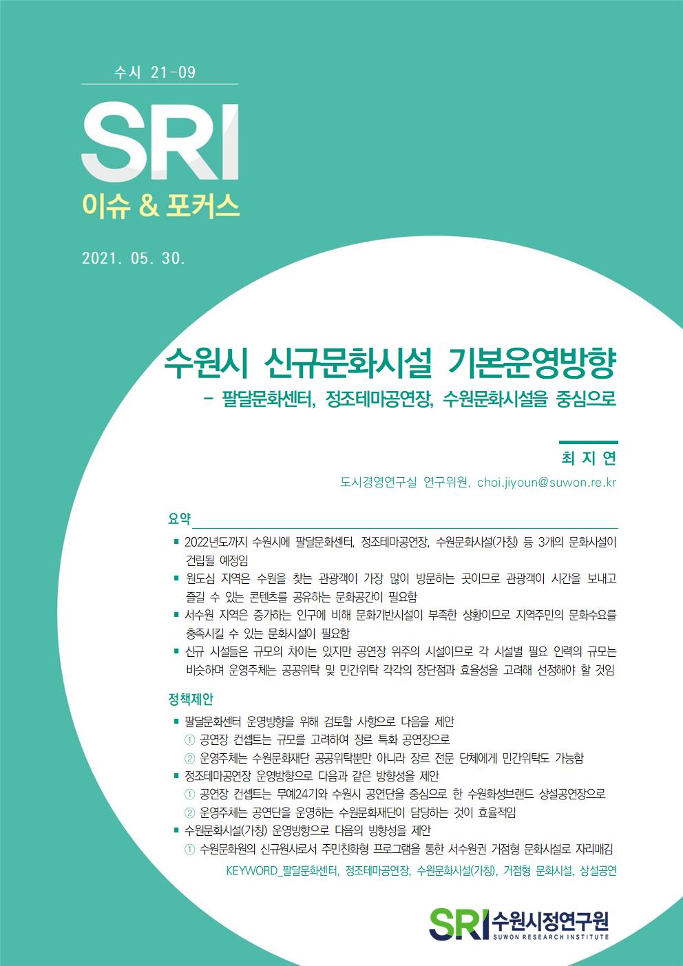 연구보고서 이슈&포커스 총 4건의 게시물이 있습니다. 이슈&포커스 카테고리 전체 전략연구 정책연구 현안연구 협업연구 기타 게시물 검색 검색어 필수 행·재정 경제·산업 복지·여성 안전·교통 도시·건축 환경·공원녹지 문화·청년 시민·교육 [현안연구] 수원컨벤션센터 활성화 방안 연구 도시경영연구실양은순 연구위원2024-05-24 조회수 : 559 주요 연구분야 : 문화·청년 바로보기 공개용 현안_수원컨벤션센터 활성화 방안 연구양은순.pdf 다운로드 공개용 현안_수원컨벤션센터 활성화 방안 연구양은순.pdf [현안연구] SRI 이슈&포커스(수시) 2021-09 수원시 신규문화시설 기본운영방향 도시경영연구실최지연 연구위원2021-06-16 조회수 : 799 주요 연구분야 : 문화·청년 바로보기 0616 [이슈앤포커스 수시 21-09] 수원시 신규문화시설 기본운영방향(최지연) 페이지 수정1 (인쇄본).pdf 다운로드 0616 [이슈앤포커스 수시 21-09] 수원시 신규문화시설 기본운영방향(최지연) 페이지 수정1 (인쇄본).pdf [현안연구] SRI 이슈&포커스(수시) 2021-08 수원시 청년주거정책 도입을 위한 정책수요분석과 시사점 도시공간연구실이성호 연구위원2021-06-08 조회수 : 818 주요 연구분야 : 문화·청년 바로보기 0608 [이슈앤포커스 수시 21-08] 수원형 청년주거정책 도입(이성호)1면 보기 완전최종.pdf 다운로드 0608 [이슈앤포커스 수시 21-08] 수원형 청년주거정책 도입(이성호)1면 보기 완전최종.pdf [현안연구] SRI정책리포트(수시) 2021-03 다문화 글로벌방송 지원 수원시 적용가능성 검토 도시경영연구실이영안 연구위원2021-03-15 조회수 : 743 주요 연구분야 : 문화·청년 바로보기 0402 [수시 21-03] 다문화 글로벌방송 지원 수원시 적용가능성 검토 (최종, 이영안).pdf 다운로드 0402 [수시 21-03] 다문화 글로벌방송 지원 수원시 적용가능성 검토 (최종, 이영안).pdf 전체목록