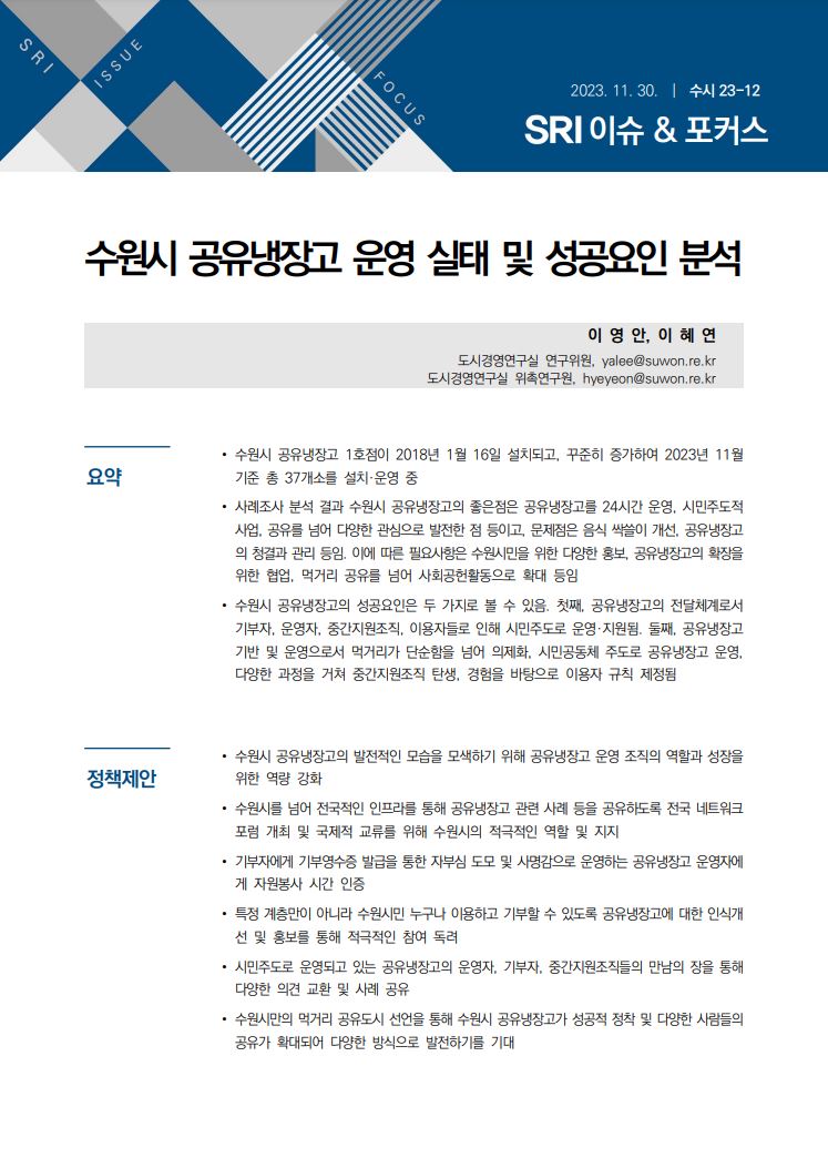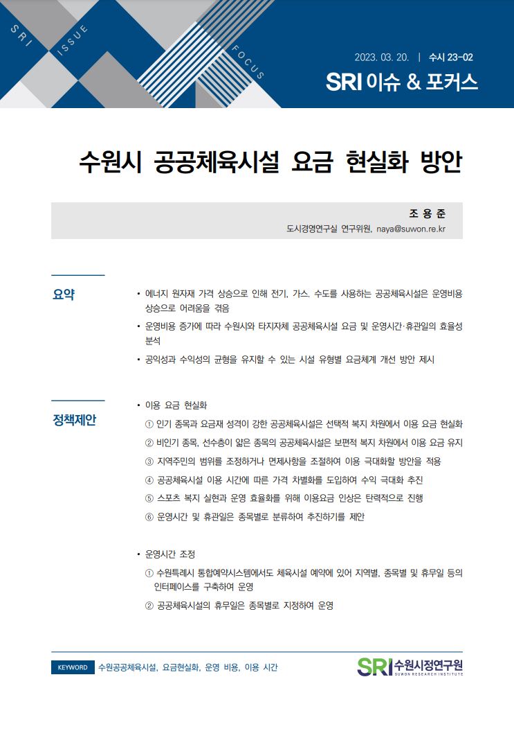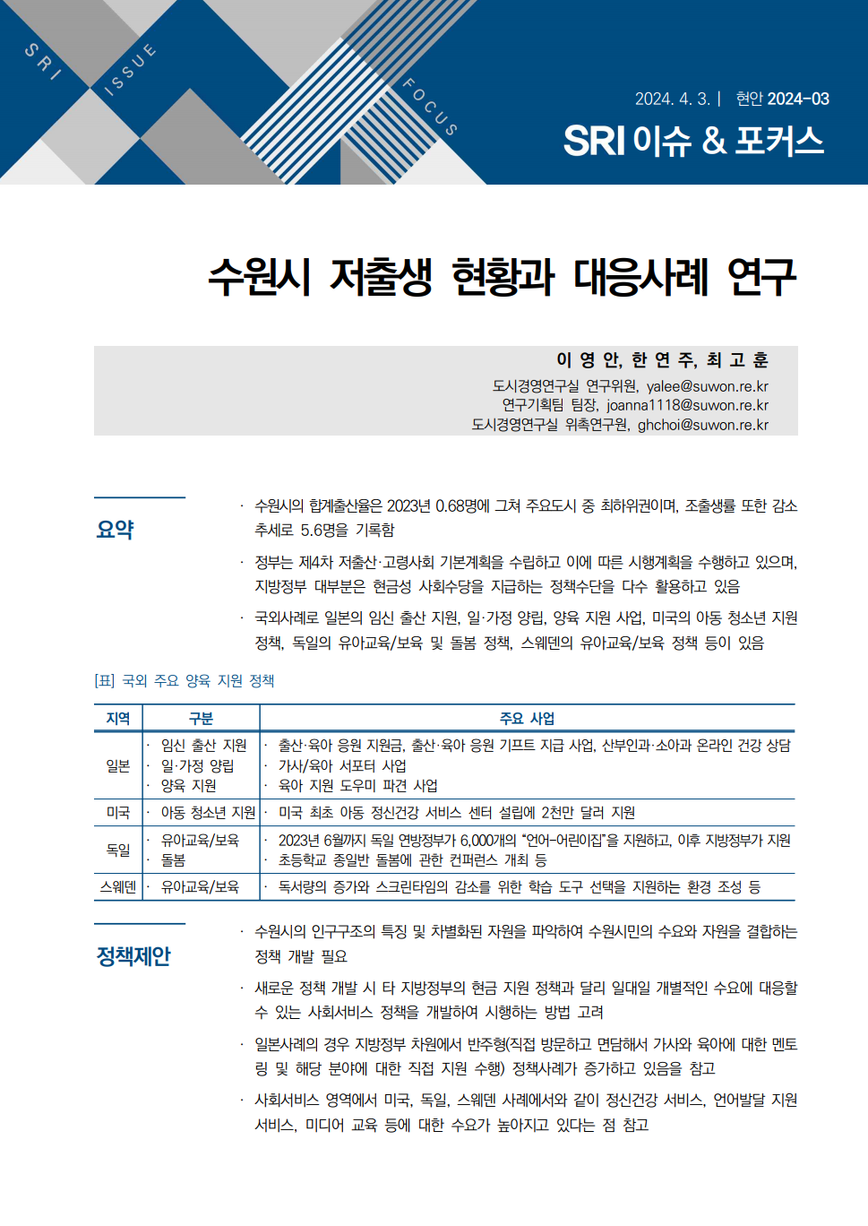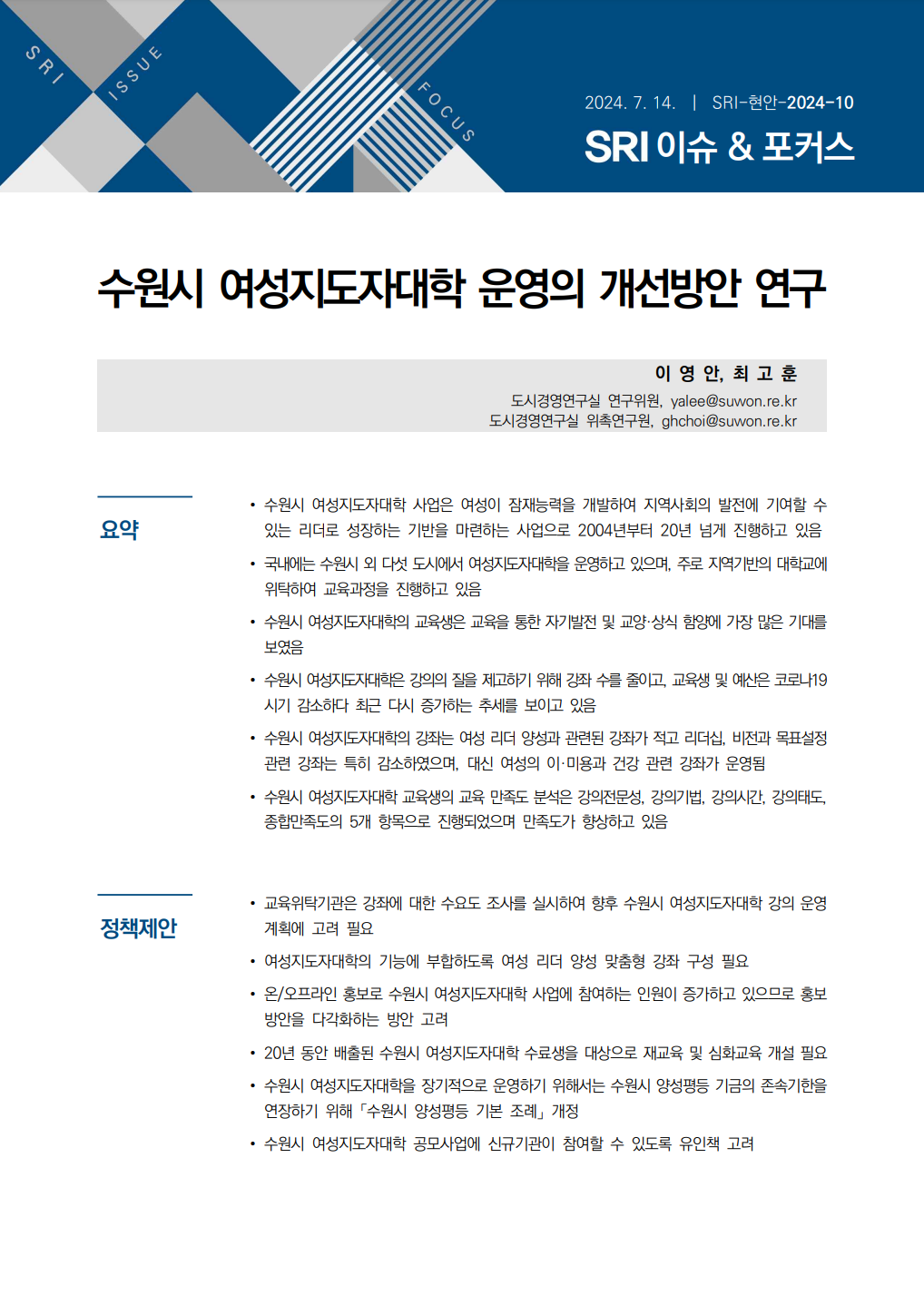 연구보고서 이슈&포커스 총 14건의 게시물이 있습니다. 이슈&포커스 카테고리 전체 전략연구 정책연구 현안연구 협업연구 기타 게시물 검색 검색어 필수 행·재정 경제·산업 복지·여성 안전·교통 도시·건축 환경·공원녹지 문화·청년 시민·교육 [현안연구] 수원시 여성지도자대학 운영의 개선방안 연구 도시경영연구실이영안 연구위원2024-07-14 조회수 : 535 주요 연구분야 : 복지·여성 바로보기 인쇄 수원시 여성지도자대학 운영의 개선방안 연구_240830.pdf 다운로드 인쇄 수원시 여성지도자대학 운영의 개선방안 연구_240830.pdf [현안연구] 수원시 저출생 현황과 대응사례 연구 도시경영연구실이영안 연구위원2024-04-03 조회수 : 581 주요 연구분야 : 복지·여성 바로보기 인쇄보고서 수원시 저출생 현황과 대응사례 연구_이영안.pdf 다운로드 인쇄보고서 수원시 저출생 현황과 대응사례 연구_이영안.pdf [현안연구] 수원시 공유냉장고 운영 실태 및 성공요인 분석 도시경영연구실이영안 연구위원2023-11-30 조회수 : 529 주요 연구분야 : 복지·여성 바로보기 1. 수원시 공유냉장고 운영 실태 및 성공요인 분석.pdf 다운로드 1. 수원시 공유냉장고 운영 실태 및 성공요인 분석.pdf [현안연구] 프리랜서 경력단절 여성의 경력 인증 플랫폼 구상 도시경영연구실이영안 연구위원2023-05-31 조회수 : 596 주요 연구분야 : 복지·여성 바로보기 1. 프리랜서 경력단절 여성의 경력 인증 플랫폼 구상.pdf 다운로드 1. 프리랜서 경력단절 여성의 경력 인증 플랫폼 구상.pdf [현안연구] 수원시 공공체육시설 요금 현실화 방안 도시경영연구실조용준 연구위원2023-03-20 조회수 : 743 주요 연구분야 : 복지·여성 바로보기 수원시 공공체육시설 요금 현실화 방안_2(230410)_ 최종본.pdf 다운로드 수원시 공공체육시설 요금 현실화 방안_2(230410)_ 최종본.pdf [현안연구] SRI 이슈&포커스 (현안 22-07) 고향사랑기부제도 활성화 방안 도시경영연구실조용준 연구위원2022-10-31 조회수 : 694 주요 연구분야 : 복지·여성 바로보기 [현안 22-07] 고향사랑기부제도 활성화 방안(조용준).pdf 다운로드 [현안 22-07] 고향사랑기부제도 활성화 방안(조용준).pdf [현안연구] SRI 이슈&포커스 (현안22-06) 수원'무장애 관광도시'지정을 위한 관광약자 특화 콘텐츠 구상 도시경영연구실송화성 연구위원2022-06-30 조회수 : 763 주요 연구분야 : 복지·여성 바로보기 [현안 22-06] 수원 ‘무장애 관광도시’지정을 위한 관광약자 특화 콘텐츠 구상(송화성).pdf 다운로드 [현안 22-06] 수원 ‘무장애 관광도시’지정을 위한 관광약자 특화 콘텐츠 구상(송화성).pdf [현안연구] SRI 이슈&포커스 (현안22-02) 수원시 공공도서관 현황 조사 및 발전 방향 연구 도시경영연구실안남연 초빙연구위원2022-04-18 조회수 : 745 주요 연구분야 : 복지·여성 바로보기 수원시공공도서관현황조사및발전방향연구(안남연)_최종.pdf 다운로드 수원시공공도서관현황조사및발전방향연구(안남연)_최종.pdf [현안연구] SRI 정책 리포트 2020-26 포스트 코로나 대비 복지관 기능 강화 방안 도시경영연구실한연주 연구위원 조회수 : 756 주요 연구분야 : 복지·여성 바로보기 26. 포스트 코로나 대비 복지관 기능 강화 방안 - 한연주 (공개).pdf 다운로드 26. 포스트 코로나 대비 복지관 기능 강화 방안 - 한연주 (공개).pdf [현안연구] SRI 정책리포트 2020-19 사회복지시설의 부가가치세 이슈 검토 : 사회복지관을 중심으로 도시경영연구실한연주 연구위원, 백정미 전문연구위원 조회수 : 780 주요 연구분야 : 복지·여성 바로보기 19. 한연주, 백정미 사회복지시설의 부가가치세 이슈 검토 사회복지관을 중심으로.pdf 다운로드 19. 한연주, 백정미 사회복지시설의 부가가치세 이슈 검토 사회복지관을 중심으로.pdf [현안연구] SRI 정책리포트 2018-16 수원시 여성정책예산 분석 및 특징 도시행정연구실이영안 실장 조회수 : 995 주요 연구분야 : 복지·여성 바로보기 SRI 정책리포트 2018-16 수원시 여성정책예산(이영안) 수정1.pdf 다운로드 SRI 정책리포트 2018-16 수원시 여성정책예산(이영안) 수정1.pdf [현안연구] SRI 정책리포트 2018-10 기혼여성을 위한 여가정책 방안 연구 재정경제연구실송화성 연구위원 조회수 : 1074 주요 연구분야 : 복지·여성 바로보기 SRI 정책리포트 2018-10 기혼여성 여가정책(송화성,이영안).pdf 다운로드 SRI 정책리포트 2018-10 기혼여성 여가정책(송화성,이영안).pdf [현안연구] SRI 정책리포트 2018-04 수원시 문화관광시설 실태조사를 통한 장애인 접근성 개선 방안 안전환경연구실김숙희 연구위원 조회수 : 1135 주요 연구분야 : 복지·여성 바로보기 SRI 정책리포트 2018-04 BRT사업(김숙희).pdf 다운로드 SRI 정책리포트 2018-04 BRT사업(김숙희).pdf [현안연구] SRI 정책리포트 2018-03 수원시 문화관광시설 실태조사를 통한 장애인 접근성 개선 방안 장애물 없는 생활환경 시민연대, 안전환경연구실김남진 사무국장, 김숙희 연구위원 조회수 : 1218 주요 연구분야 : 복지·여성 바로보기 SRI 정책리포트 2018-03 교통약자(김남진,김숙희).pdf 다운로드 SRI 정책리포트 2018-03 교통약자(김남진,김숙희).pdf 전체목록