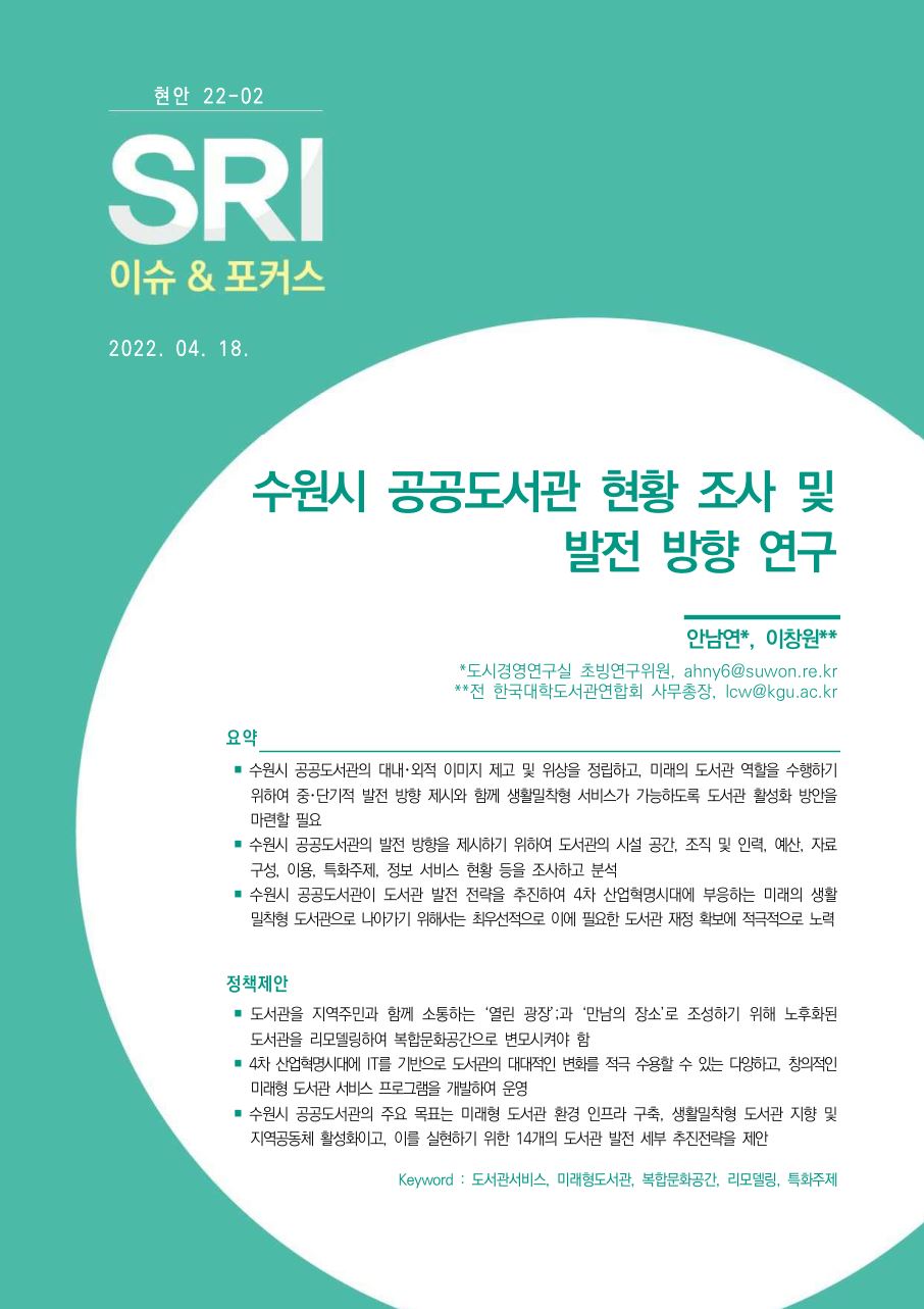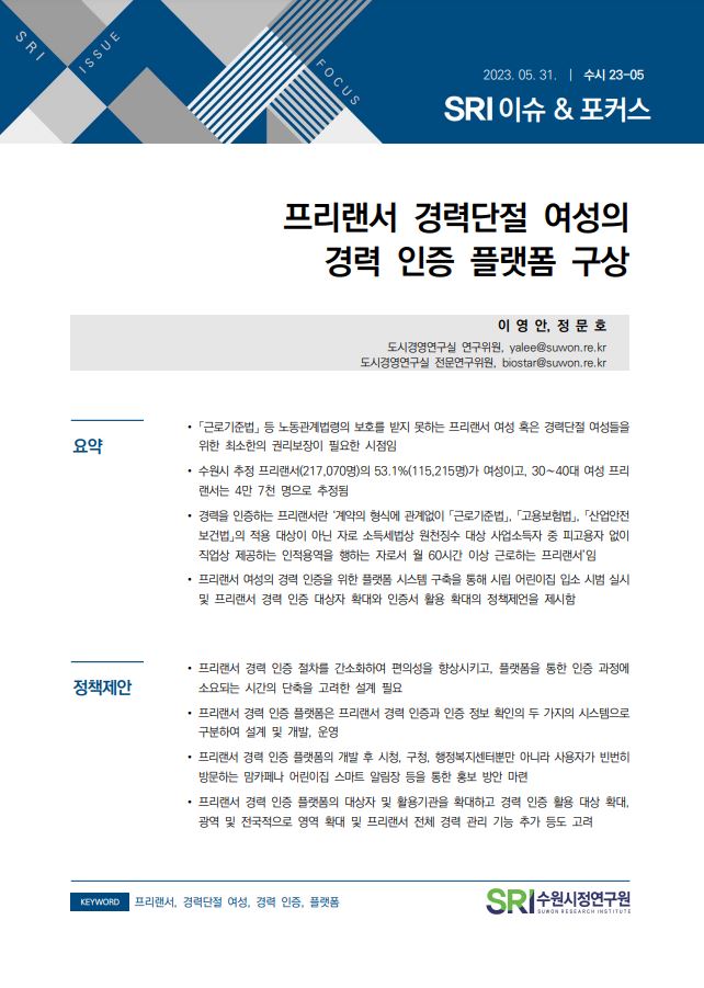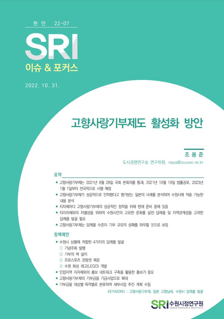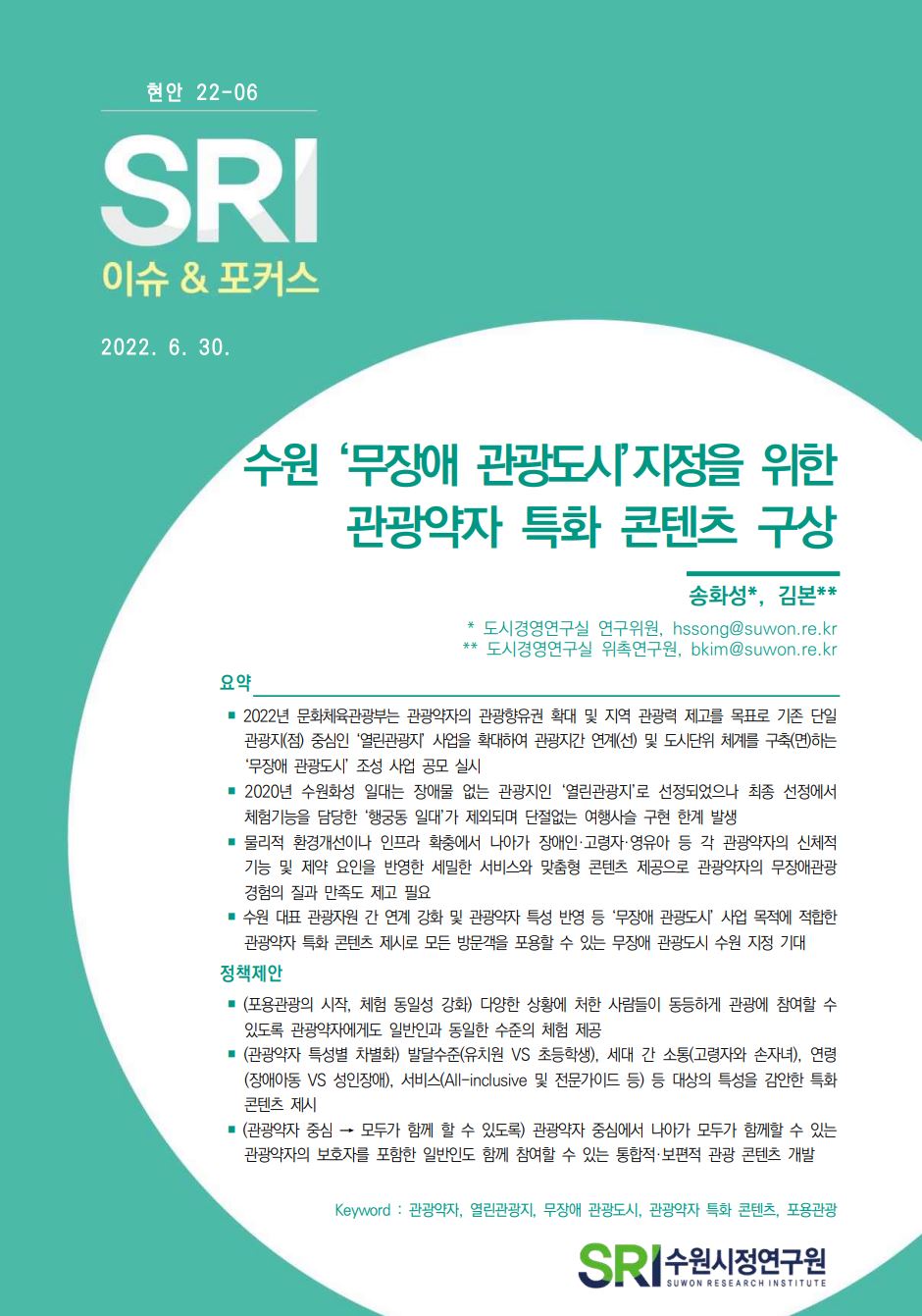 연구보고서 이슈&포커스 총 14건의 게시물이 있습니다. 이슈&포커스 카테고리 전체 전략연구 정책연구 현안연구 협업연구 기타 게시물 검색 검색어 필수 행·재정 경제·산업 복지·여성 안전·교통 도시·건축 환경·공원녹지 문화·청년 시민·교육 [현안연구] 수원시 여성지도자대학 운영의 개선방안 연구 도시경영연구실이영안 연구위원2024-07-14 조회수 : 535 주요 연구분야 : 복지·여성 바로보기 인쇄 수원시 여성지도자대학 운영의 개선방안 연구_240830.pdf 다운로드 인쇄 수원시 여성지도자대학 운영의 개선방안 연구_240830.pdf [현안연구] 수원시 저출생 현황과 대응사례 연구 도시경영연구실이영안 연구위원2024-04-03 조회수 : 581 주요 연구분야 : 복지·여성 바로보기 인쇄보고서 수원시 저출생 현황과 대응사례 연구_이영안.pdf 다운로드 인쇄보고서 수원시 저출생 현황과 대응사례 연구_이영안.pdf [현안연구] 수원시 공유냉장고 운영 실태 및 성공요인 분석 도시경영연구실이영안 연구위원2023-11-30 조회수 : 529 주요 연구분야 : 복지·여성 바로보기 1. 수원시 공유냉장고 운영 실태 및 성공요인 분석.pdf 다운로드 1. 수원시 공유냉장고 운영 실태 및 성공요인 분석.pdf [현안연구] 프리랜서 경력단절 여성의 경력 인증 플랫폼 구상 도시경영연구실이영안 연구위원2023-05-31 조회수 : 596 주요 연구분야 : 복지·여성 바로보기 1. 프리랜서 경력단절 여성의 경력 인증 플랫폼 구상.pdf 다운로드 1. 프리랜서 경력단절 여성의 경력 인증 플랫폼 구상.pdf [현안연구] 수원시 공공체육시설 요금 현실화 방안 도시경영연구실조용준 연구위원2023-03-20 조회수 : 743 주요 연구분야 : 복지·여성 바로보기 수원시 공공체육시설 요금 현실화 방안_2(230410)_ 최종본.pdf 다운로드 수원시 공공체육시설 요금 현실화 방안_2(230410)_ 최종본.pdf [현안연구] SRI 이슈&포커스 (현안 22-07) 고향사랑기부제도 활성화 방안 도시경영연구실조용준 연구위원2022-10-31 조회수 : 694 주요 연구분야 : 복지·여성 바로보기 [현안 22-07] 고향사랑기부제도 활성화 방안(조용준).pdf 다운로드 [현안 22-07] 고향사랑기부제도 활성화 방안(조용준).pdf [현안연구] SRI 이슈&포커스 (현안22-06) 수원'무장애 관광도시'지정을 위한 관광약자 특화 콘텐츠 구상 도시경영연구실송화성 연구위원2022-06-30 조회수 : 763 주요 연구분야 : 복지·여성 바로보기 [현안 22-06] 수원 ‘무장애 관광도시’지정을 위한 관광약자 특화 콘텐츠 구상(송화성).pdf 다운로드 [현안 22-06] 수원 ‘무장애 관광도시’지정을 위한 관광약자 특화 콘텐츠 구상(송화성).pdf [현안연구] SRI 이슈&포커스 (현안22-02) 수원시 공공도서관 현황 조사 및 발전 방향 연구 도시경영연구실안남연 초빙연구위원2022-04-18 조회수 : 745 주요 연구분야 : 복지·여성 바로보기 수원시공공도서관현황조사및발전방향연구(안남연)_최종.pdf 다운로드 수원시공공도서관현황조사및발전방향연구(안남연)_최종.pdf [현안연구] SRI 정책 리포트 2020-26 포스트 코로나 대비 복지관 기능 강화 방안 도시경영연구실한연주 연구위원 조회수 : 756 주요 연구분야 : 복지·여성 바로보기 26. 포스트 코로나 대비 복지관 기능 강화 방안 - 한연주 (공개).pdf 다운로드 26. 포스트 코로나 대비 복지관 기능 강화 방안 - 한연주 (공개).pdf [현안연구] SRI 정책리포트 2020-19 사회복지시설의 부가가치세 이슈 검토 : 사회복지관을 중심으로 도시경영연구실한연주 연구위원, 백정미 전문연구위원 조회수 : 780 주요 연구분야 : 복지·여성 바로보기 19. 한연주, 백정미 사회복지시설의 부가가치세 이슈 검토 사회복지관을 중심으로.pdf 다운로드 19. 한연주, 백정미 사회복지시설의 부가가치세 이슈 검토 사회복지관을 중심으로.pdf [현안연구] SRI 정책리포트 2018-16 수원시 여성정책예산 분석 및 특징 도시행정연구실이영안 실장 조회수 : 995 주요 연구분야 : 복지·여성 바로보기 SRI 정책리포트 2018-16 수원시 여성정책예산(이영안) 수정1.pdf 다운로드 SRI 정책리포트 2018-16 수원시 여성정책예산(이영안) 수정1.pdf [현안연구] SRI 정책리포트 2018-10 기혼여성을 위한 여가정책 방안 연구 재정경제연구실송화성 연구위원 조회수 : 1074 주요 연구분야 : 복지·여성 바로보기 SRI 정책리포트 2018-10 기혼여성 여가정책(송화성,이영안).pdf 다운로드 SRI 정책리포트 2018-10 기혼여성 여가정책(송화성,이영안).pdf [현안연구] SRI 정책리포트 2018-04 수원시 문화관광시설 실태조사를 통한 장애인 접근성 개선 방안 안전환경연구실김숙희 연구위원 조회수 : 1135 주요 연구분야 : 복지·여성 바로보기 SRI 정책리포트 2018-04 BRT사업(김숙희).pdf 다운로드 SRI 정책리포트 2018-04 BRT사업(김숙희).pdf [현안연구] SRI 정책리포트 2018-03 수원시 문화관광시설 실태조사를 통한 장애인 접근성 개선 방안 장애물 없는 생활환경 시민연대, 안전환경연구실김남진 사무국장, 김숙희 연구위원 조회수 : 1218 주요 연구분야 : 복지·여성 바로보기 SRI 정책리포트 2018-03 교통약자(김남진,김숙희).pdf 다운로드 SRI 정책리포트 2018-03 교통약자(김남진,김숙희).pdf 전체목록