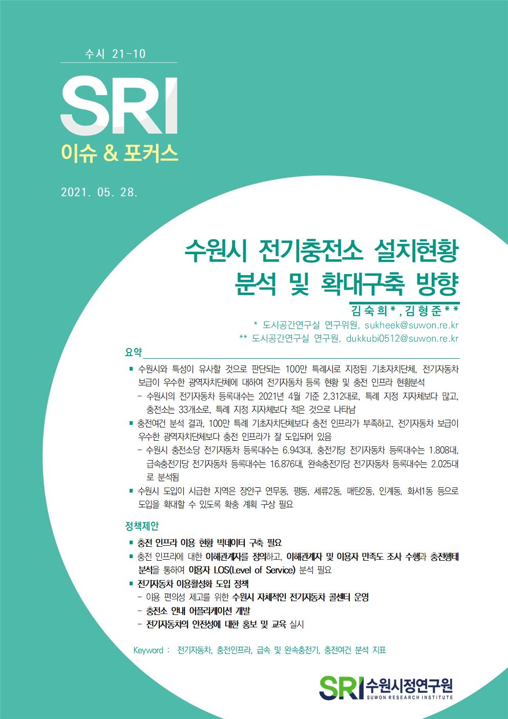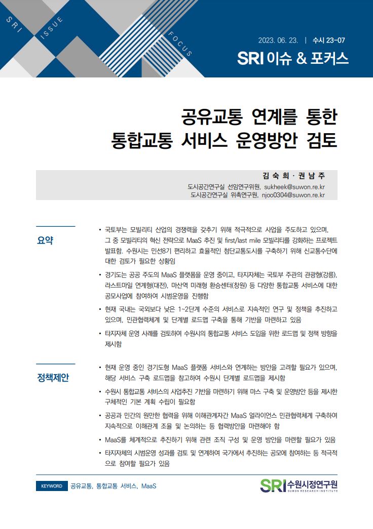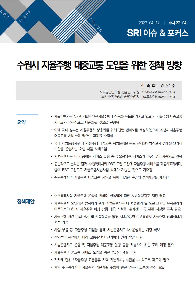 연구보고서 이슈&포커스 총 10건의 게시물이 있습니다. 이슈&포커스 카테고리 전체 전략연구 정책연구 현안연구 협업연구 기타 게시물 검색 검색어 필수 행·재정 경제·산업 복지·여성 안전·교통 도시·건축 환경·공원녹지 문화·청년 시민·교육 [현안연구] 글로벌 경쟁력 제고를 위한 수원 경제자유구역 첨단교통체계 도입방향 데이터분석센터김도훈2026-12-31 조회수 : 106 주요 연구분야 : 안전·교통 바로보기 5. 글로벌 경쟁력 제고를 위한 수원 경제자유구역 첨단교통체계 도입방향.pdf 다운로드 5. 글로벌 경쟁력 제고를 위한 수원 경제자유구역 첨단교통체계 도입방향.pdf [현안연구] 수원시 버스 운수종사자 인력수급 현황 분석 및 정책제안 도시공간연구실김숙희2025-06-20 조회수 : 309 주요 연구분야 : 안전·교통 바로보기 수원시 버스 운수종사자인력수급 현황 분석 및 정책제안.pdf 다운로드 수원시 버스 운수종사자인력수급 현황 분석 및 정책제안.pdf [현안연구] 수원화성 미니버스 최적 운영 노선 개발 도시공간연구실김숙희2025-06-06 조회수 : 276 주요 연구분야 : 안전·교통 바로보기 수원화성 미니버스 최적운영 노선 개발.pdf 다운로드 수원화성 미니버스 최적운영 노선 개발.pdf [현안연구] 수원시 보행자전용도로 설치 후보지 선정 연구 도시공간연구실김숙희 선임연구위원2024-10-30 조회수 : 454 주요 연구분야 : 안전·교통 바로보기 홈페이지공개현안수원시 보행자 전용도로 후보지 선정 연구_SRI김숙희.pdf 다운로드 홈페이지공개현안수원시 보행자 전용도로 후보지 선정 연구_SRI김숙희.pdf [현안연구] 동탄도시철도 수원구간 교통성 검토 데이터분석센터김도훈 연구위원2024-08-16 조회수 : 398 주요 연구분야 : 안전·교통 바로보기 홈페이지공개 현안보고서동탄도시철도_김도훈.pdf 다운로드 홈페이지공개 현안보고서동탄도시철도_김도훈.pdf [현안연구] 공유교통 연계를 통한 통합교통 서비스 운영방안 검토 도시공간연구실김숙희 선임연구위원2023-06-23 조회수 : 628 주요 연구분야 : 안전·교통 바로보기 [수시] 공유교통 연계를 통한 통합교통 서비스 운영방안 검토_FF.pdf 다운로드 [수시] 공유교통 연계를 통한 통합교통 서비스 운영방안 검토_FF.pdf [현안연구] 수원시 자율주행 대중교통 도입을 위한 정책 방향 도시공간연구실김숙희 선임연구위원2023-04-12 조회수 : 727 주요 연구분야 : 안전·교통 바로보기 (수시)수원시 자율주행 대중교통 도입을 위한 정책 방향_F(20페이지).pdf 다운로드 (수시)수원시 자율주행 대중교통 도입을 위한 정책 방향_F(20페이지).pdf [현안연구] 수원시 재난안전관리체계 개선방향 도시공간연구실최석환 연구위원2023-01-07 조회수 : 851 주요 연구분야 : 안전·교통 바로보기 [수시연구] 최종보고서_수원시 재난안전관리체계 개선방향_재난상황팀 검토(최종).pdf 다운로드 [수시연구] 최종보고서_수원시 재난안전관리체계 개선방향_재난상황팀 검토(최종).pdf [현안연구] SRI 이슈&포커스(수시) 2021-10 수원시 전기충전소 설치현황 분석 및 확대구축 방향 도시공간연구실김숙희 선임연구위원2021-06-21 조회수 : 826 주요 연구분야 : 안전·교통 바로보기 0618 [이슈앤포커스 수시 21-10] 수원시 전기충전소 설치현황(김숙희, 김형준) 페이지 수정1.pdf 다운로드 0618 [이슈앤포커스 수시 21-10] 수원시 전기충전소 설치현황(김숙희, 김형준) 페이지 수정1.pdf [현안연구] SRI 정책리포트 2019-14 오산~용인 고속도로 민간제안 사업에 따른 수원시 대응방안 도시공간연구실김숙희 연구위원, 김은영 연구위원 조회수 : 644 주요 연구분야 : 안전·교통 바로보기 14.김숙희_현안수시_오산~용인 고속도로 민간제안 사업에 따른 수원시 대응방안.pdf 다운로드 14.김숙희_현안수시_오산~용인 고속도로 민간제안 사업에 따른 수원시 대응방안.pdf 전체목록