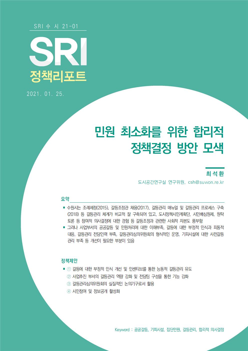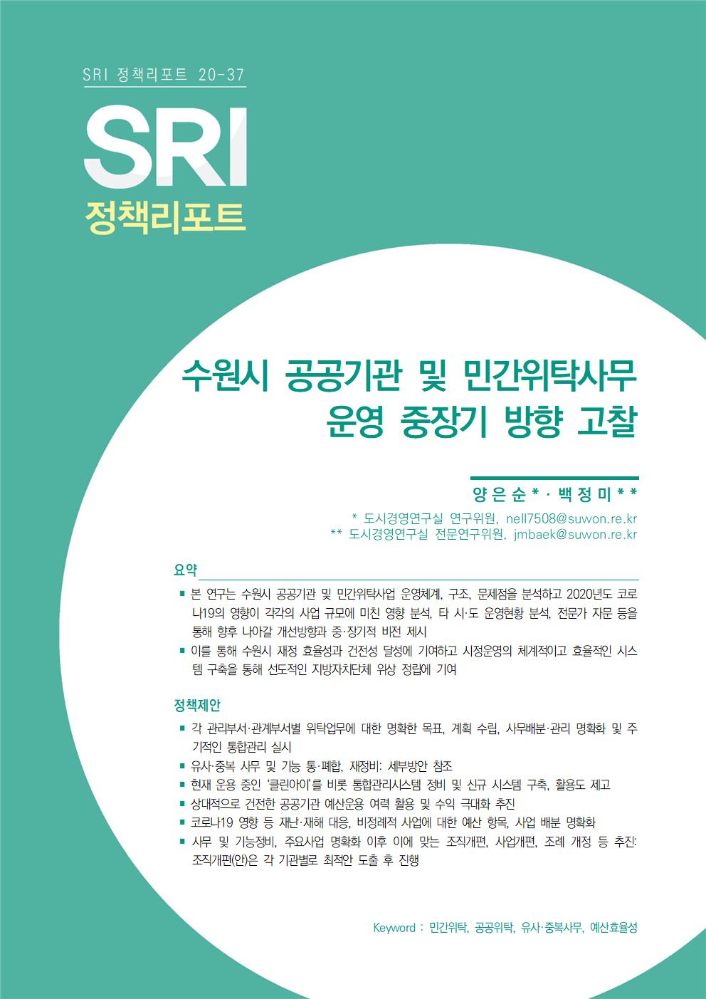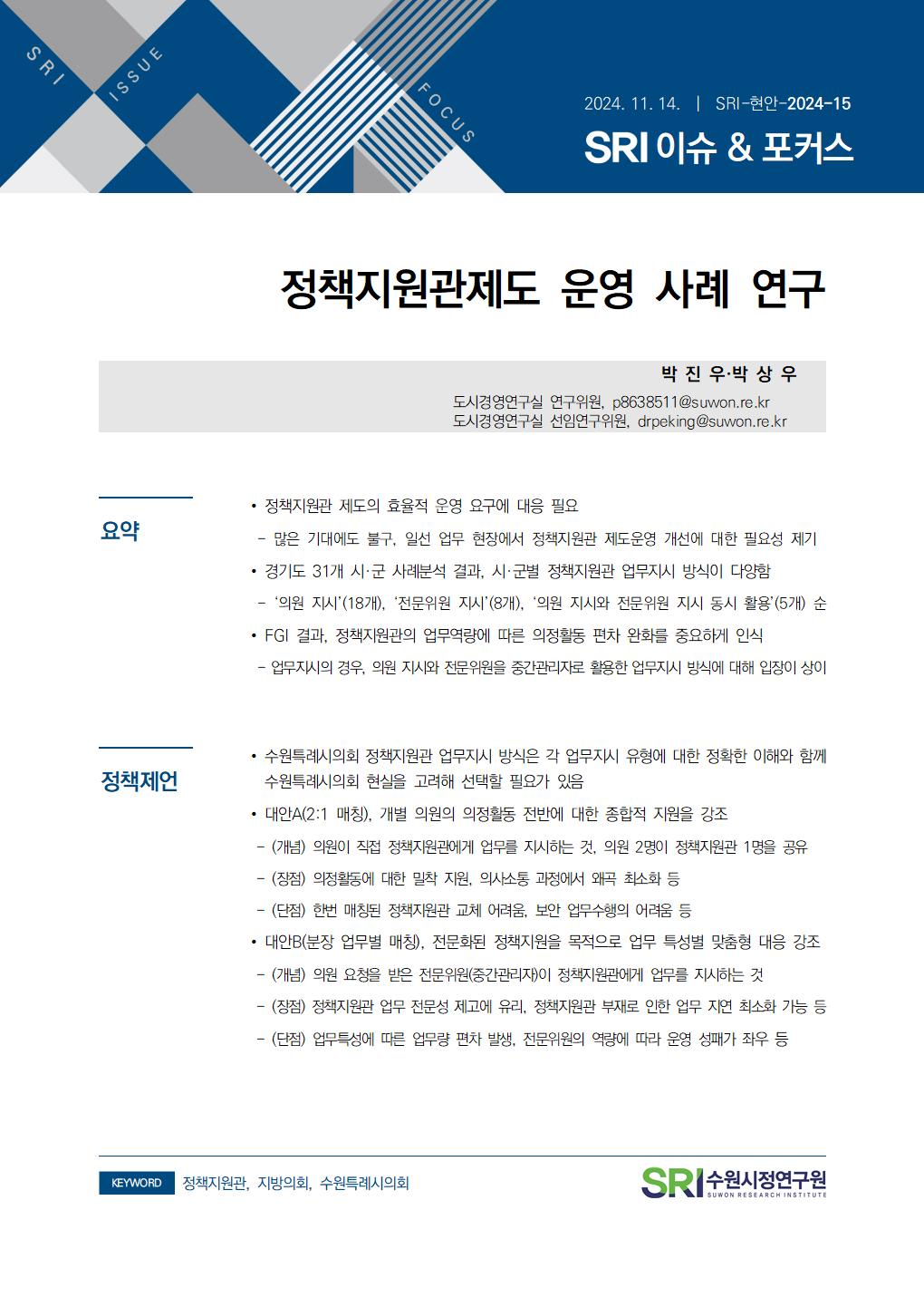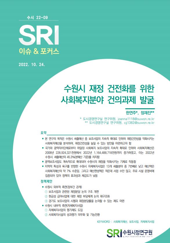 연구보고서 이슈&포커스 총 21건의 게시물이 있습니다. 이슈&포커스 카테고리 전체 전략연구 정책연구 현안연구 협업연구 기타 게시물 검색 검색어 필수 행·재정 경제·산업 복지·여성 안전·교통 도시·건축 환경·공원녹지 문화·청년 시민·교육 [현안연구] 경기도 구청사 활용 방안 도시경영연구실양은순2025-10-24 조회수 : 47 주요 연구분야 : 행·재정 바로보기 현안보고서_경기도 구청사 활용 방안_인쇄용20160119.pdf 다운로드 현안보고서_경기도 구청사 활용 방안_인쇄용20160119.pdf [현안연구] 마을만들기 주민제안 공모사업 선정 평가지표 개선 연구 도시경영연구실황소하2025-06-20 조회수 : 200 주요 연구분야 : 행·재정 바로보기 보고서 마을만들기 주민제안 공모사업 선정 평가지표 개선 연구.pdf 다운로드 보고서 마을만들기 주민제안 공모사업 선정 평가지표 개선 연구.pdf [현안연구] 수원시 시민배심법정 운영 활성화 방안 도시경영연구실강태욱2025-04-30 조회수 : 324 주요 연구분야 : 행·재정 바로보기 홈페이지 수원시 시민배심법 정운영 활성화 방안.pdf 다운로드 홈페이지 수원시 시민배심법 정운영 활성화 방안.pdf [기타] 2024 수원서베이 한눈에 보는 수원 데이터분석센터박민진2025-05-01 조회수 : 472 주요 연구분야 : 행·재정 바로보기 1. 2024수원서베이 한눈에보는수원 표지내지 합본 220x290 _250430 최종_ 낱장보기용 e북용.pdf 다운로드 1. 2024수원서베이 한눈에보는수원 표지내지 합본 220x290 _250430 최종_ 낱장보기용 e북용.pdf [현안연구] 정책지원관제도 운영 사례 연구 도시경영연구실박진우 연구위원2024-11-14 조회수 : 456 주요 연구분야 : 행·재정 바로보기 홈페이지용 정책지원관제도 운영 사례 연구_SRI박진우.pdf 다운로드 홈페이지용 정책지원관제도 운영 사례 연구_SRI박진우.pdf [현안연구] 수원시 여권사무의 수행실태와 운영 개선방안 도시경영연구실황소하 연구위원2024-05-15 조회수 : 309 주요 연구분야 : 행·재정 바로보기 공개용_현안수원시 여권사무의 수행실태와 운영 개선방안_최종보고서.pdf 다운로드 공개용_현안수원시 여권사무의 수행실태와 운영 개선방안_최종보고서.pdf [현안연구] SRI 이슈&포커스 (수시 22-09) 수원시 재정 건전화를 위한 사회복지분야 건의과제 발굴 도시경영연구실한연주 연구위원2022-10-24 조회수 : 705 주요 연구분야 : 행·재정 바로보기 [수시 22-09] 수원시 재정 건전화를 위한 사회복지분야 건의과제 발굴(한연주).pdf 다운로드 [수시 22-09] 수원시 재정 건전화를 위한 사회복지분야 건의과제 발굴(한연주).pdf [현안연구] SRI 이슈&포커스 (현안 22-01) 주민참여예산제도의 실효성 제고방안 도시경영연구실정재진 연구위원2022-03-31 조회수 : 758 주요 연구분야 : 행·재정 바로보기 현안22-01_주민참여예산제도의 실효성 제고방안_최종.pdf 다운로드 현안22-01_주민참여예산제도의 실효성 제고방안_최종.pdf [현안연구] SRI 이슈&포커스(수시) 2021-12 해외 연구기관 벤치마킹 및 협력 방안 연구 도시공간연구실유재윤 초빙연구위원2021-12-01 조회수 : 621 주요 연구분야 : 행·재정 바로보기 1203 [이슈&포커스 수시21-12] 해외연구기관 벤치마킹(유재윤).pdf 다운로드 1203 [이슈&포커스 수시21-12] 해외연구기관 벤치마킹(유재윤).pdf [현안연구] SRI 이슈&포커스(현안) 2021-03 수원시 성희롱·성폭력 사건 처리 절차 및 체계 구축 도시경영연구실이영안 연구위원2021-11-30 조회수 : 618 주요 연구분야 : 행·재정 바로보기 1202 [이슈&포커스 현안21-03] 수원시 성희롱, 성폭력 사건 처리 절차 및 체계 구축(이영안)-최종.pdf1206 [이슈&포커스 현안21-03] 수원시 성희롱, 성폭력 사건 처리 절차 및 체계 구축-별책부록.pdf 다운로드 1202 [이슈&포커스 현안21-03] 수원시 성희롱, 성폭력 사건 처리 절차 및 체계 구축(이영안)-최종.pdf1206 [이슈&포커스 현안21-03] 수원시 성희롱, 성폭력 사건 처리 절차 및 체계 구축-별책부록.pdf [현안연구] SRI 이슈&포커스(수시) 2021-11 수원시 심의이력제도 도입방안 연구기획실정수진 선임연구위원2021-11-08 조회수 : 589 주요 연구분야 : 행·재정 바로보기 1125 [이슈앤포커스 수시 21-11]수원시 심의이력제도 도입방안(정수진)-인쇄용 수정2.pdf 다운로드 1125 [이슈앤포커스 수시 21-11]수원시 심의이력제도 도입방안(정수진)-인쇄용 수정2.pdf [현안연구] SRI정책리포트(수시) 2021-01 민원 최소화를 위한 합리적 정책결정 방안 모색 도시공간연구실최석환 연구위원2021-01-25 조회수 : 657 주요 연구분야 : 행·재정 바로보기 0402 [수시 21-01] 민원 최소화를 위한 합리적 정책결정 방안 모색 (수정본, 최석환).pdf 다운로드 0402 [수시 21-01] 민원 최소화를 위한 합리적 정책결정 방안 모색 (수정본, 최석환).pdf [현안연구] SRI정책리포트 2020-37 공공기관 및 민간위탁사무 중장기 방향 고찰 도시경영연구실양은순 연구위원, 백정미 前전문연구원2021-01-18 조회수 : 726 주요 연구분야 : 행·재정 바로보기 0401 [수시 20-37] 공공기관 및 민간위탁사무 중장기 방향 고찰 (최종, 양은순).pdf 다운로드 0401 [수시 20-37] 공공기관 및 민간위탁사무 중장기 방향 고찰 (최종, 양은순).pdf [현안연구] SRI 정책리포트 2020-29 수원시 협치 기본계획 수립방향 연구 도시공간
