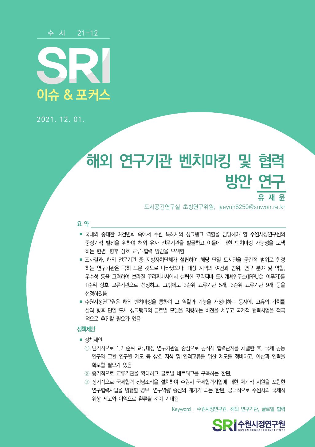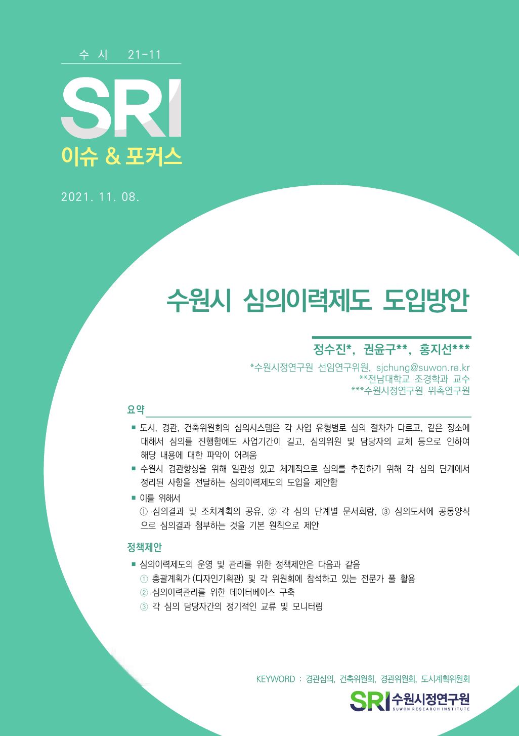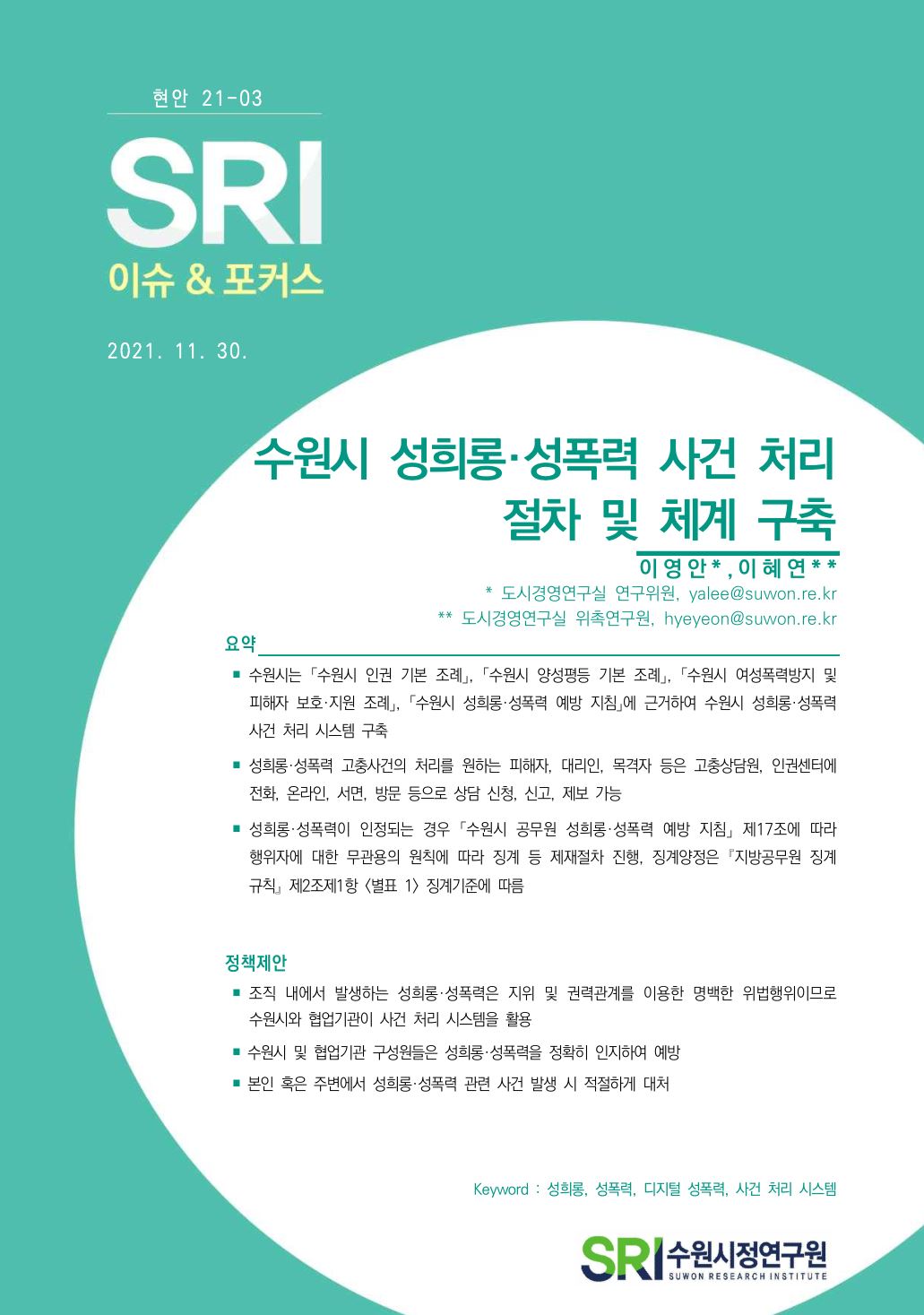 연구보고서 이슈&포커스 총 21건의 게시물이 있습니다. 이슈&포커스 카테고리 전체 전략연구 정책연구 현안연구 협업연구 기타 게시물 검색 검색어 필수 행·재정 경제·산업 복지·여성 안전·교통 도시·건축 환경·공원녹지 문화·청년 시민·교육 [현안연구] 경기도 구청사 활용 방안 도시경영연구실양은순2025-10-24 조회수 : 47 주요 연구분야 : 행·재정 바로보기 현안보고서_경기도 구청사 활용 방안_인쇄용20160119.pdf 다운로드 현안보고서_경기도 구청사 활용 방안_인쇄용20160119.pdf [현안연구] 마을만들기 주민제안 공모사업 선정 평가지표 개선 연구 도시경영연구실황소하2025-06-20 조회수 : 200 주요 연구분야 : 행·재정 바로보기 보고서 마을만들기 주민제안 공모사업 선정 평가지표 개선 연구.pdf 다운로드 보고서 마을만들기 주민제안 공모사업 선정 평가지표 개선 연구.pdf [현안연구] 수원시 시민배심법정 운영 활성화 방안 도시경영연구실강태욱2025-04-30 조회수 : 324 주요 연구분야 : 행·재정 바로보기 홈페이지 수원시 시민배심법 정운영 활성화 방안.pdf 다운로드 홈페이지 수원시 시민배심법 정운영 활성화 방안.pdf [기타] 2024 수원서베이 한눈에 보는 수원 데이터분석센터박민진2025-05-01 조회수 : 472 주요 연구분야 : 행·재정 바로보기 1. 2024수원서베이 한눈에보는수원 표지내지 합본 220x290 _250430 최종_ 낱장보기용 e북용.pdf 다운로드 1. 2024수원서베이 한눈에보는수원 표지내지 합본 220x290 _250430 최종_ 낱장보기용 e북용.pdf [현안연구] 정책지원관제도 운영 사례 연구 도시경영연구실박진우 연구위원2024-11-14 조회수 : 456 주요 연구분야 : 행·재정 바로보기 홈페이지용 정책지원관제도 운영 사례 연구_SRI박진우.pdf 다운로드 홈페이지용 정책지원관제도 운영 사례 연구_SRI박진우.pdf [현안연구] 수원시 여권사무의 수행실태와 운영 개선방안 도시경영연구실황소하 연구위원2024-05-15 조회수 : 309 주요 연구분야 : 행·재정 바로보기 공개용_현안수원시 여권사무의 수행실태와 운영 개선방안_최종보고서.pdf 다운로드 공개용_현안수원시 여권사무의 수행실태와 운영 개선방안_최종보고서.pdf [현안연구] SRI 이슈&포커스 (수시 22-09) 수원시 재정 건전화를 위한 사회복지분야 건의과제 발굴 도시경영연구실한연주 연구위원2022-10-24 조회수 : 705 주요 연구분야 : 행·재정 바로보기 [수시 22-09] 수원시 재정 건전화를 위한 사회복지분야 건의과제 발굴(한연주).pdf 다운로드 [수시 22-09] 수원시 재정 건전화를 위한 사회복지분야 건의과제 발굴(한연주).pdf [현안연구] SRI 이슈&포커스 (현안 22-01) 주민참여예산제도의 실효성 제고방안 도시경영연구실정재진 연구위원2022-03-31 조회수 : 758 주요 연구분야 : 행·재정 바로보기 현안22-01_주민참여예산제도의 실효성 제고방안_최종.pdf 다운로드 현안22-01_주민참여예산제도의 실효성 제고방안_최종.pdf [현안연구] SRI 이슈&포커스(수시) 2021-12 해외 연구기관 벤치마킹 및 협력 방안 연구 도시공간연구실유재윤 초빙연구위원2021-12-01 조회수 : 621 주요 연구분야 : 행·재정 바로보기 1203 [이슈&포커스 수시21-12] 해외연구기관 벤치마킹(유재윤).pdf 다운로드 1203 [이슈&포커스 수시21-12] 해외연구기관 벤치마킹(유재윤).pdf [현안연구] SRI 이슈&포커스(현안) 2021-03 수원시 성희롱·성폭력 사건 처리 절차 및 체계 구축 도시경영연구실이영안 연구위원2021-11-30 조회수 : 618 주요 연구분야 : 행·재정 바로보기 1202 [이슈&포커스 현안21-03] 수원시 성희롱, 성폭력 사건 처리 절차 및 체계 구축(이영안)-최종.pdf1206 [이슈&포커스 현안21-03] 수원시 성희롱, 성폭력 사건 처리 절차 및 체계 구축-별책부록.pdf 다운로드 1202 [이슈&포커스 현안21-03] 수원시 성희롱, 성폭력 사건 처리 절차 및 체계 구축(이영안)-최종.pdf1206 [이슈&포커스 현안21-03] 수원시 성희롱, 성폭력 사건 처리 절차 및 체계 구축-별책부록.pdf [현안연구] SRI 이슈&포커스(수시) 2021-11 수원시 심의이력제도 도입방안 연구기획실정수진 선임연구위원2021-11-08 조회수 : 589 주요 연구분야 : 행·재정 바로보기 1125 [이슈앤포커스 수시 21-11]수원시 심의이력제도 도입방안(정수진)-인쇄용 수정2.pdf 다운로드 1125 [이슈앤포커스 수시 21-11]수원시 심의이력제도 도입방안(정수진)-인쇄용 수정2.pdf [현안연구] SRI정책리포트(수시) 2021-01 민원 최소화를 위한 합리적 정책결정 방안 모색 도시공간연구실최석환 연구위원2021-01-25 조회수 : 657 주요 연구분야 : 행·재정 바로보기 0402 [수시 21-01] 민원 최소화를 위한 합리적 정책결정 방안 모색 (수정본, 최석환).pdf 다운로드 0402 [수시 21-01] 민원 최소화를 위한 합리적 정책결정 방안 모색 (수정본, 최석환).pdf [현안연구] SRI정책리포트 2020-37 공공기관 및 민간위탁사무 중장기 방향 고찰 도시경영연구실양은순 연구위원, 백정미 前전문연구원2021-01-18 조회수 : 726 주요 연구분야 : 행·재정 바로보기 0401 [수시 20-37] 공공기관 및 민간위탁사무 중장기 방향 고찰 (최종, 양은순).pdf 다운로드 0401 [수시 20-37] 공공기관 및 민간위탁사무 중장기 방향 고찰 (최종, 양은순).pdf [현안연구] SRI 정책리포트 2020-29 수원시 협치 기본계획 수립방향 연구 도시공간