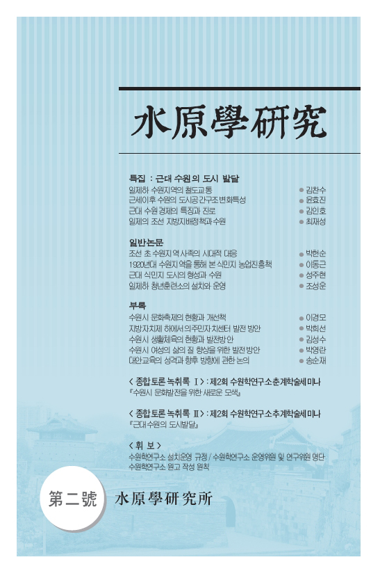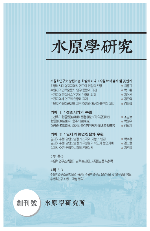 SRI Brief 학술지 「수원학연구」 수원이야기 탄소중립이야기 투고안내 투고신청서 관련지침 학술지 수원학연구 총 22건의 게시물이 있습니다. 게시물 검색 검색어 필수 수원학연구 제2호(2017) 조회수 : 2113 바로보기 수원학연구+제2호.pdf 다운로드 수원학연구+제2호.pdf 수원학연구 제1호 조회수 : 1776 바로보기 수원학연구+제1호.pdf 다운로드 수원학연구+제1호.pdf 처음 1페이지 2페이지 열린3페이지