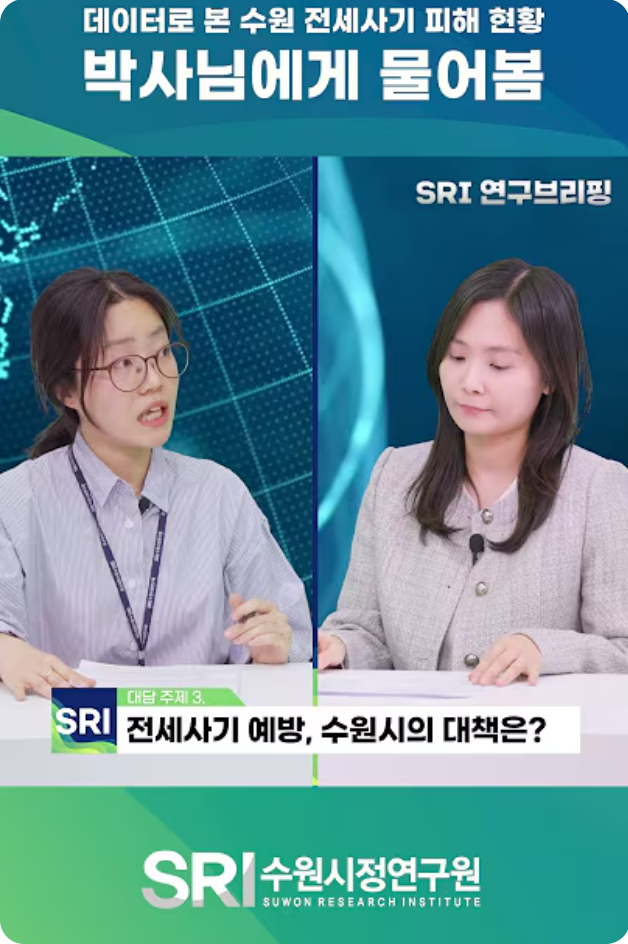 카드뉴스 영상보고서 수원 전세사기 팩트체크 페이지 정보 작성자 : suwon | 조회수 : 8 | 작성일 : 26-03-30 관련링크 https://youtube.com/embed/WAYLX3r1iIE?si=scpKRfzQf18EYhoC 4회 연결 본문 박사님이 알려주는 수원 전세사기 실태 수원시정연구원 김진언 박사님이 분석한 전세사기 데이터 발표. 피해 주택의 96%가 신축 건물에서 발생한 이유 이전글수원 출퇴근길이 바뀐다 다음글전기요금 월 12% 아끼는 비결 목록